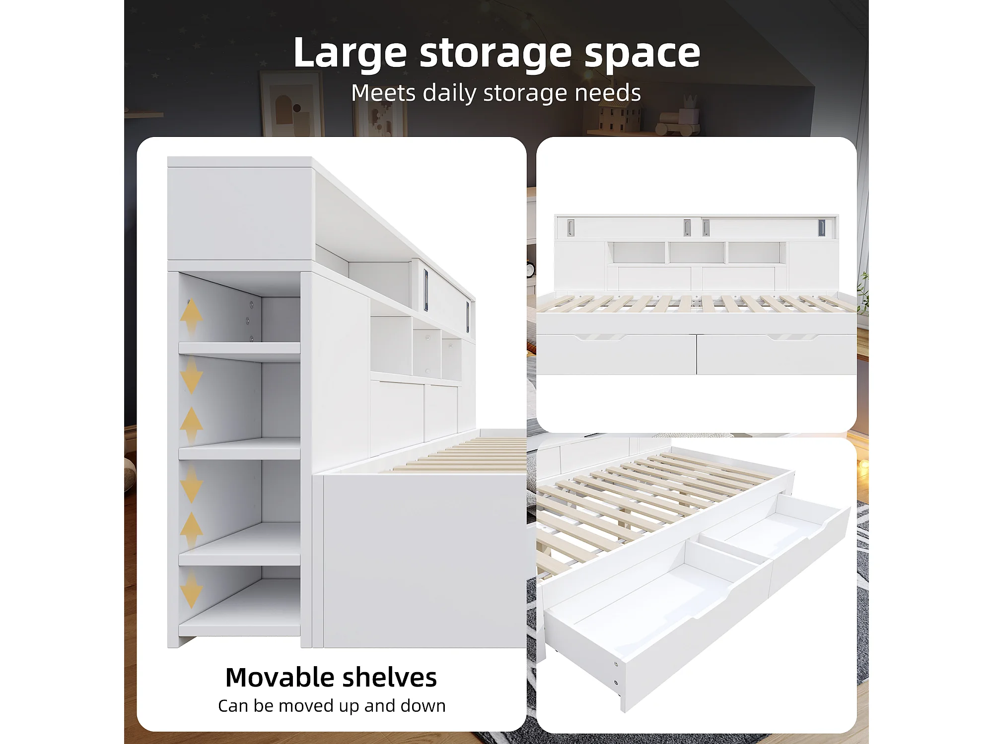 Canapé-lit simple pour enfant - 90 x 190 cm - avec avec tiroirs + étagère et armoire de rangement -MDF - blanc