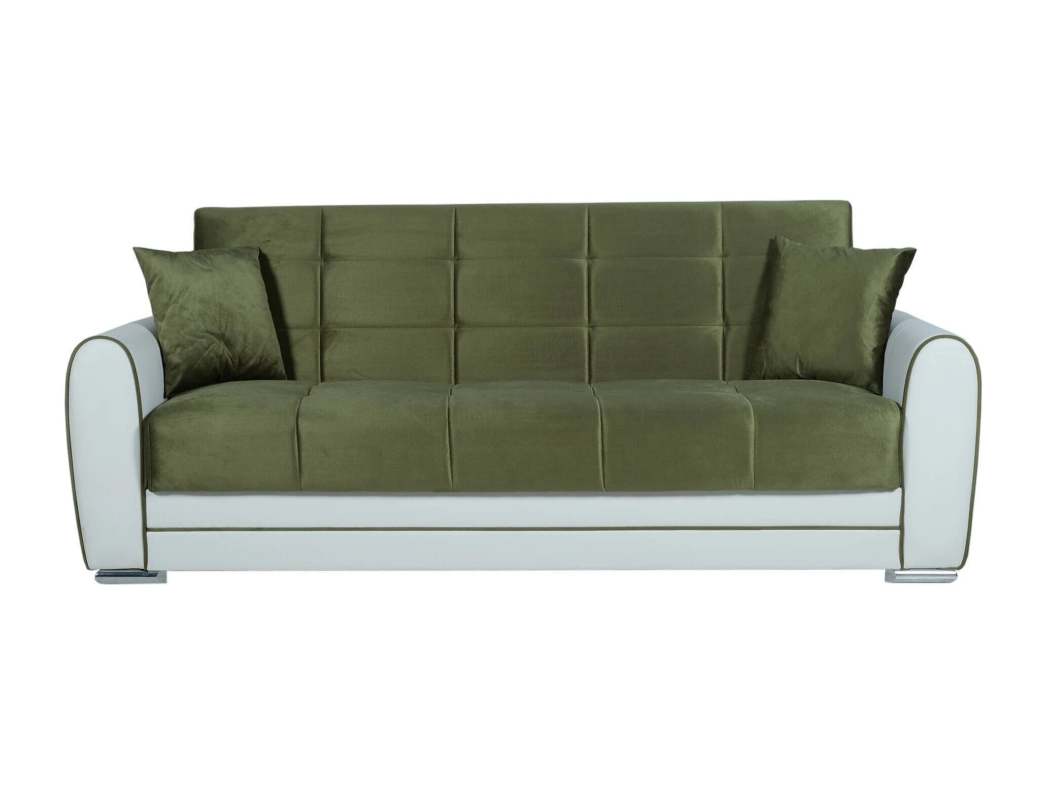 Canapé Luis, Canapé conteneur 3 places en éco-cuir et tissu, Canapé de salon en tissu rembourré avec ouverture clic-clac, 220x84h91 cm, Blanc et Vert