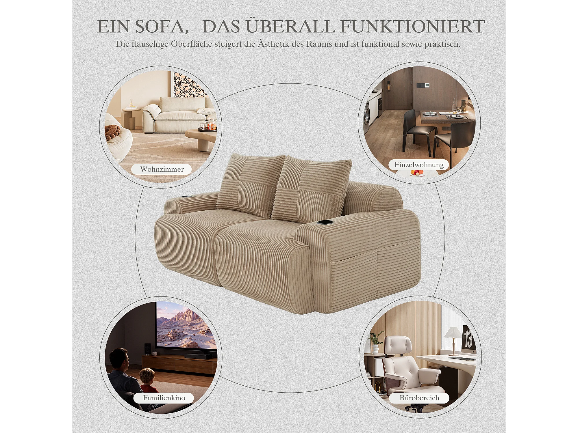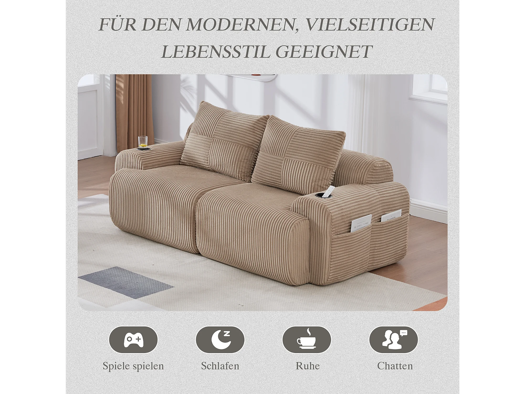 Canapé moderne 2 places - 200 x 99 x 80 cm - avec porte-gobelets + poche de rangement - velours - kaki