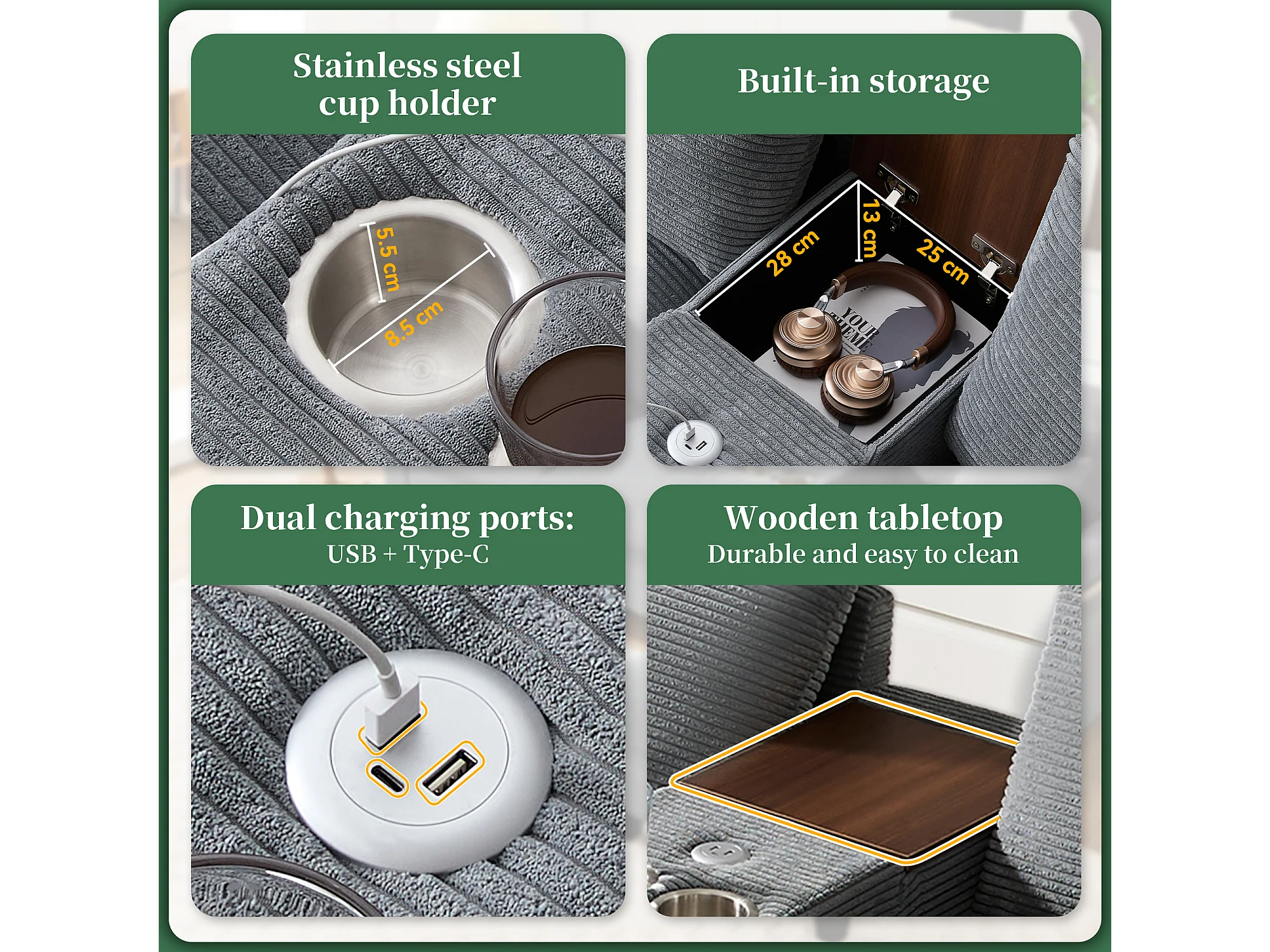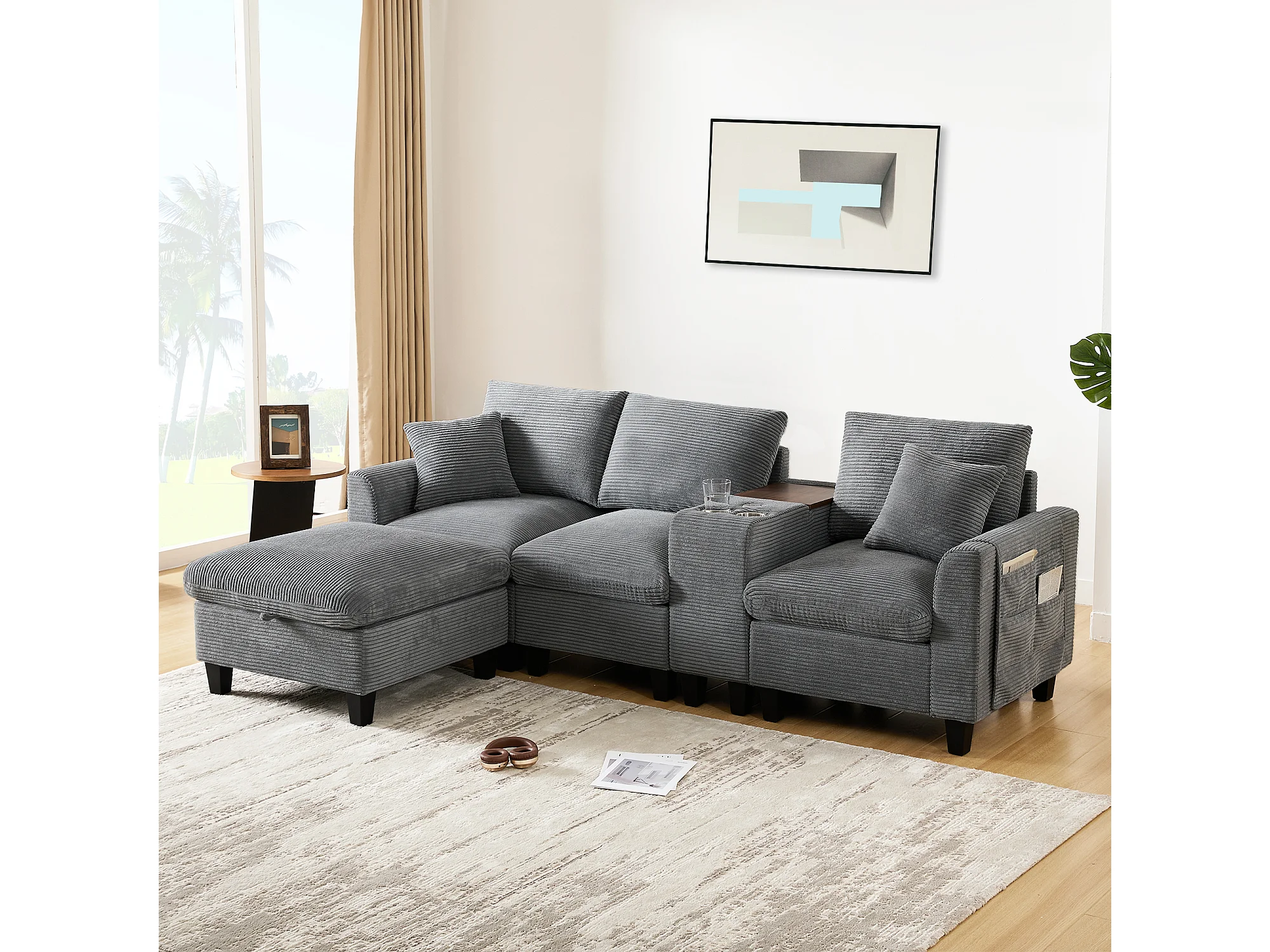 Canapé moderne 4 places avec repose-pieds de rangement + 2 porte-gobelets + USB - 229 x 149.5 x 83 cm - Velours - gris