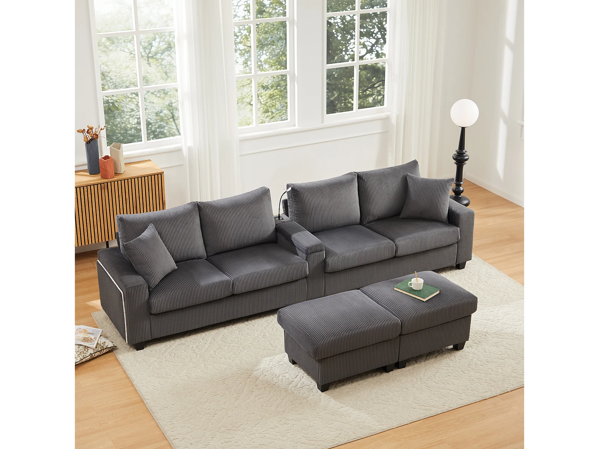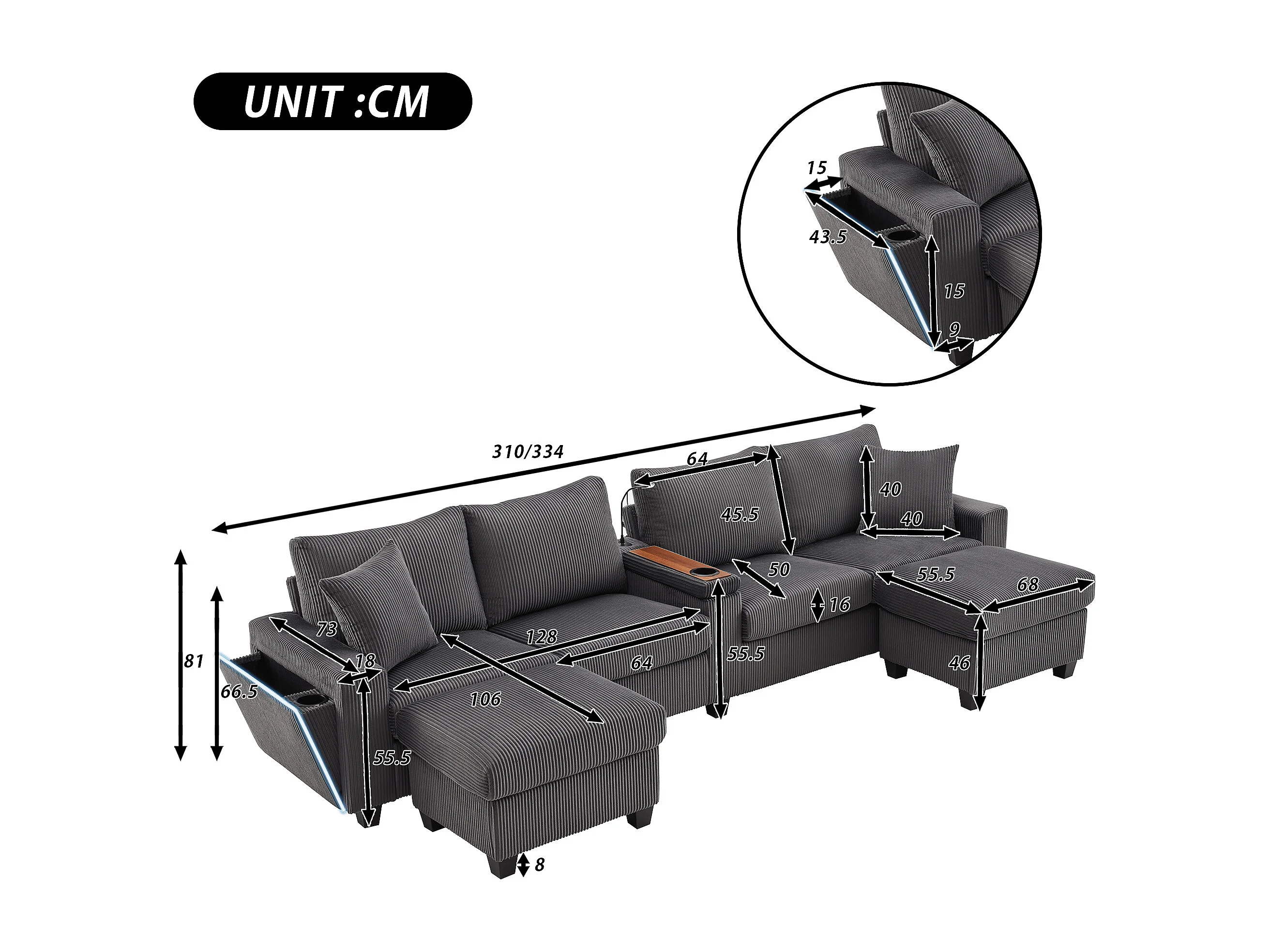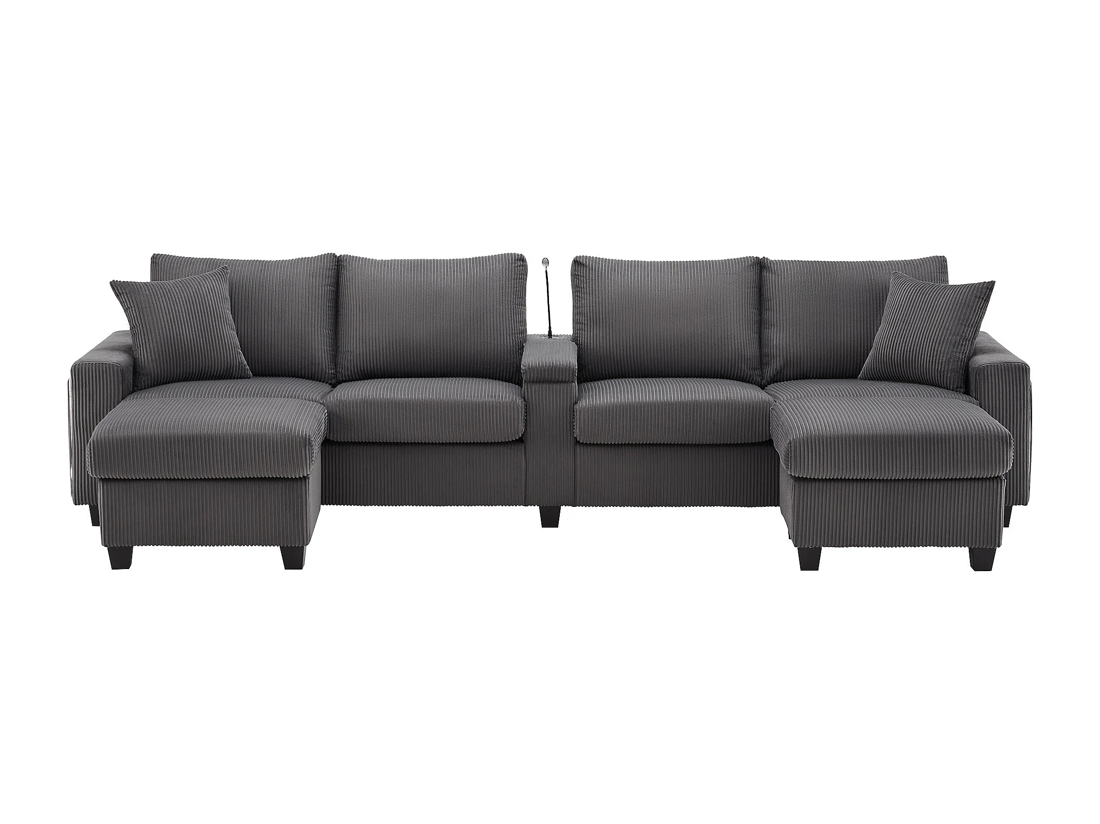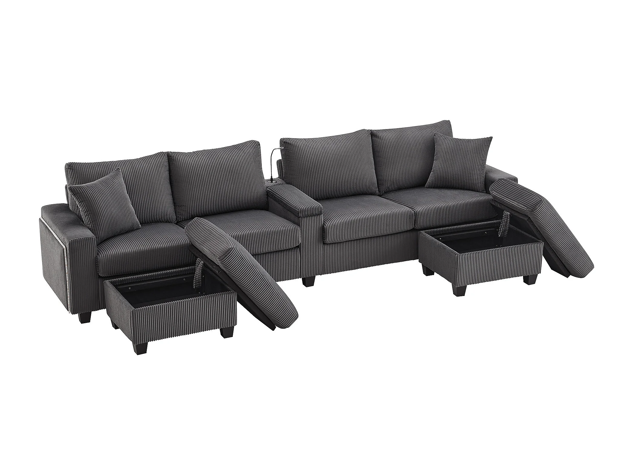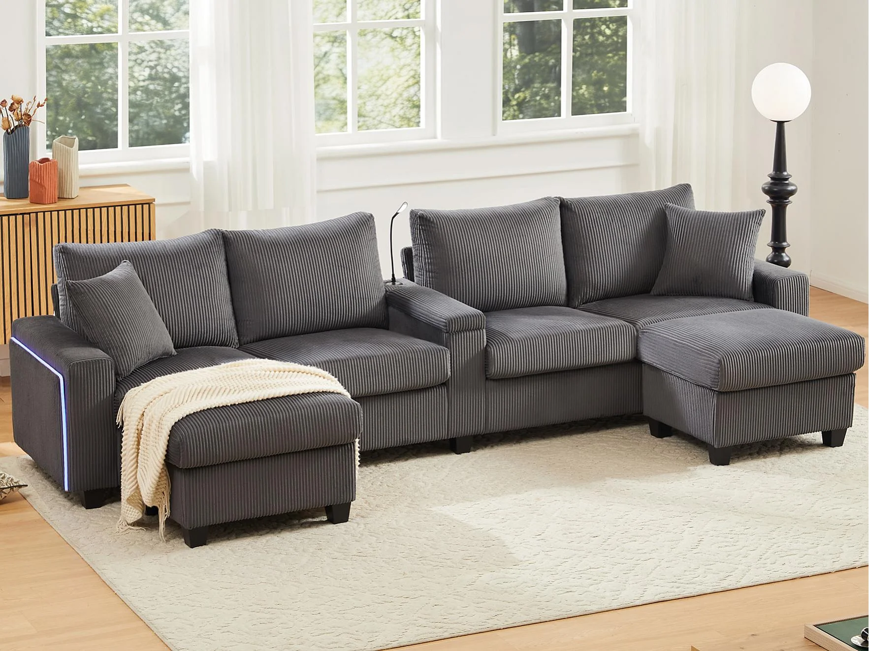 Canapé moderne en forme de U - avec USB, Type-C et lampe de lecture - avec lumières LED Porte - avec gobelet et 2 repose-pieds - velours côtelé - Gris