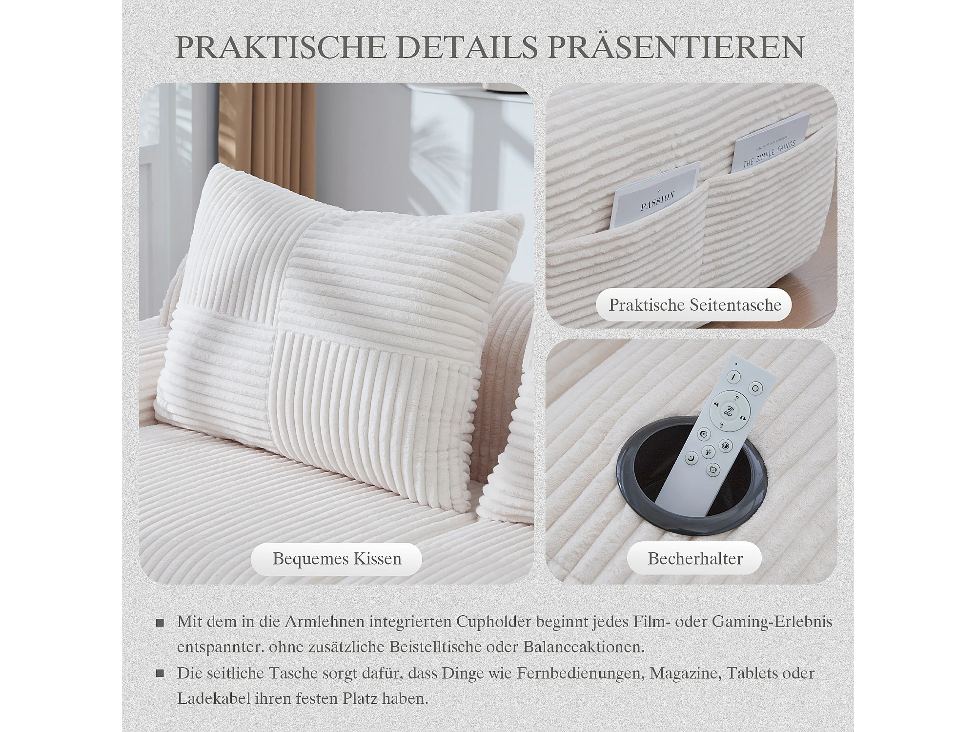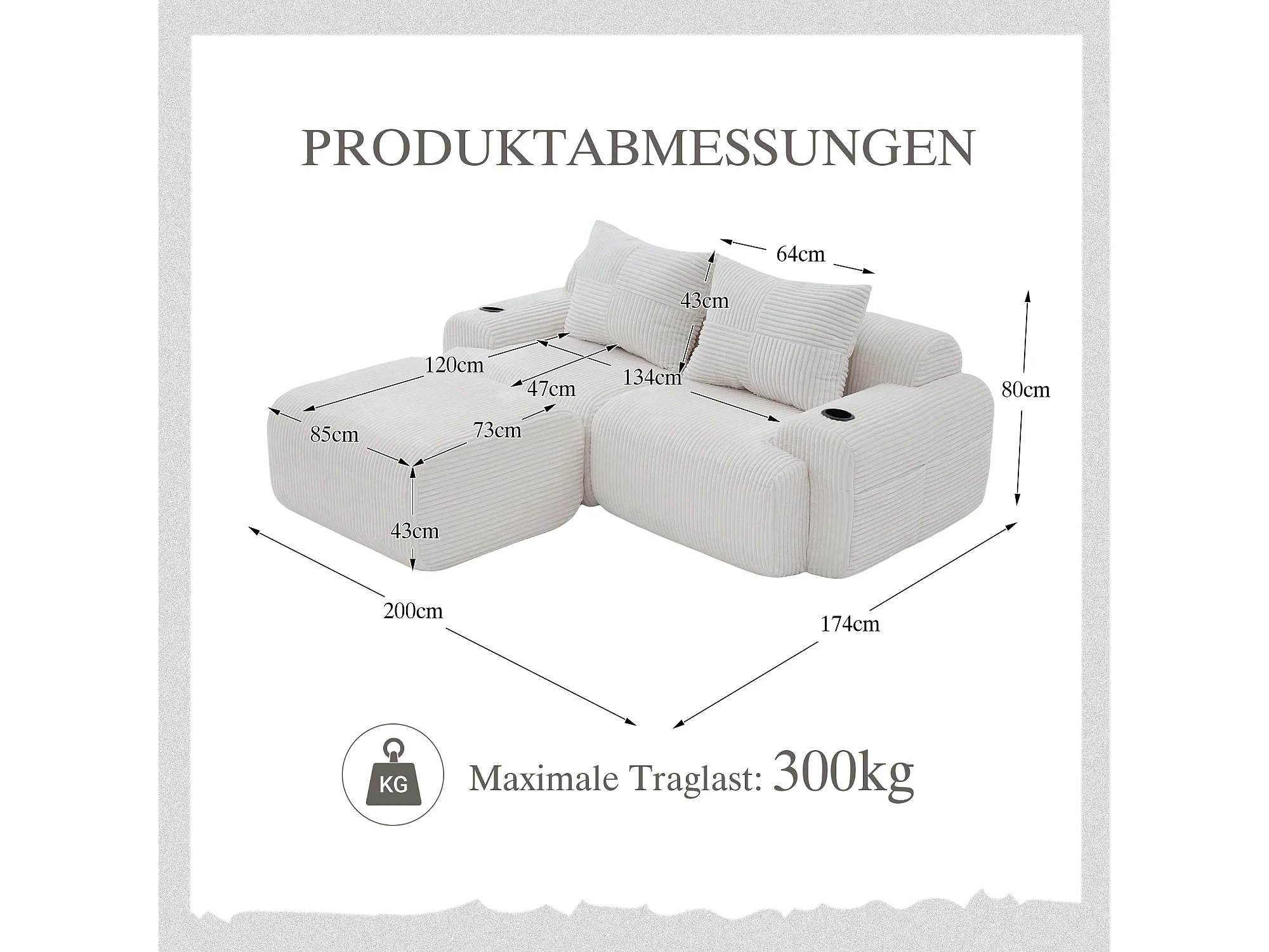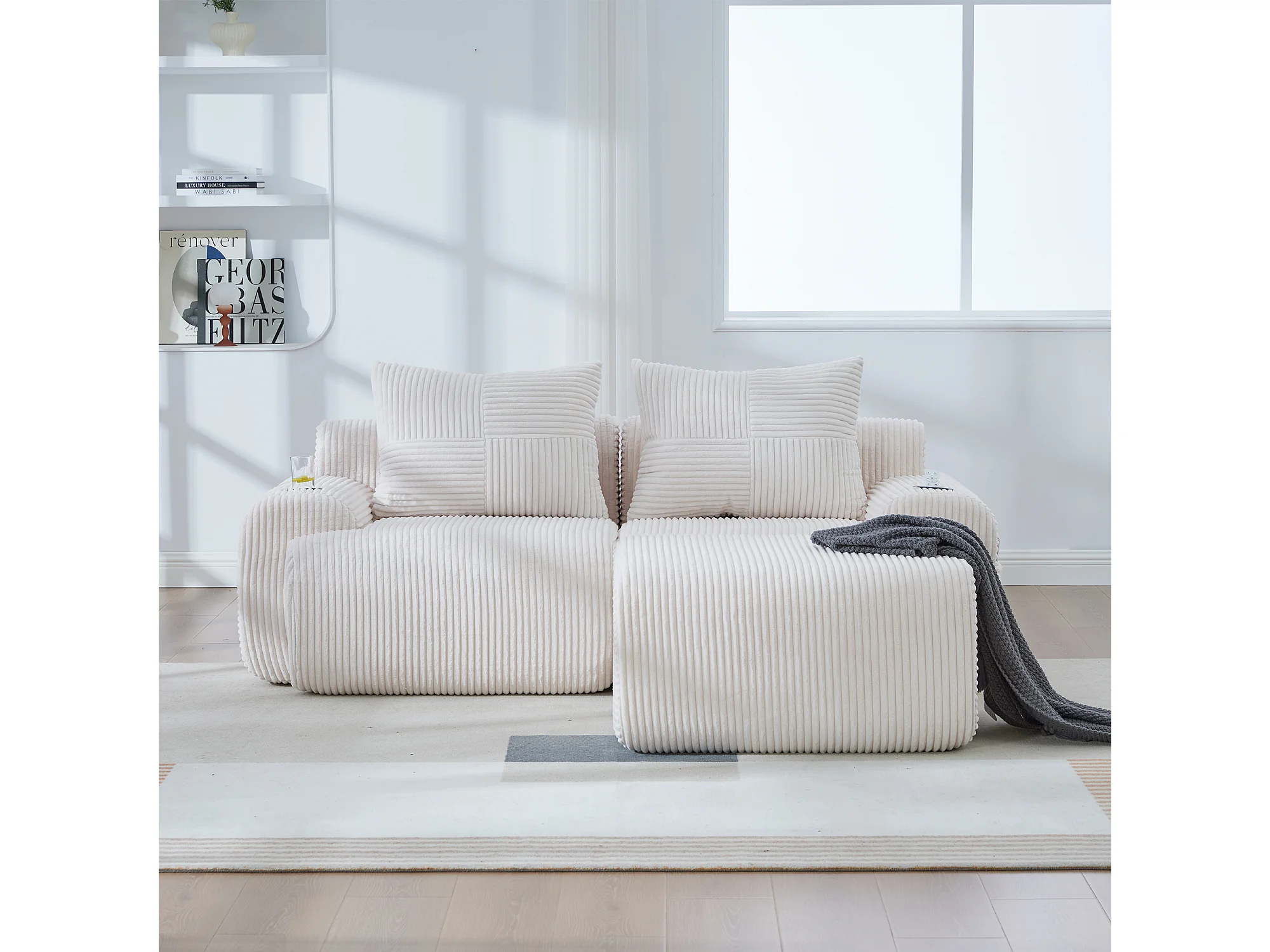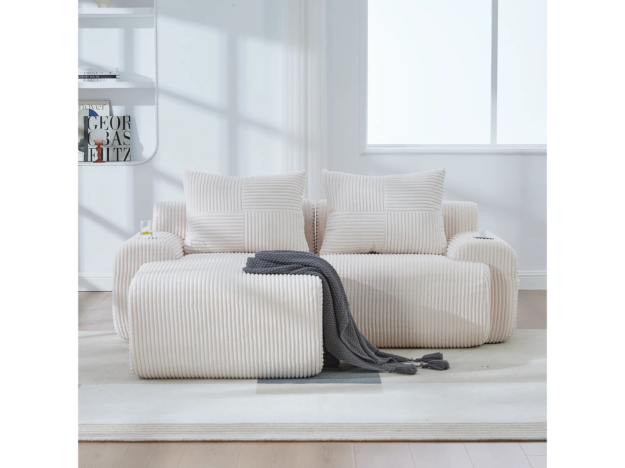 Canapé modulable 2 places - 200 x 174 x 80 cm - avec 1 poufs + porte-gobelets + poche de rangement - velours - beige