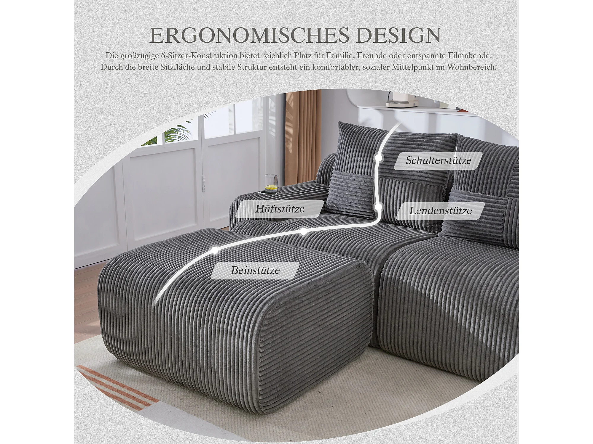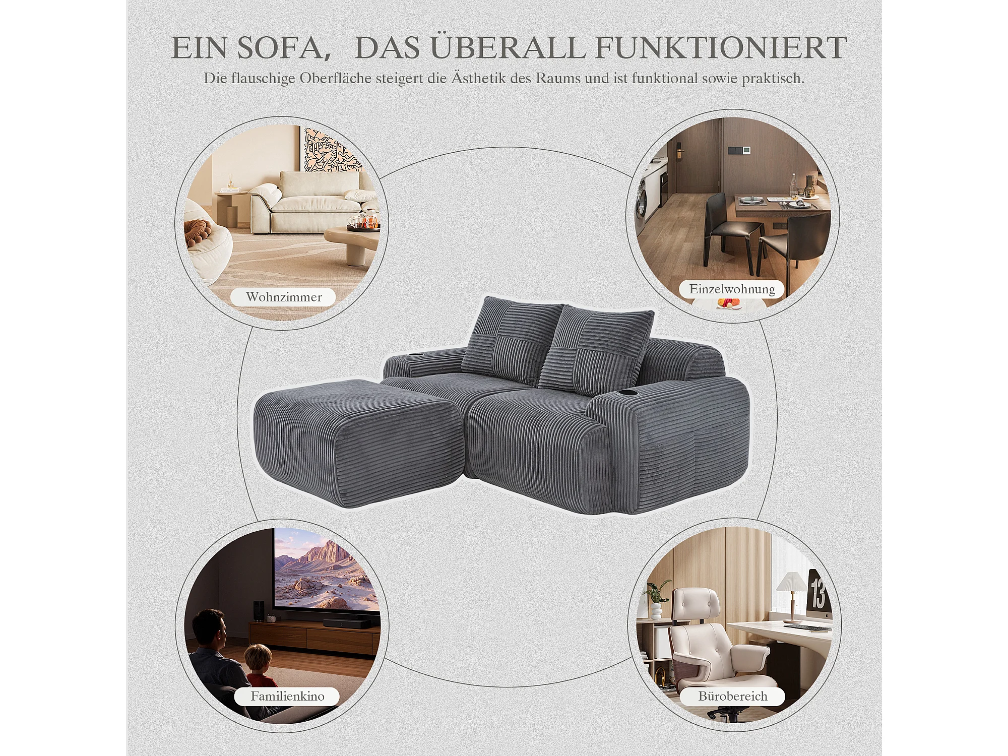 Canapé modulable 2 places - 200 x 174 x 80 cm - avec 1 poufs + porte-gobelets + poche de rangement - velours - gris foncé