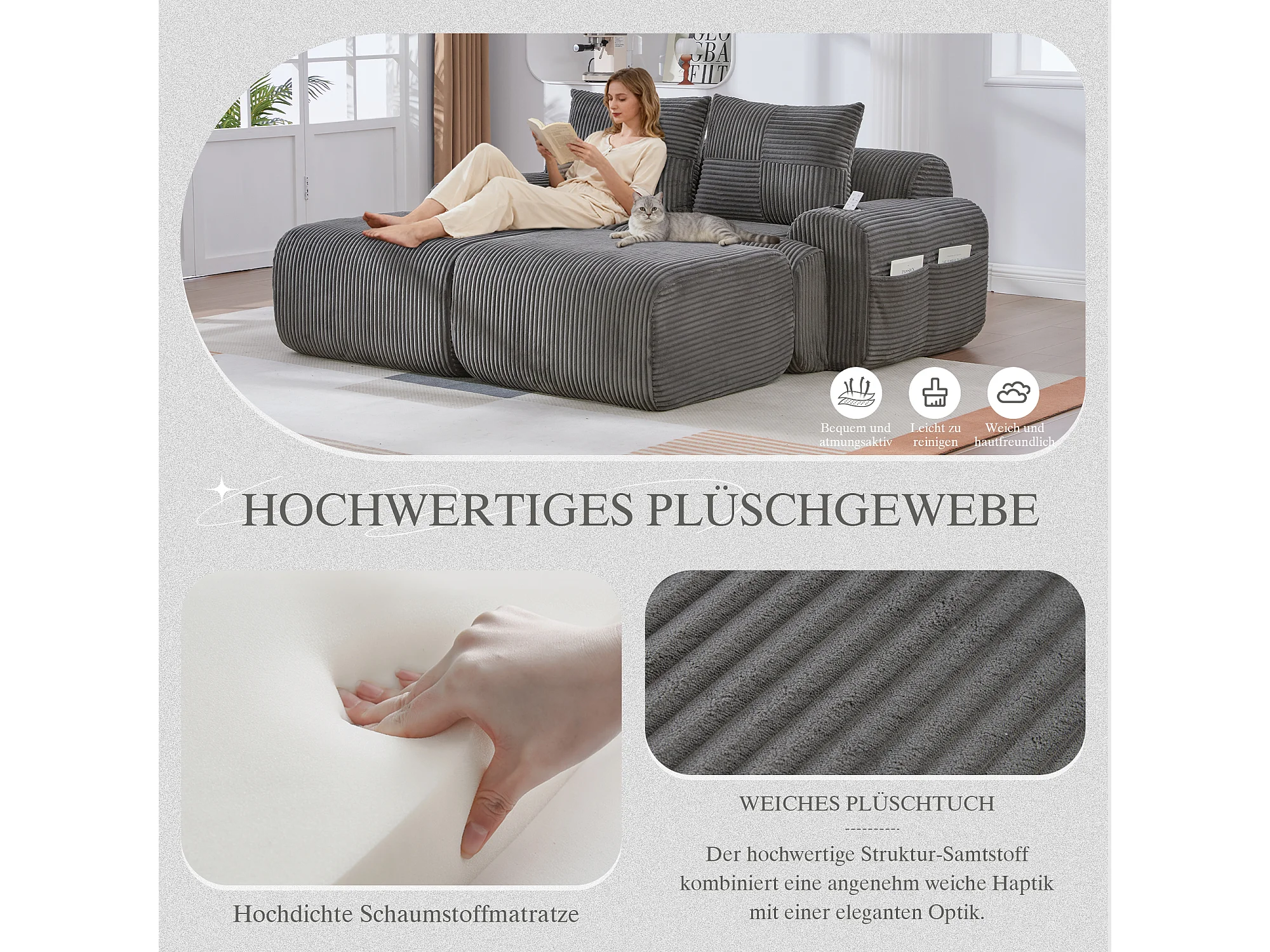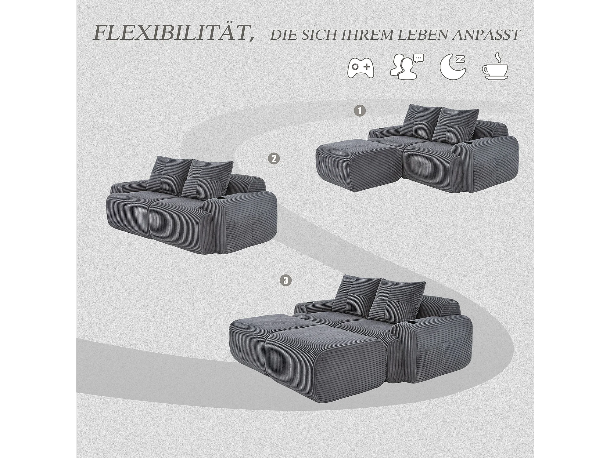 Canapé modulable 2 places - 200 x 174 x 80 cm - avec 2 poufs + porte-gobelets + poche de rangement - velours - gris foncé