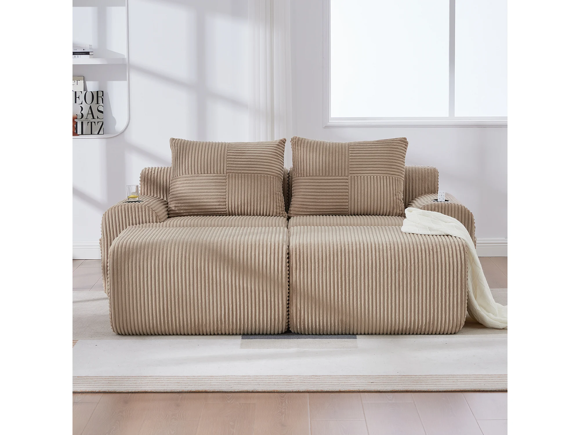Canapé modulable 2 places - 200 x 174 x 80 cm - avec 2 poufs + porte-gobelets + poche de rangement - velours - kaki