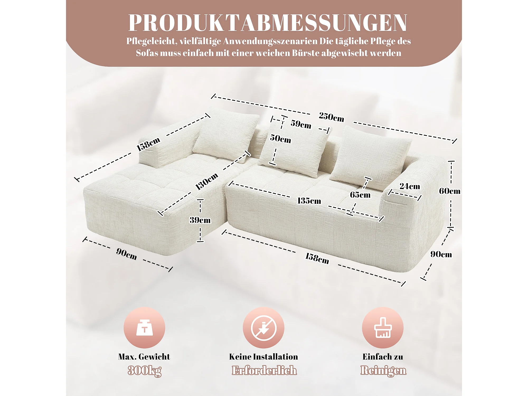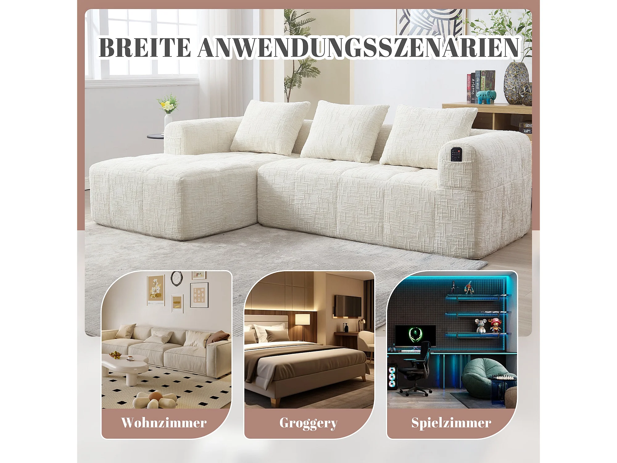 Canapé Modulable 3-4 Places avec Méridienne, Tissu Effet Neige Doux, Mousse Haute Densité, Poches Latérales, Sans Montage