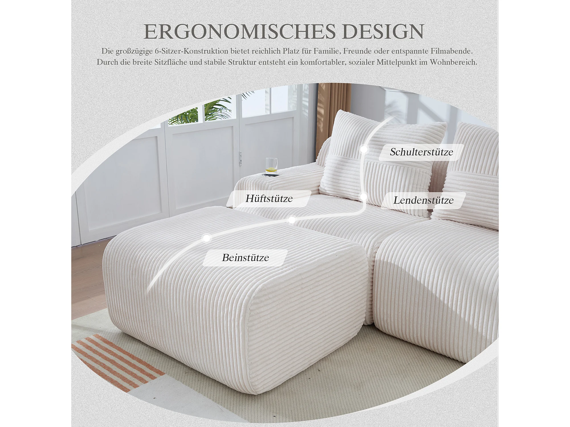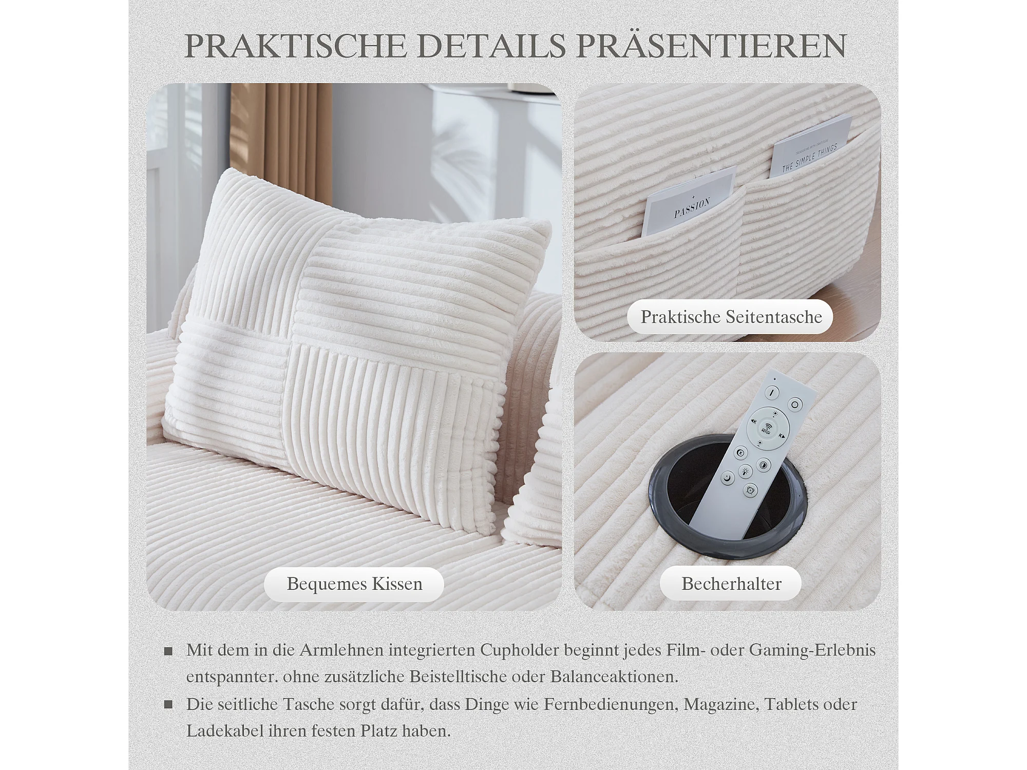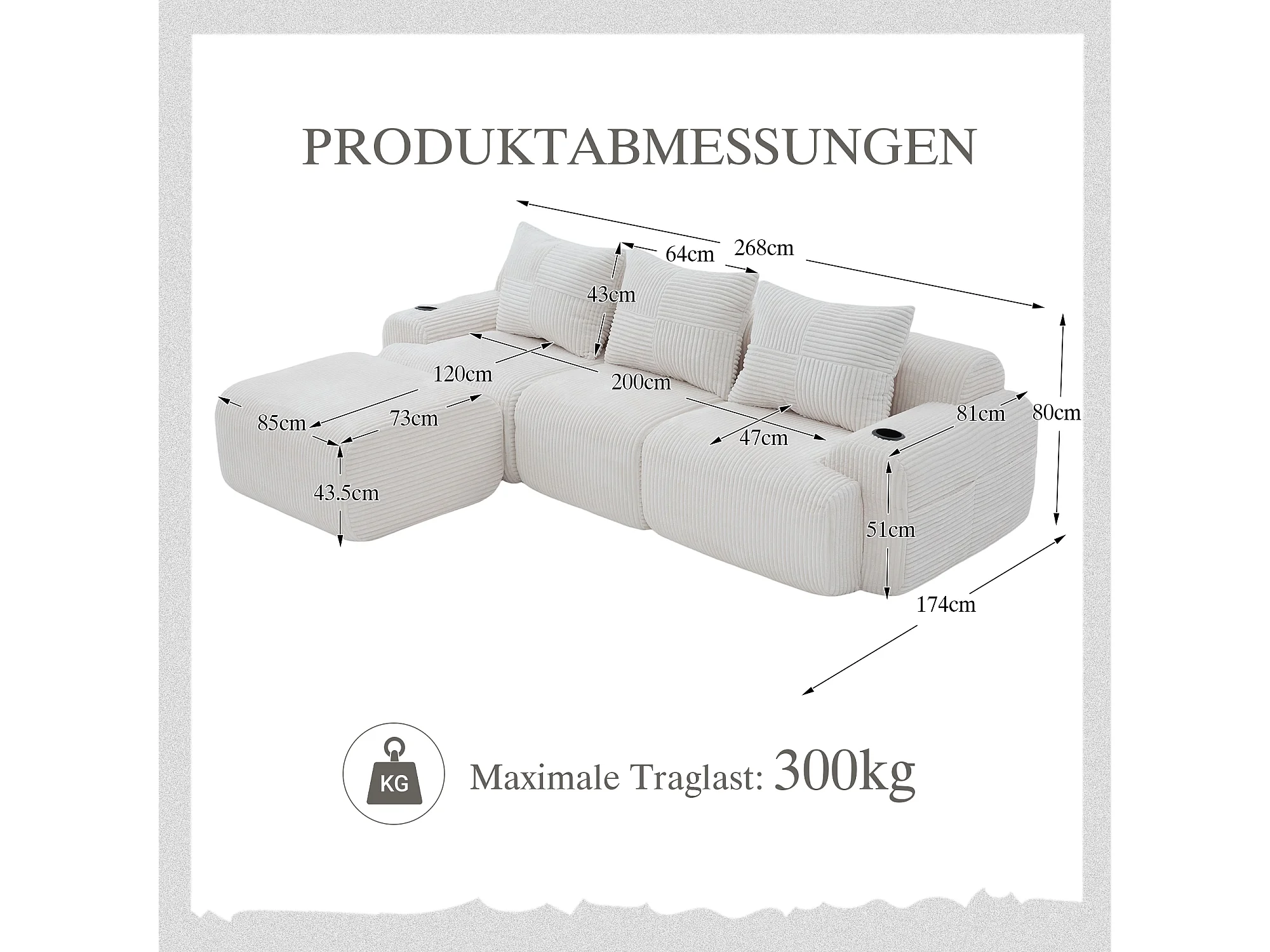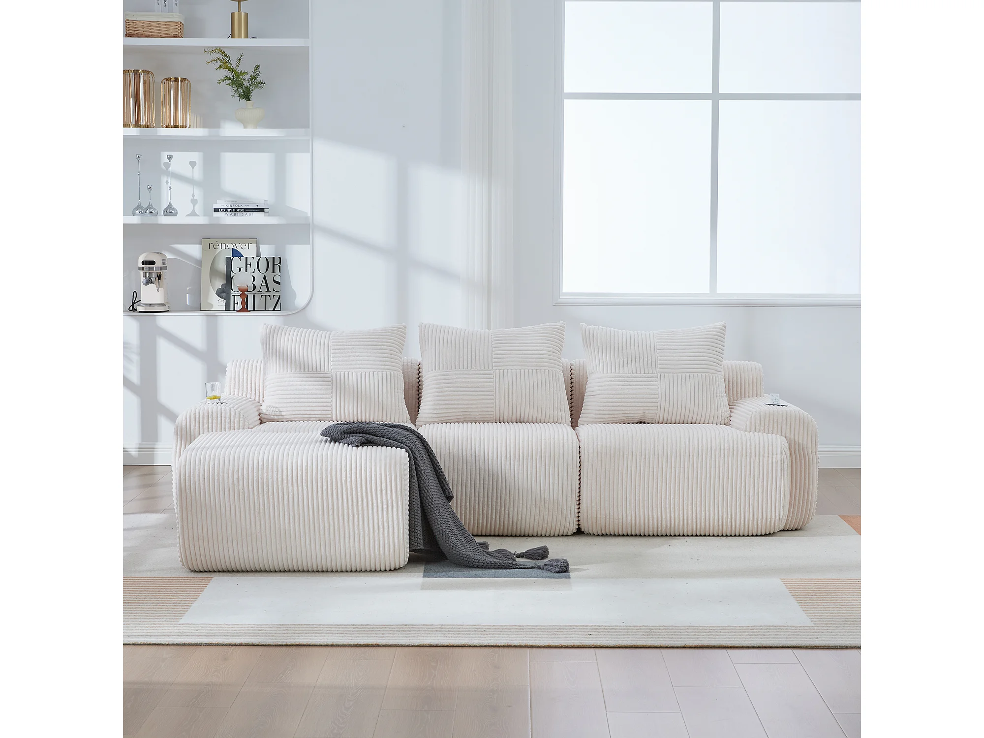 Canapé modulable 3 places - 268 x 174 x 80 cm - avec 1 poufs + porte-gobelets + poche de rangement - velours - beige