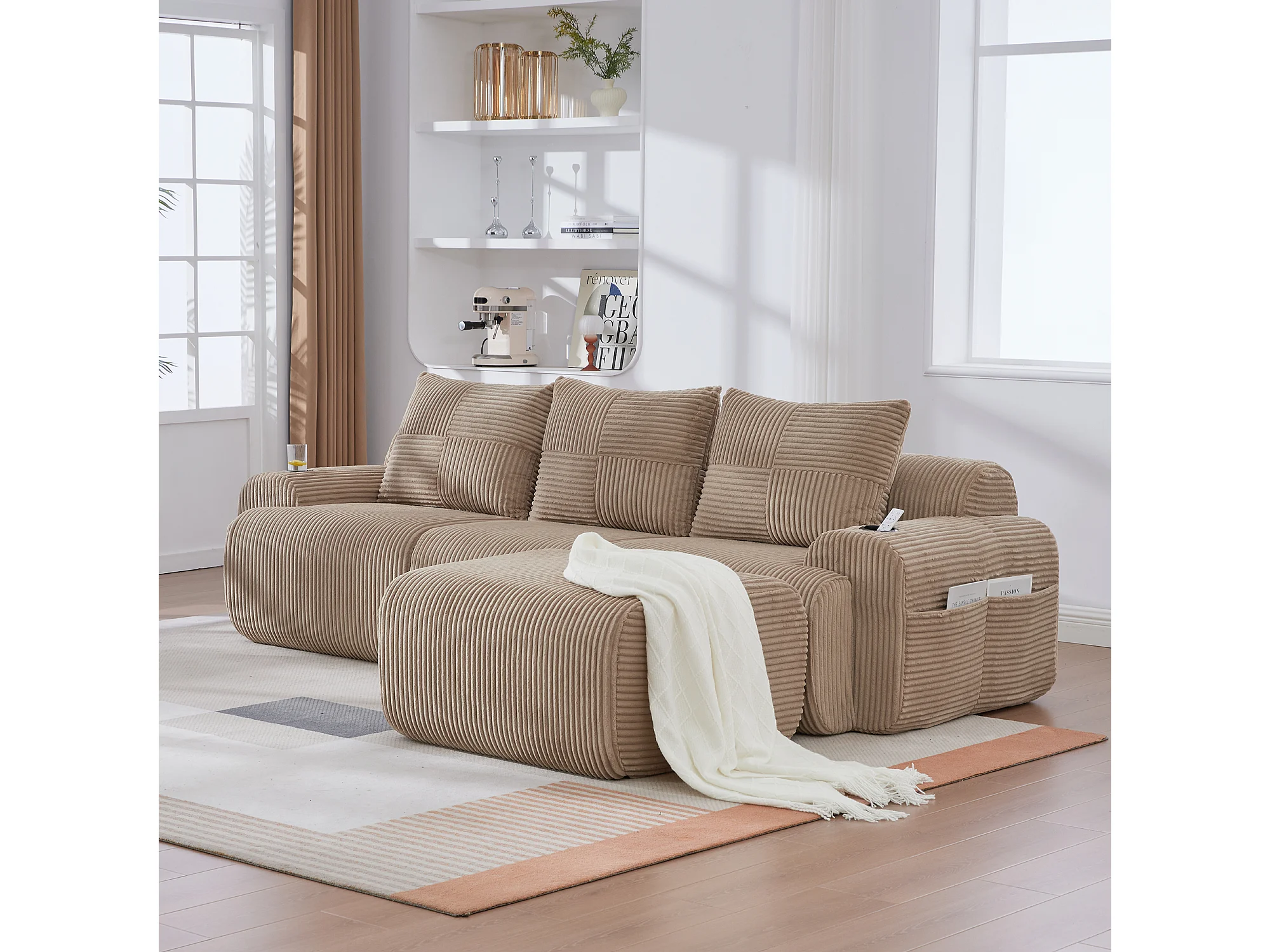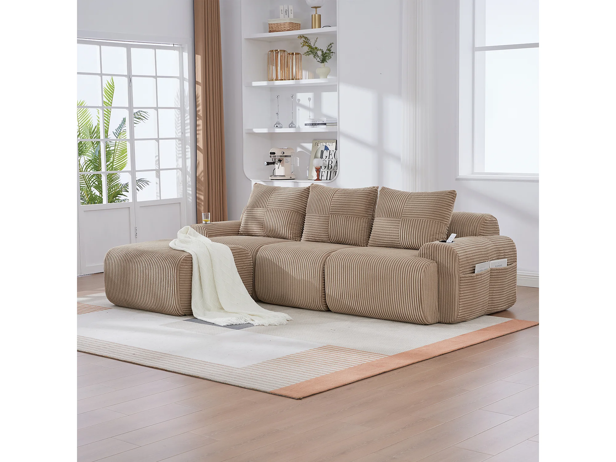 Canapé modulable 3 places - 268 x 174 x 80 cm - avec 1 poufs + porte-gobelets + poche de rangement - velours - kaki