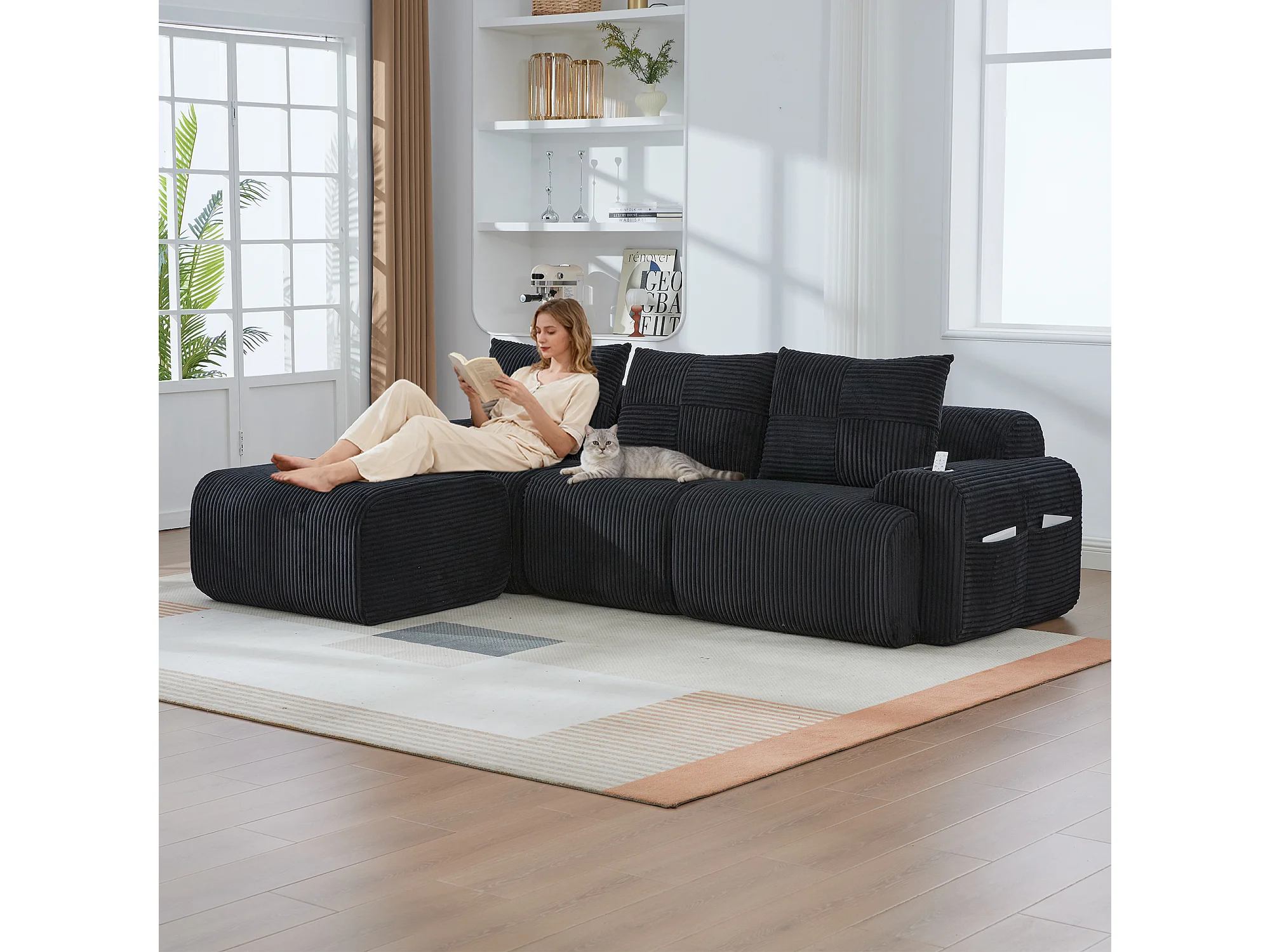 Canapé modulable 3 places - 268 x 174 x 80 cm - avec 1 poufs + porte-gobelets + poche de rangement - velours - noir