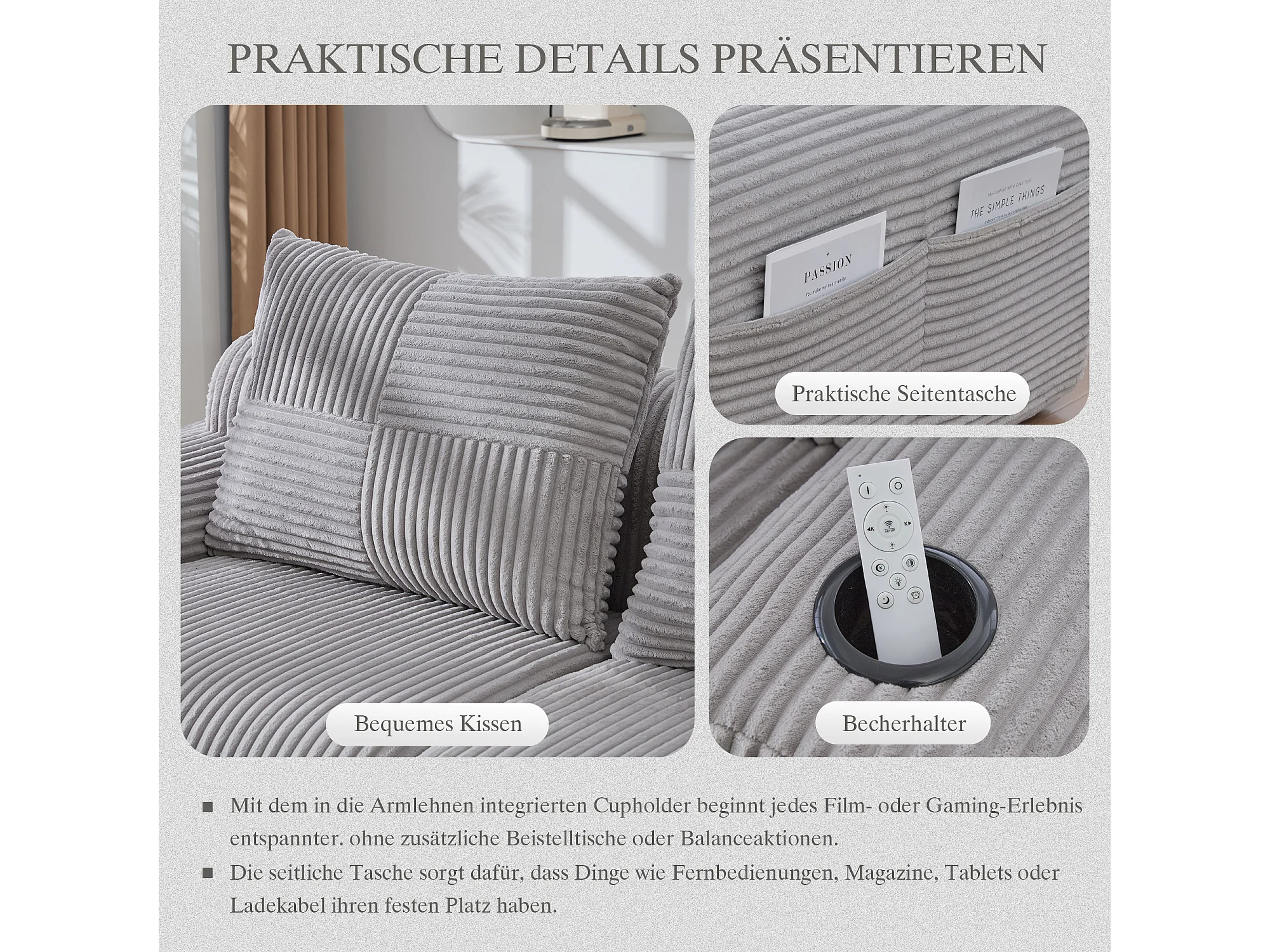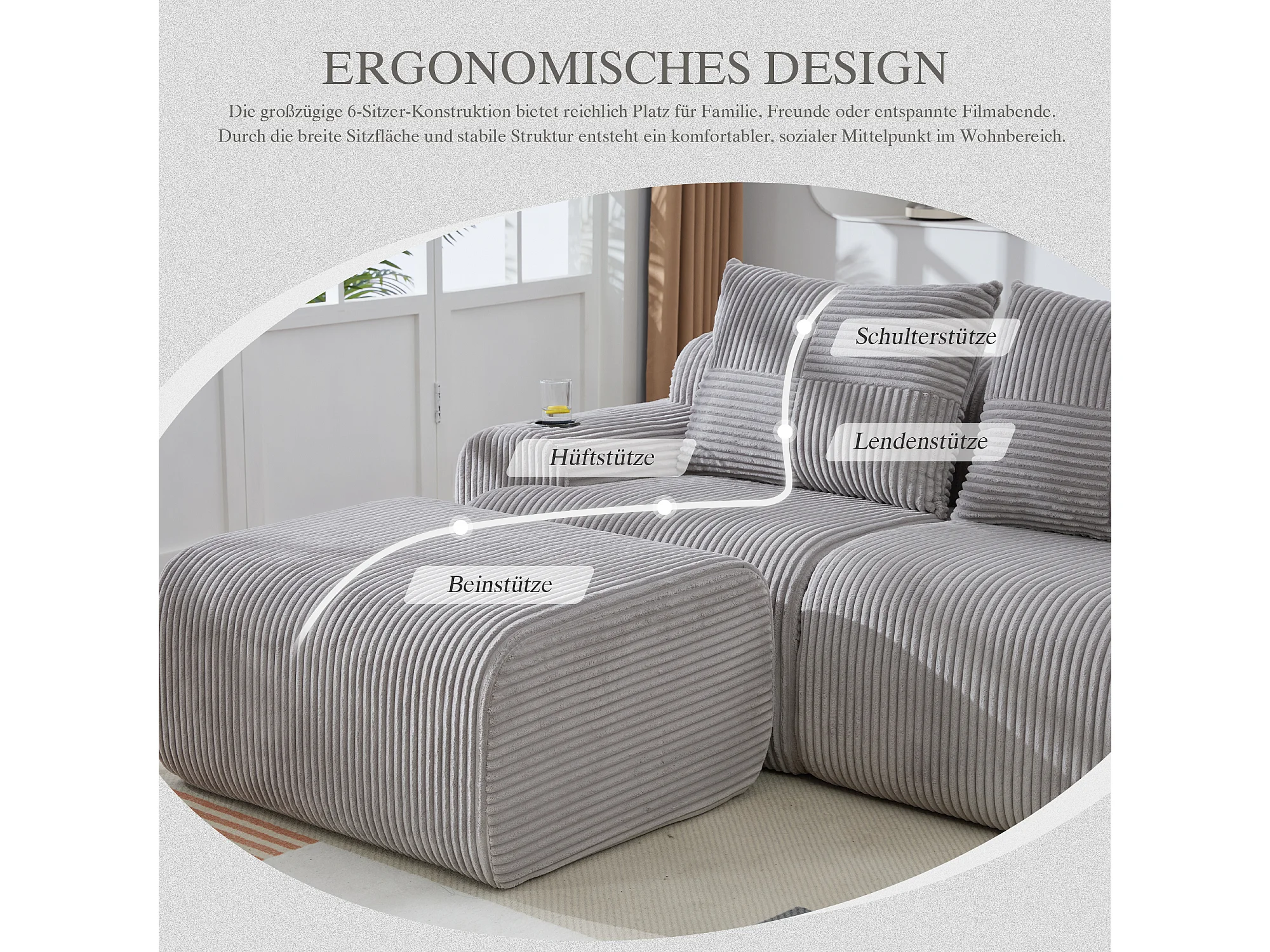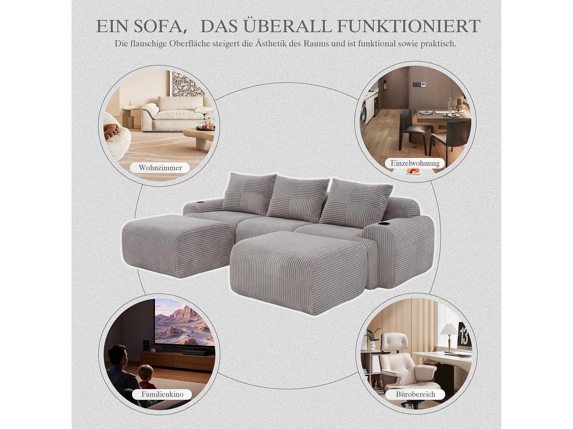 Canapé modulable 3 places - 268 x 174 x 80 cm - avec 2 poufs + porte-gobelets + poche de rangement - velours - gris clair
