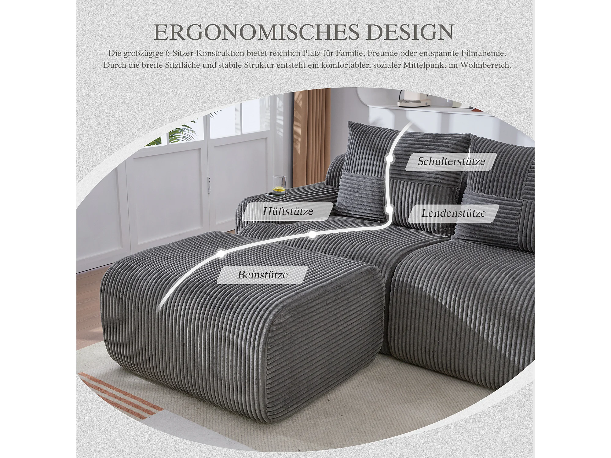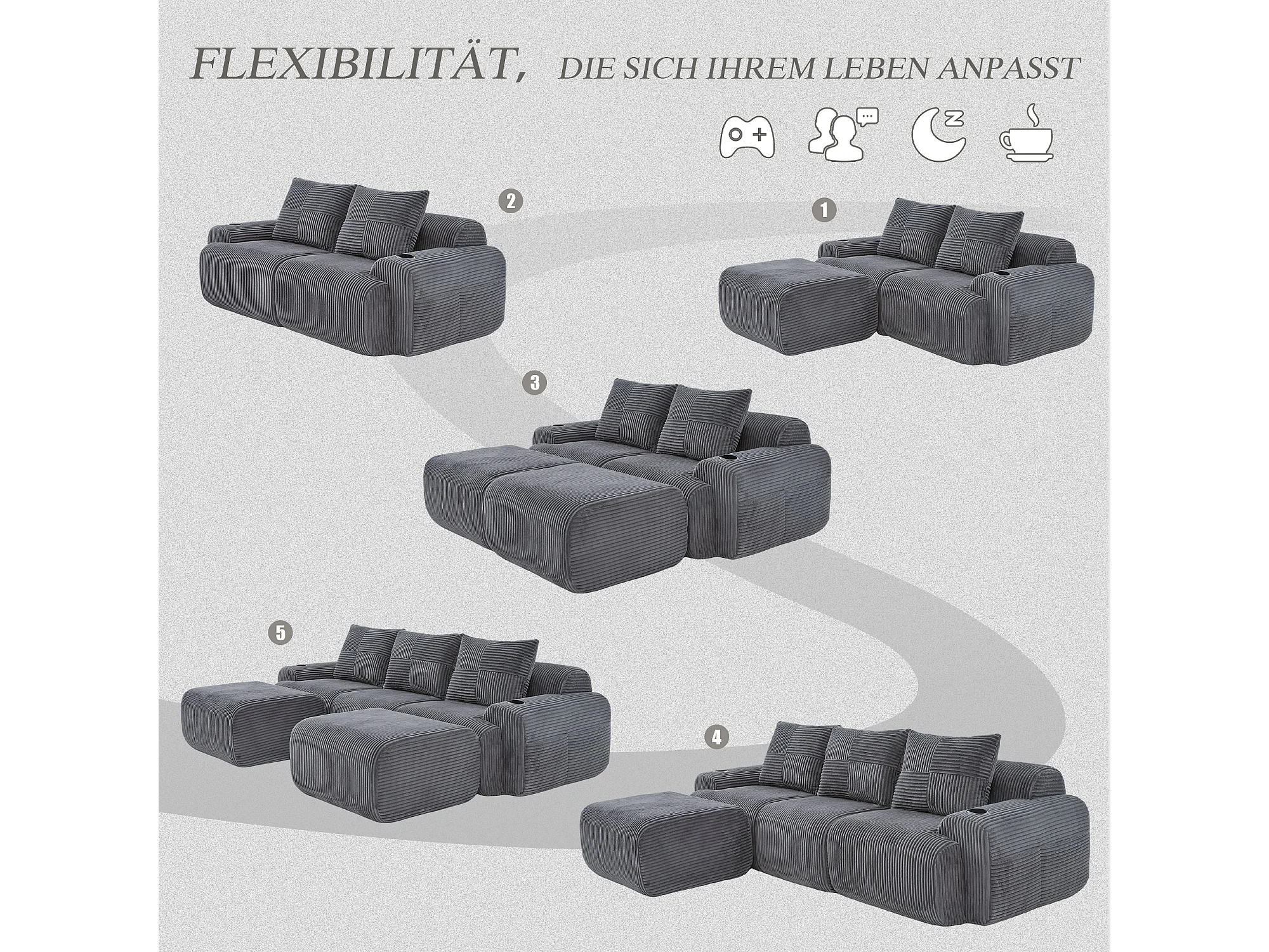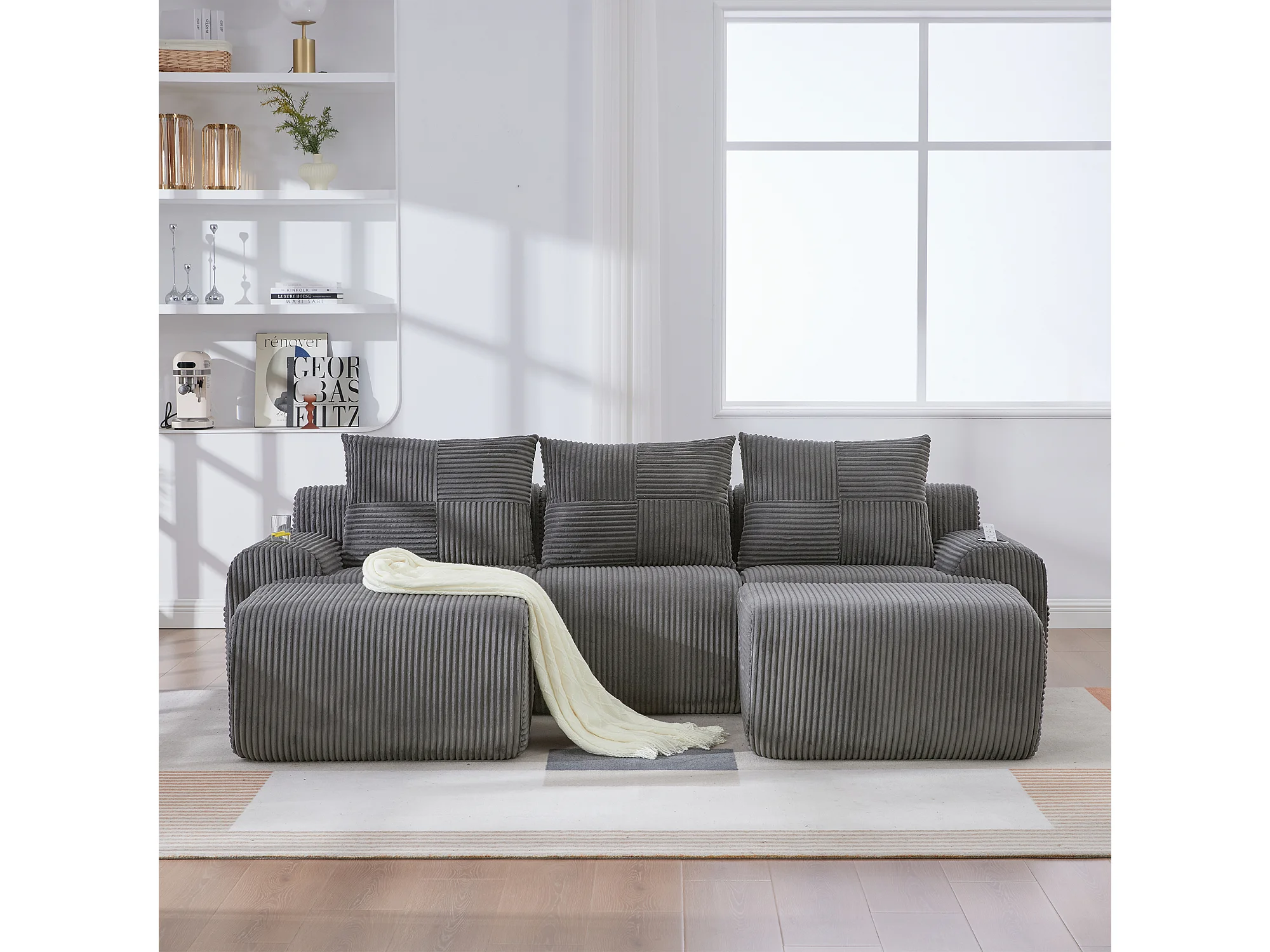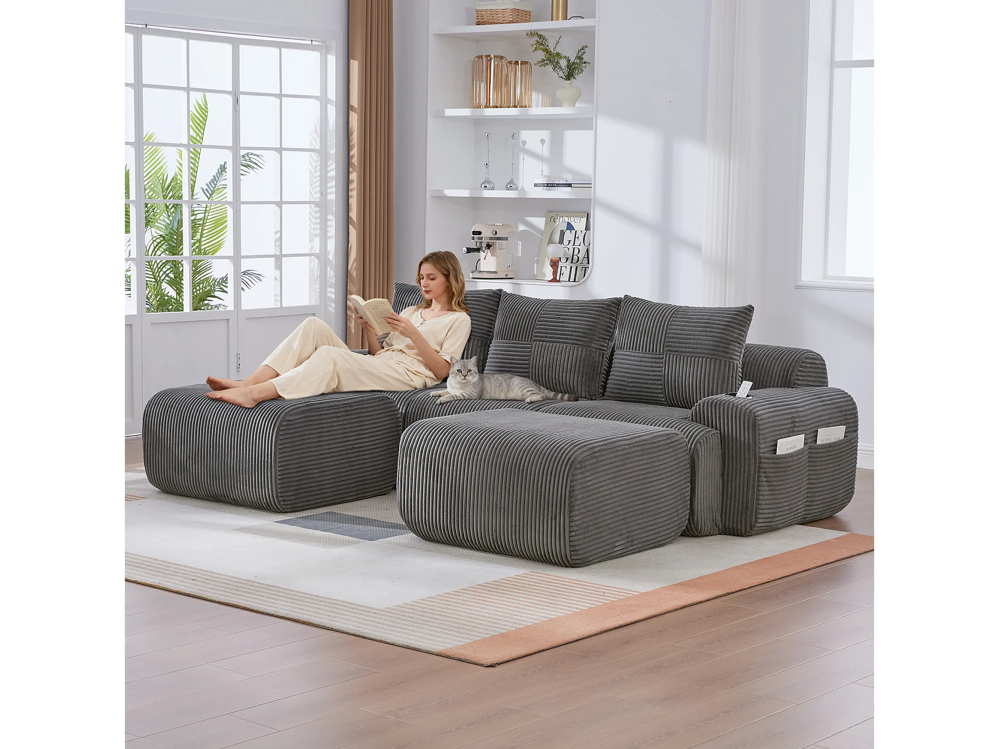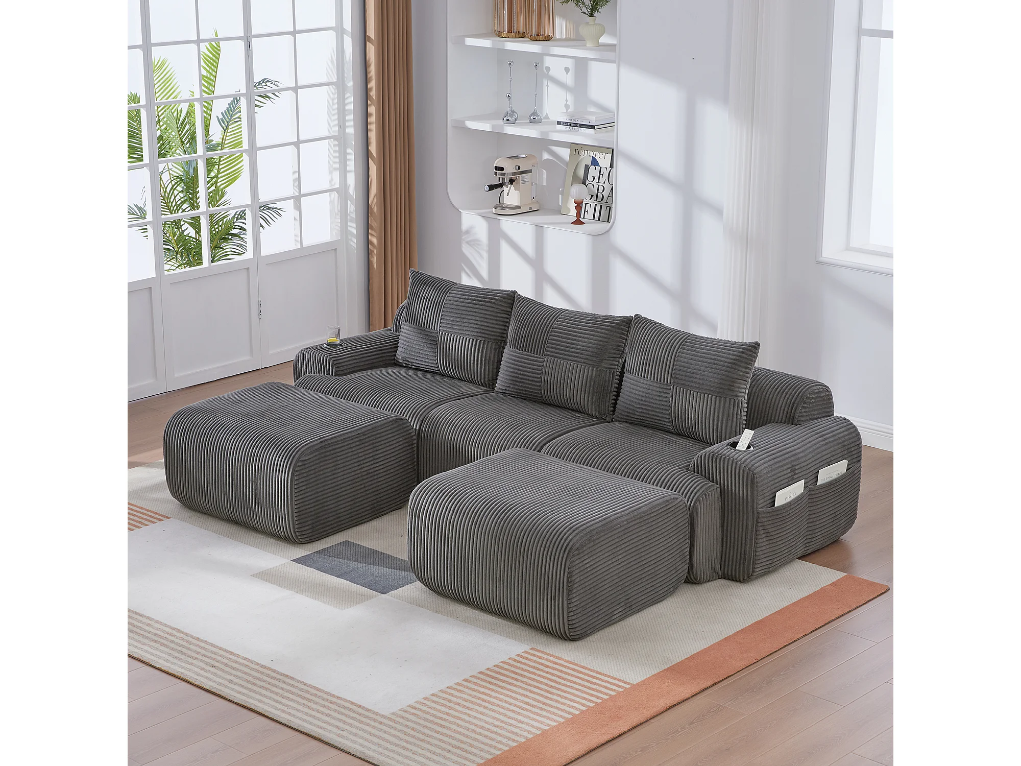 Canapé modulable 3 places - 268 x 174 x 80 cm - avec 2 poufs + porte-gobelets + poche de rangement - velours - gris foncé