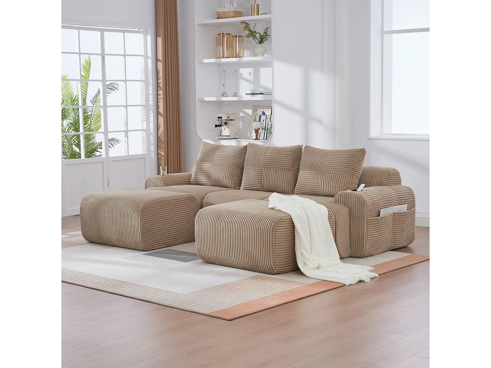 Canapé modulable 3 places - 268 x 174 x 80 cm - avec 2 poufs + porte-gobelets + poche de rangement - velours - kaki