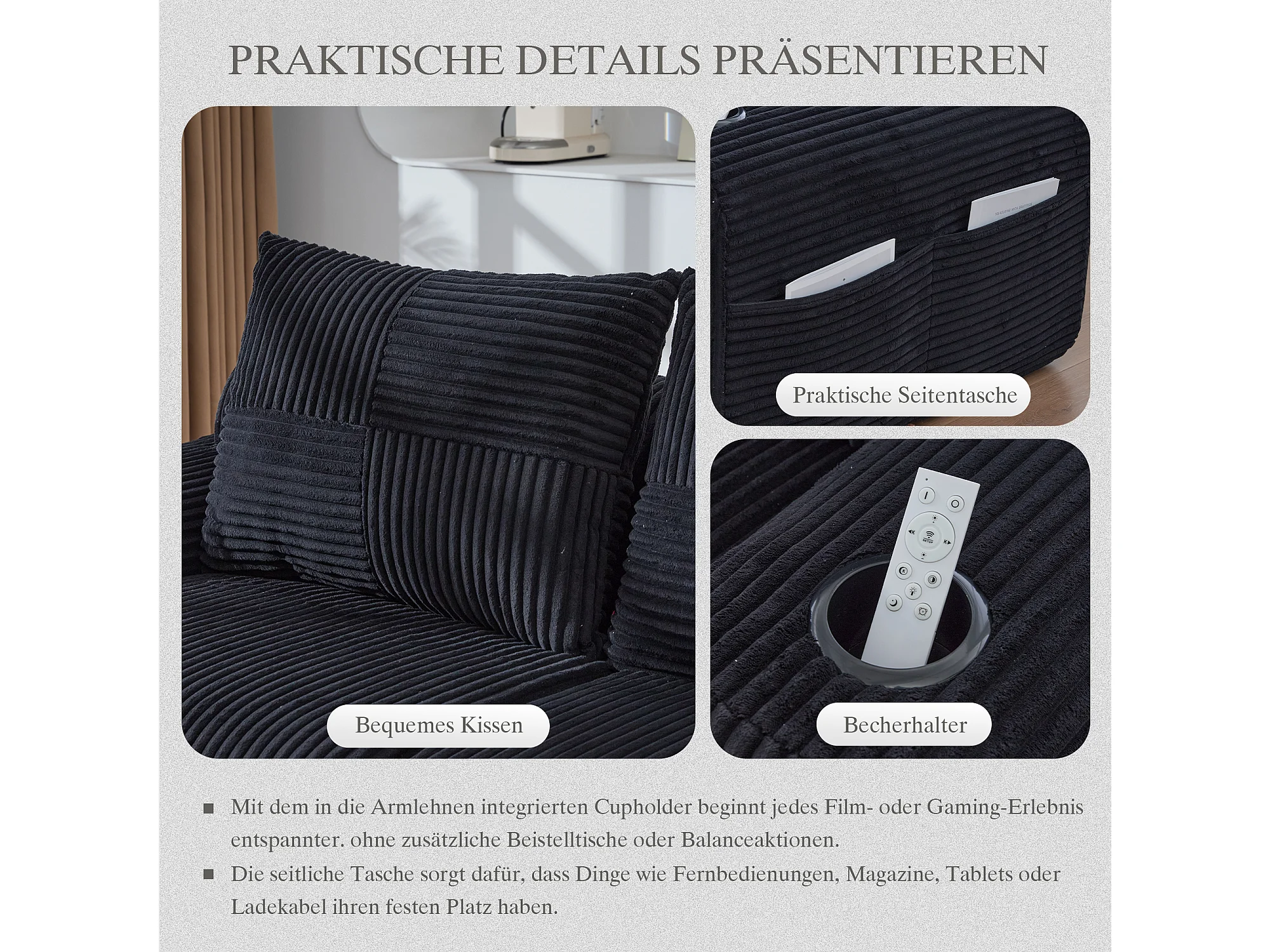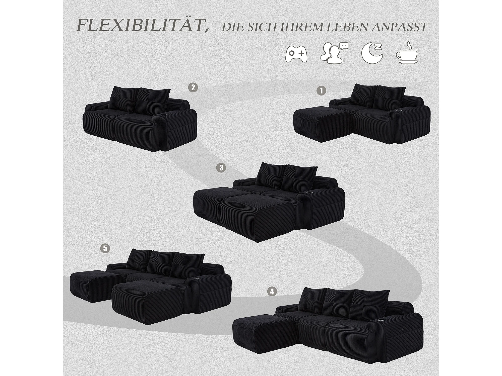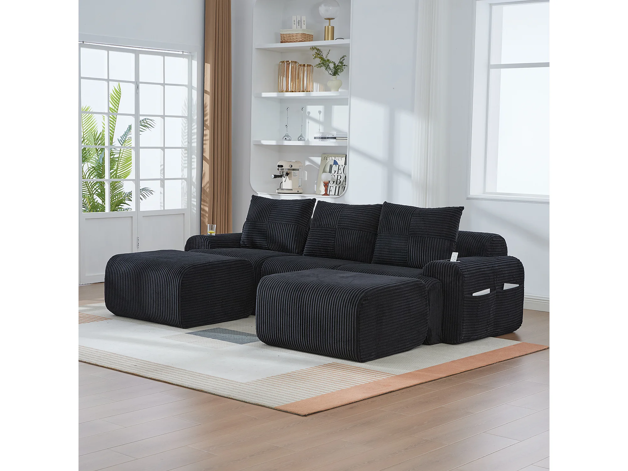 Canapé modulable 3 places - 268 x 174 x 80 cm - avec 2 poufs + porte-gobelets + poche de rangement - velours - noir