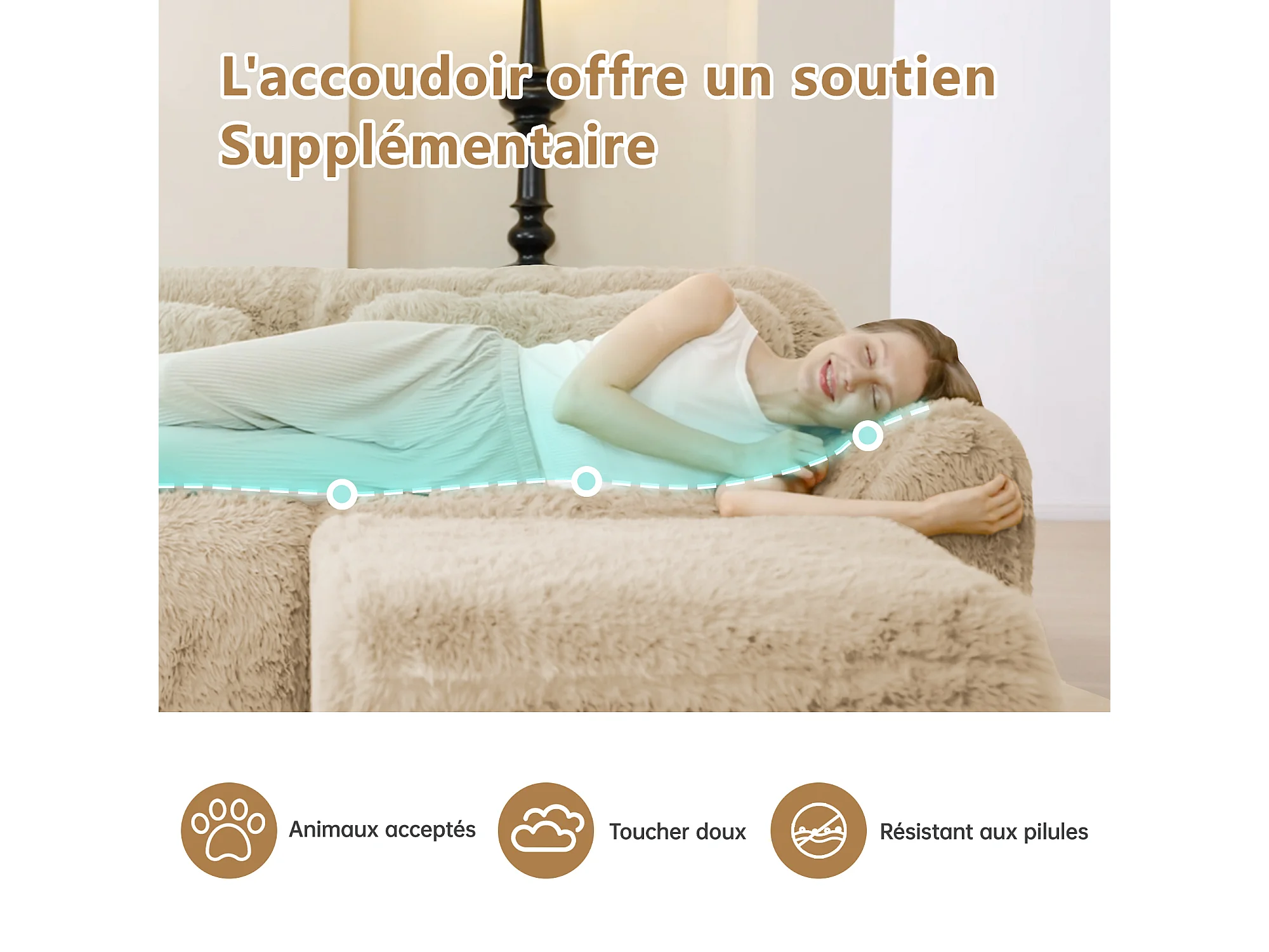 Canapé Modulable 3 places en tissu peluche, avec 3 coussins, sans cadre, 291x104x73cm, Kaki