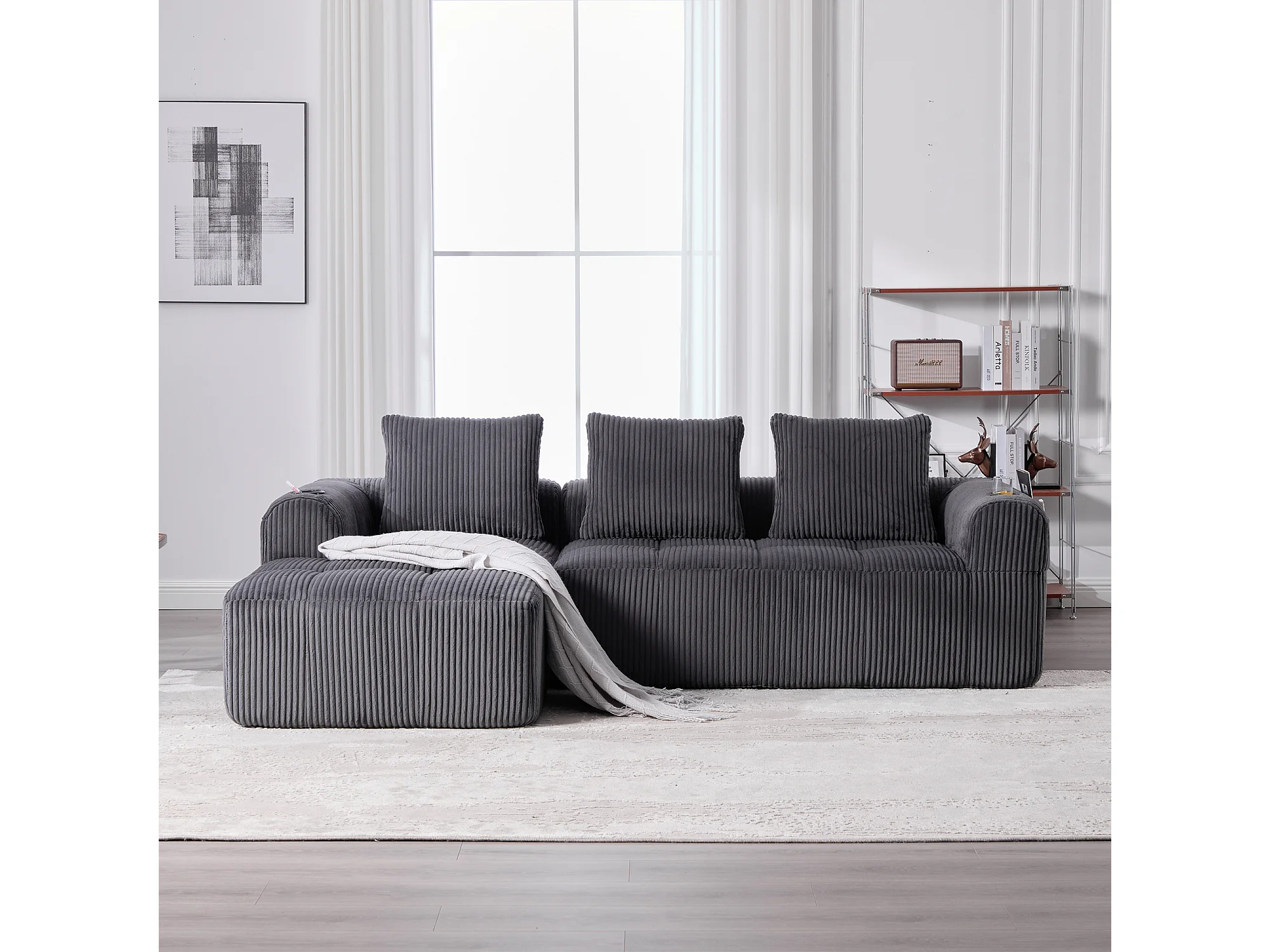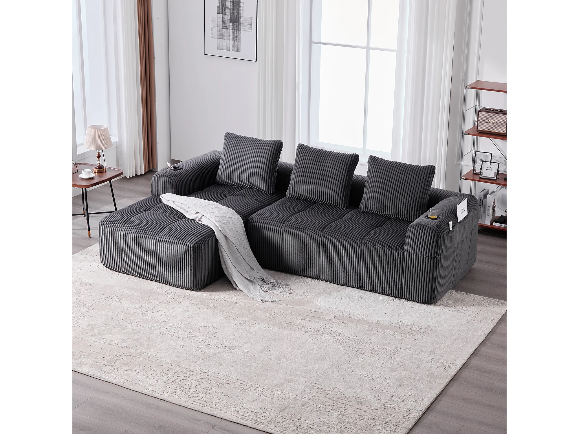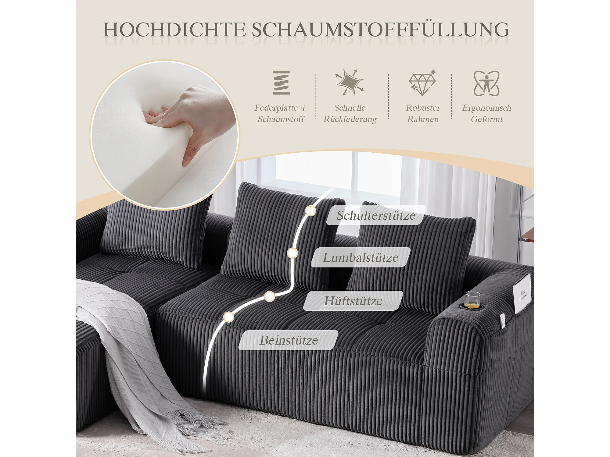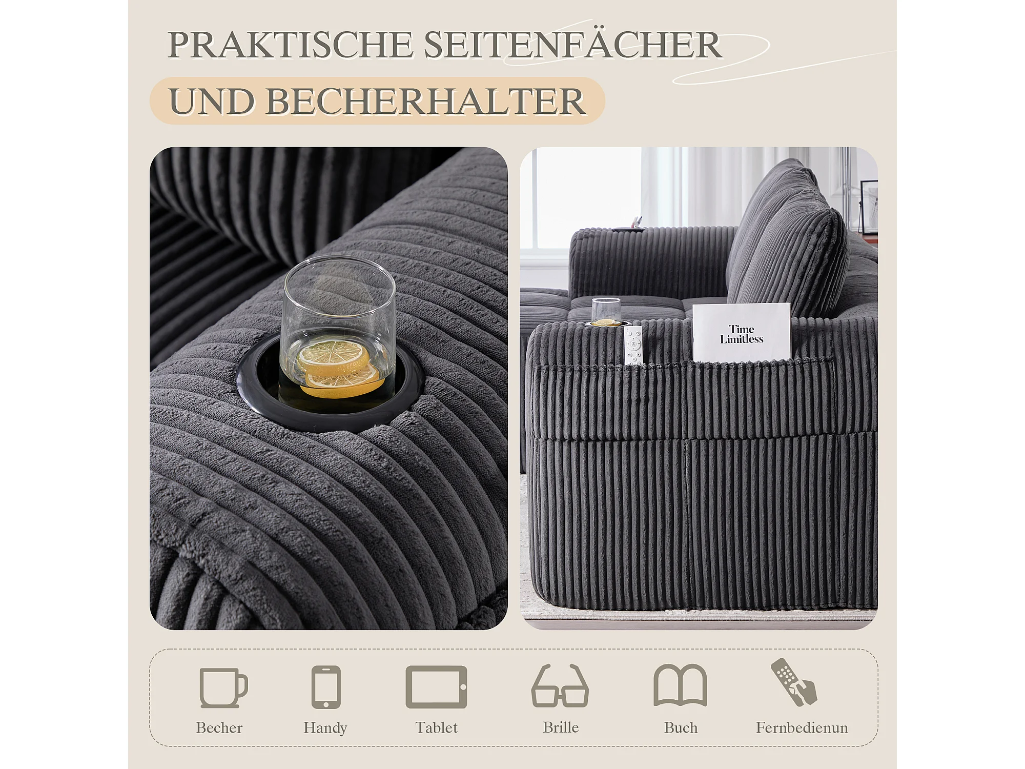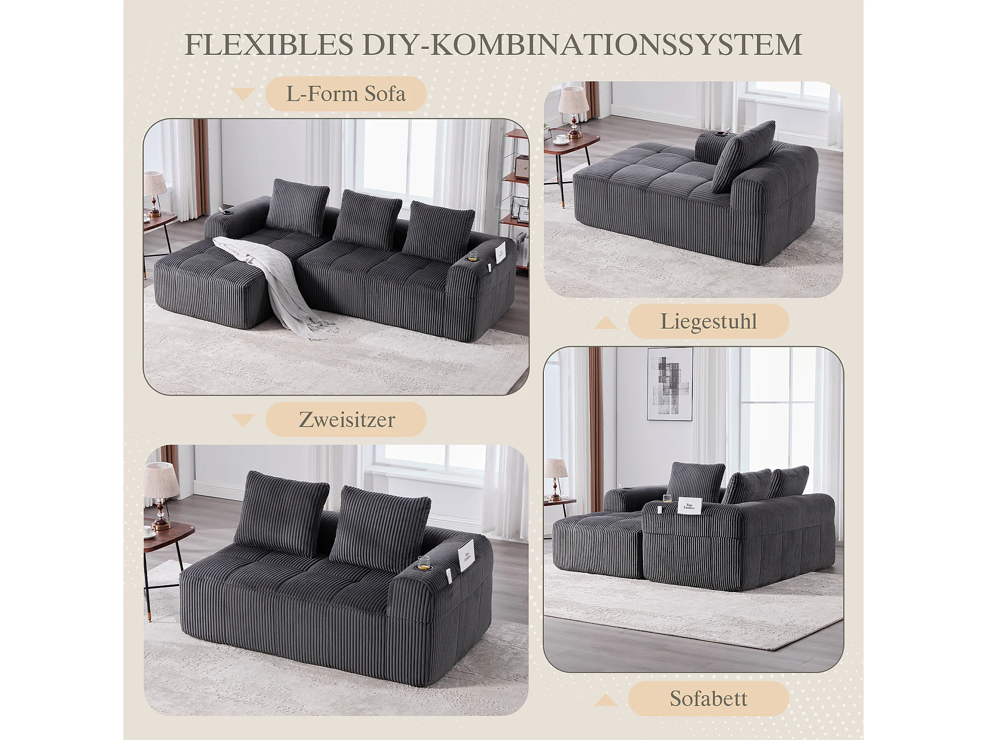 Canapé modulable 4 places - 253 x 158 x 61 - avec poche latérale + porte-gobelet + 3 coussins - velours - gris foncé