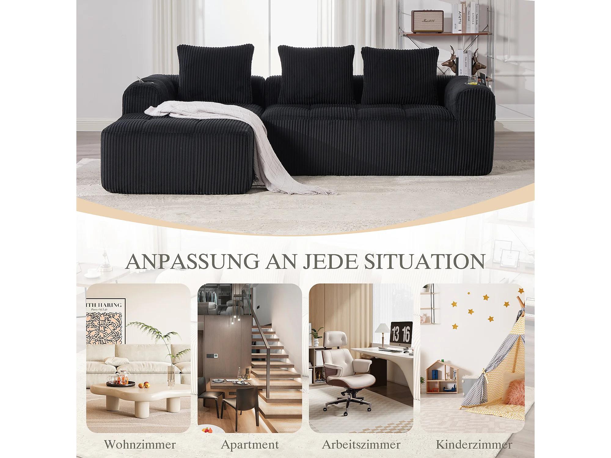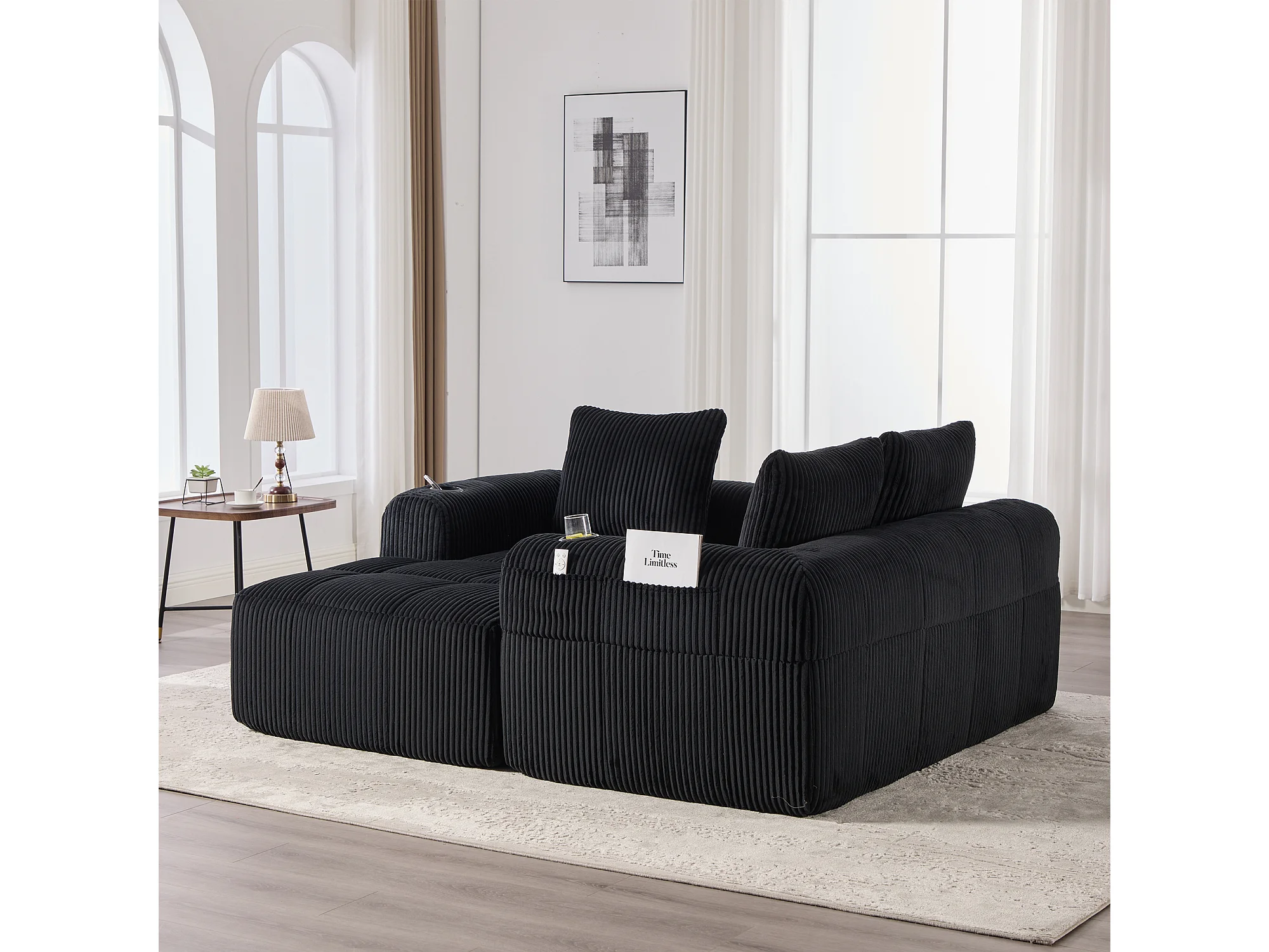 Canapé modulable 4 places - 253 x 158 x 61 - avec poche latérale + porte-gobelet + 3 coussins - velours - noir