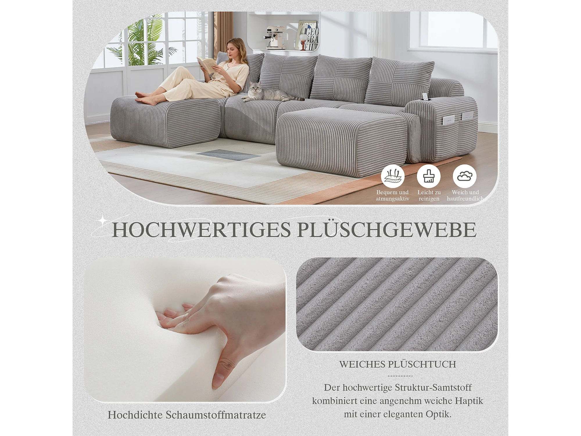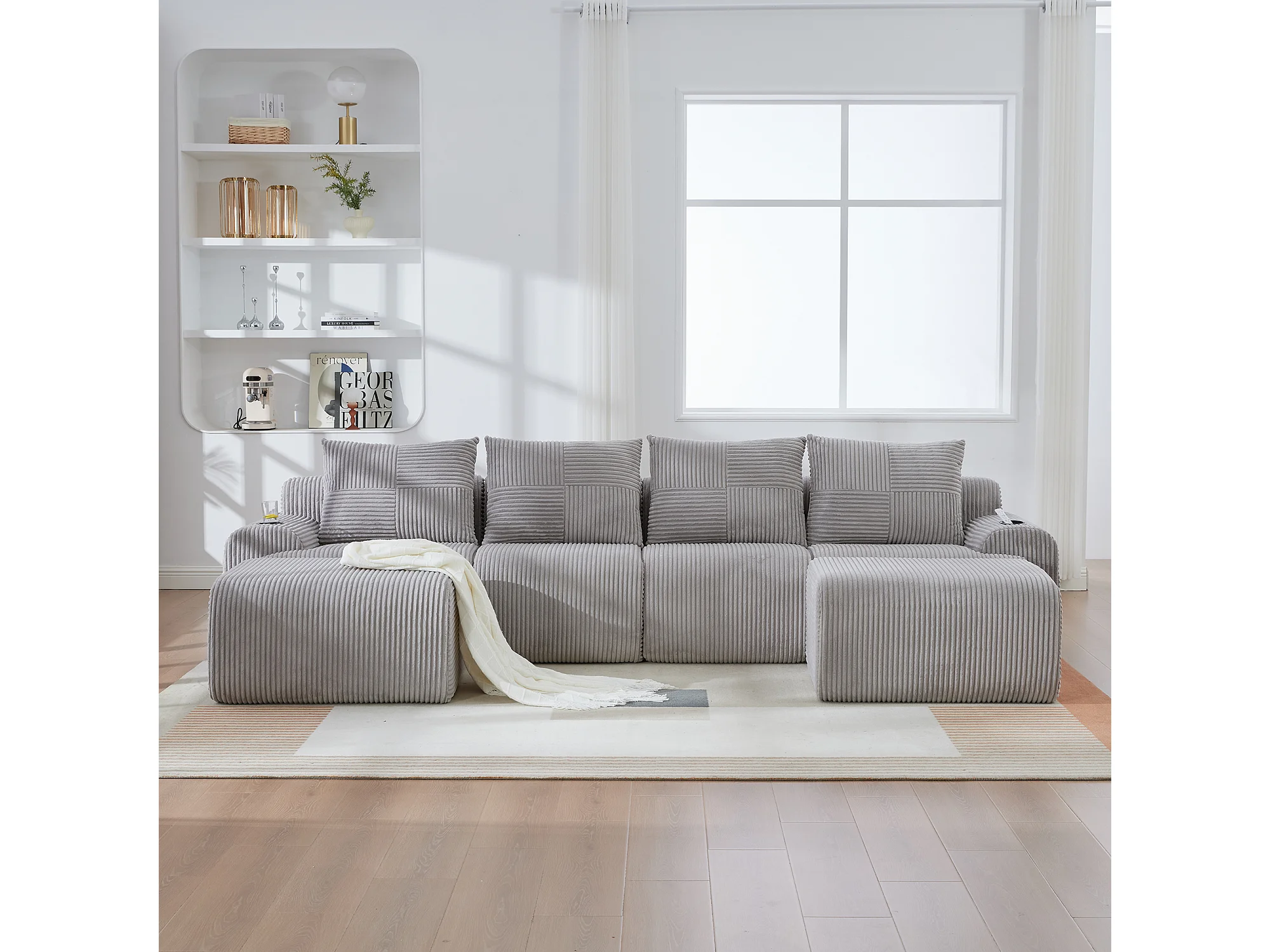 Canapé modulable 4 places - 333 x 174 x 80 cm - avec 2 poufs + porte-gobelets + poche de rangement - velours - gris clair