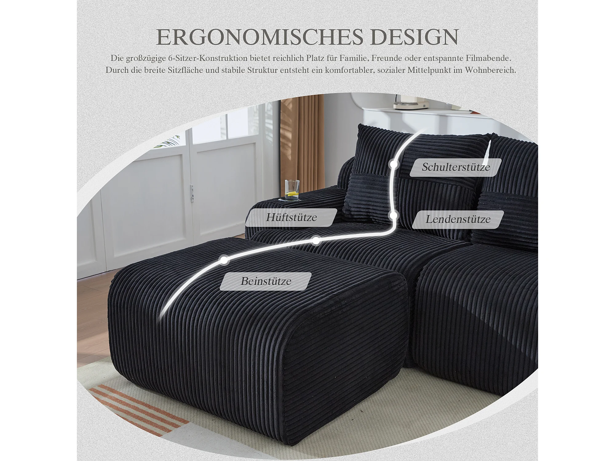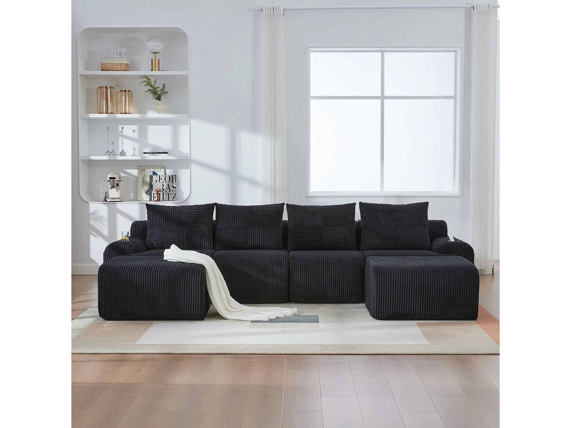 Canapé modulable 4 places - 333 x 174 x 80 cm - avec 2 poufs + porte-gobelets + poche de rangement - velours - noir