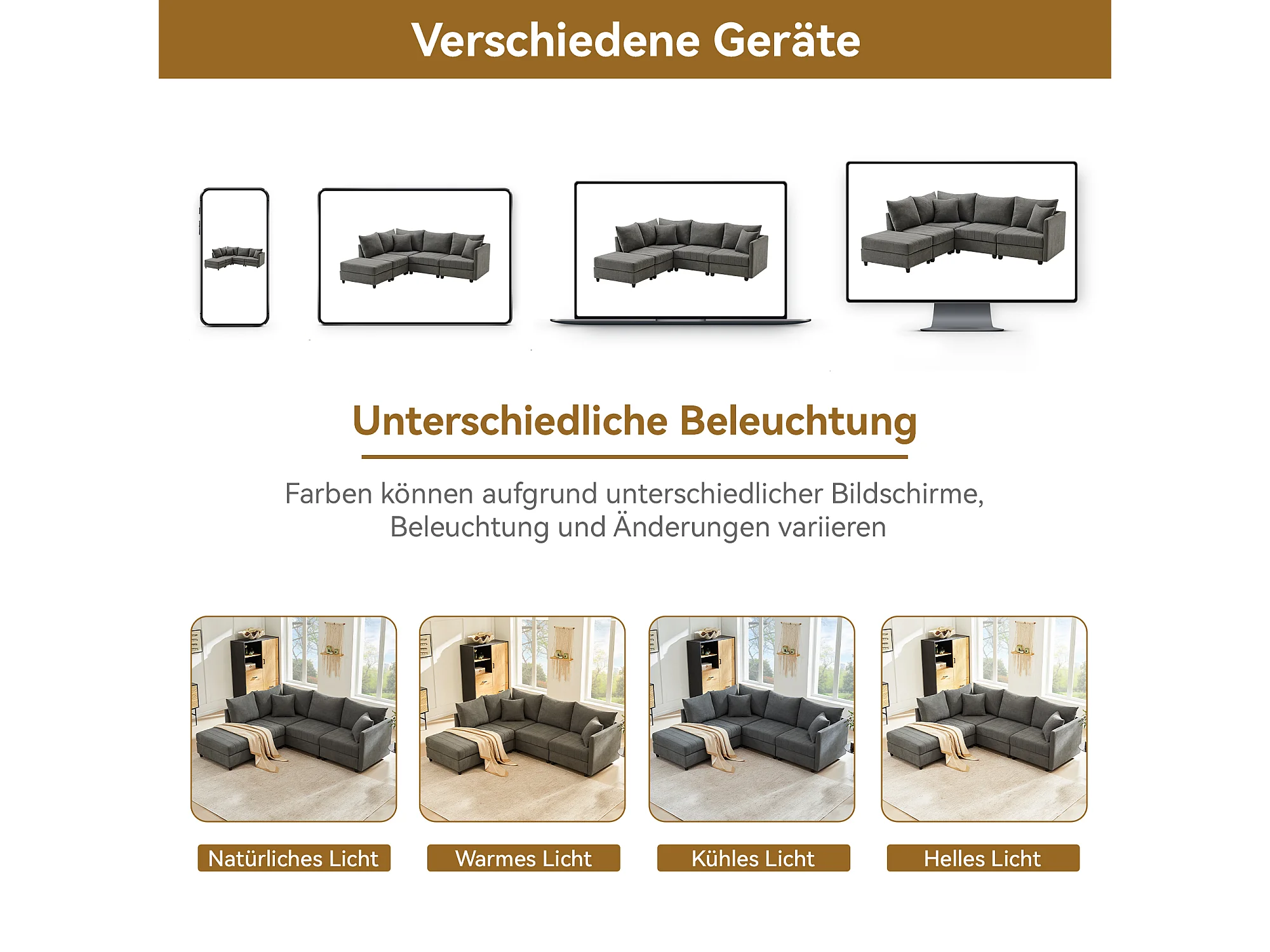 Canapé modulable 5 places - 220 x 194 x 85 cm - avec repose-pieds convertible - Coton et lin - gris