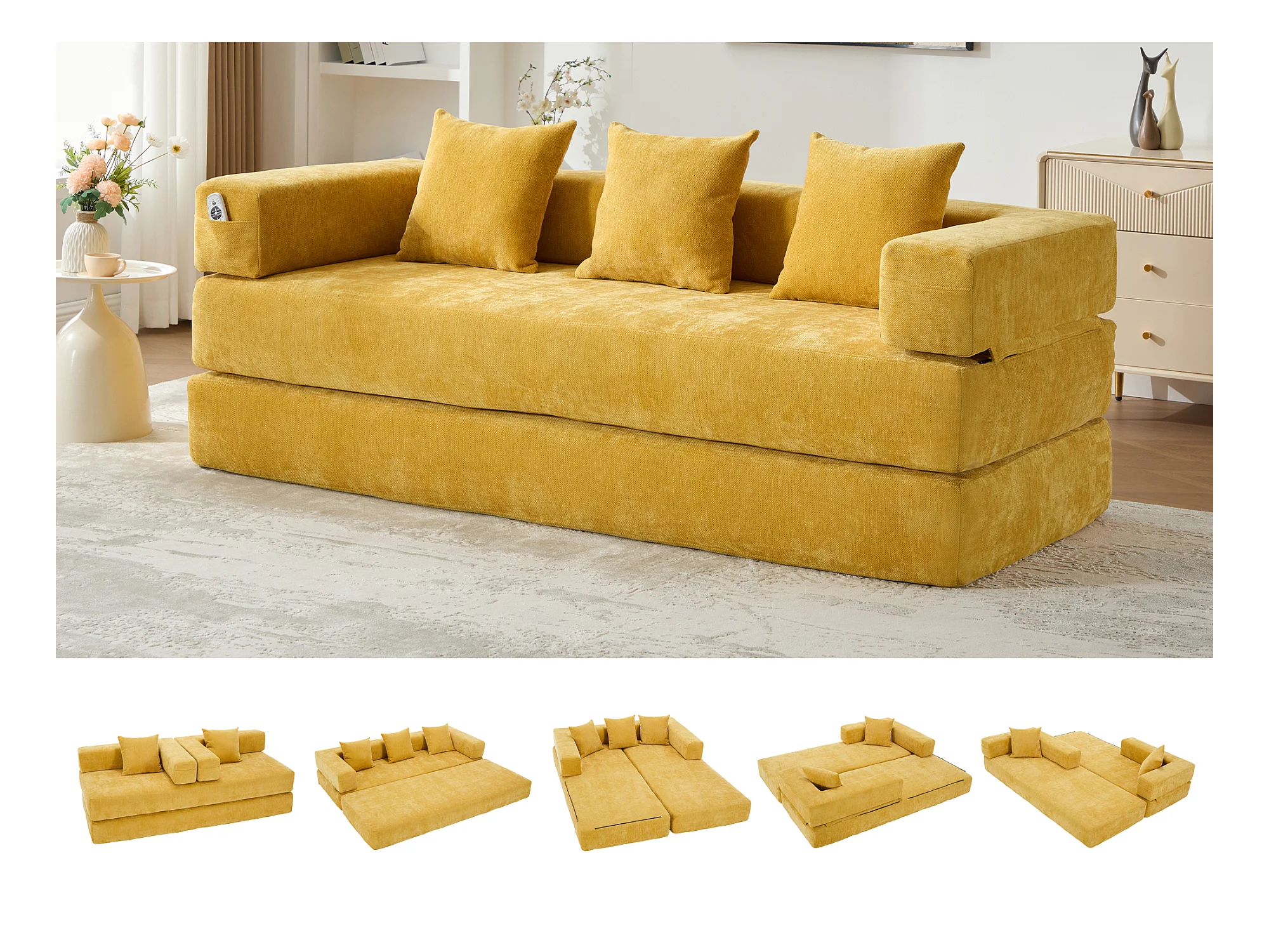Kaleido 1.0 - Canapé modulable en chenille jaune - Canapé convertible en plusieurs formes - 3 coussins inclus - Parfait pour salon, chambre et bureau