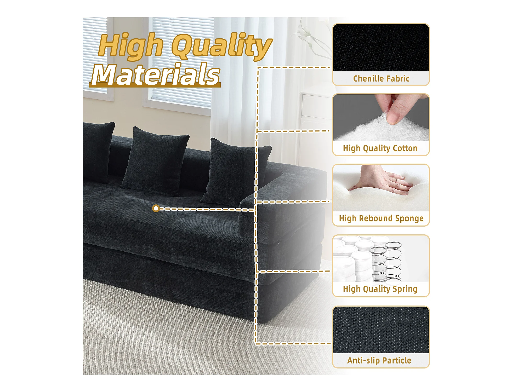 Kaleido 1.0 - Canapé modulable en chenille noir - Canapé convertible en plusieurs formes - 3 coussins inclus - Parfait pour salon, chambre et bureau