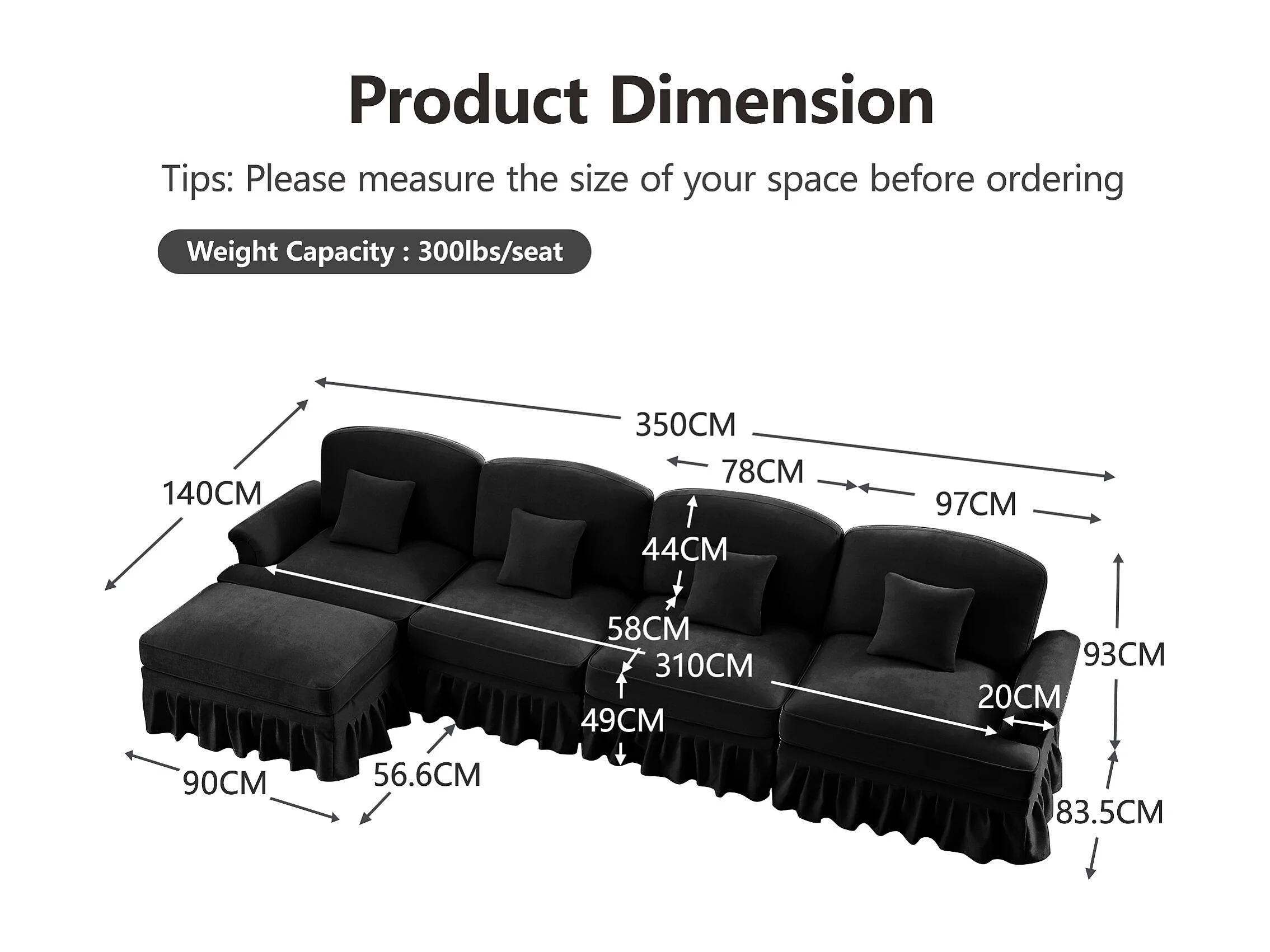 Canapé Modulable L Style MidCentury Jupe amovible Pieds fuselés chenille Noir