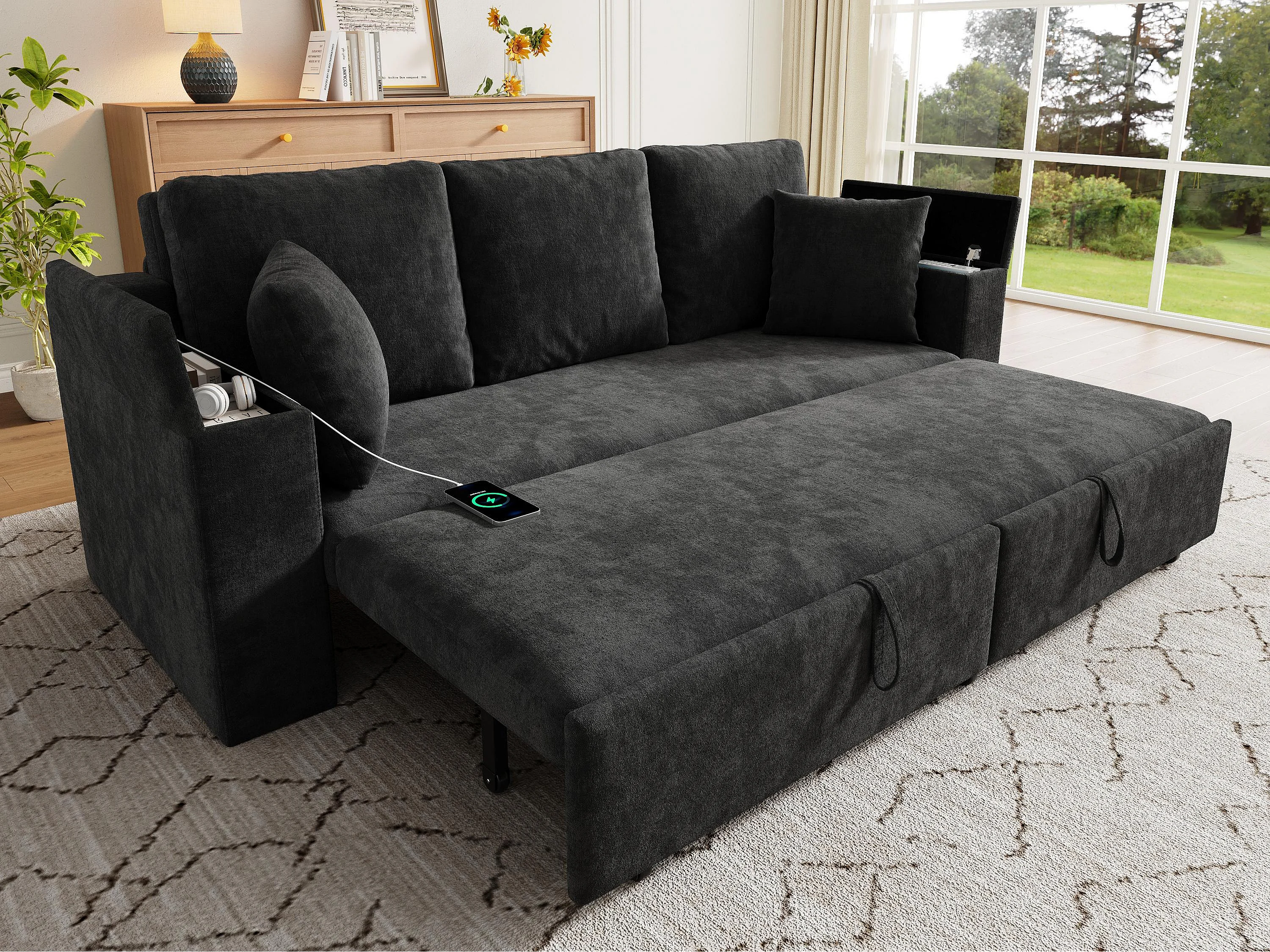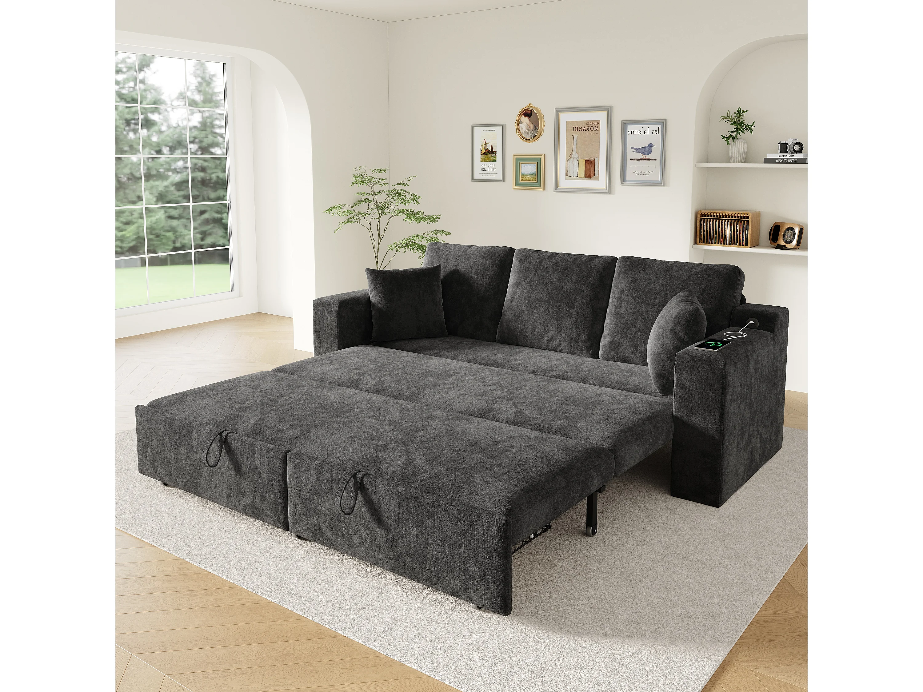 Canapé multifonctionnel 3 en 1 - 3 places - avec espace de rangement - avec port de chargement USB - Tissu chenille - gris