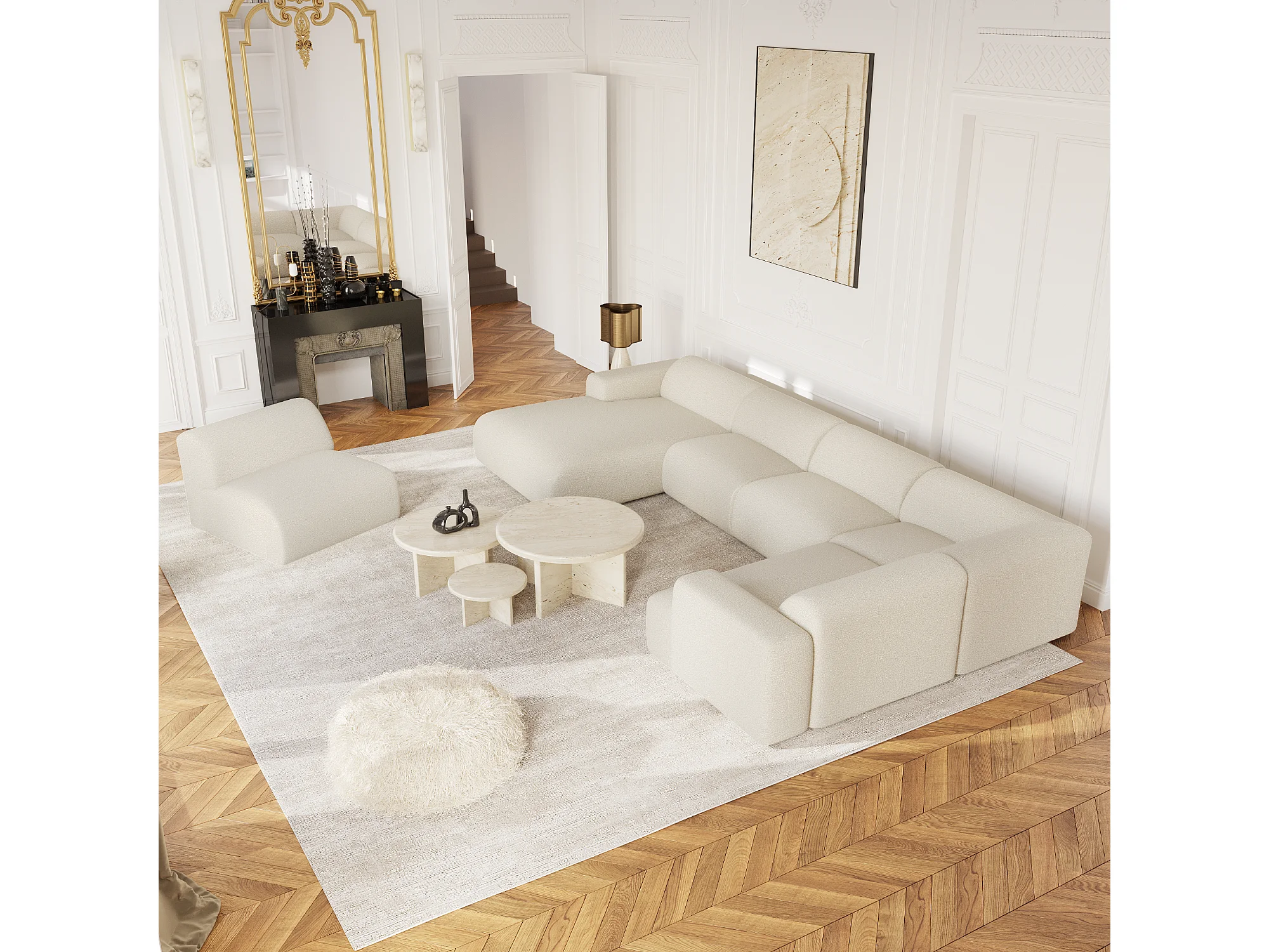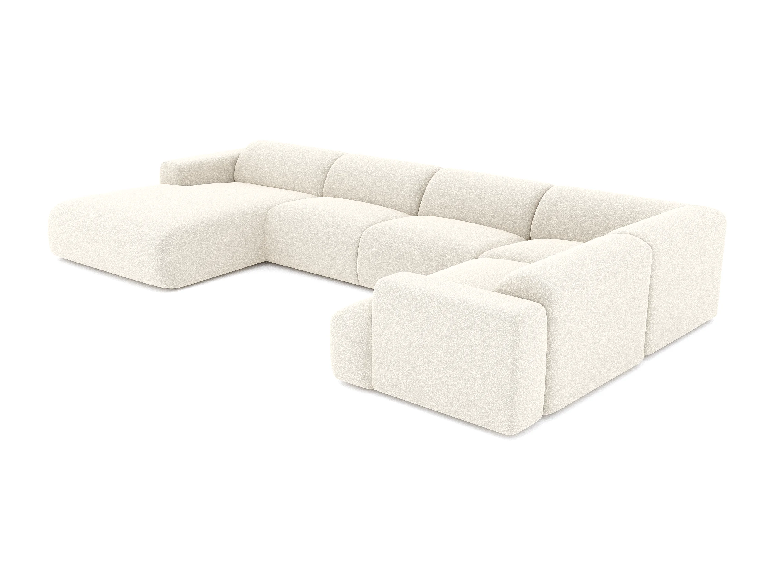Canapé panoramique 7 places angle gauche en bouclette XXL crème MYRA