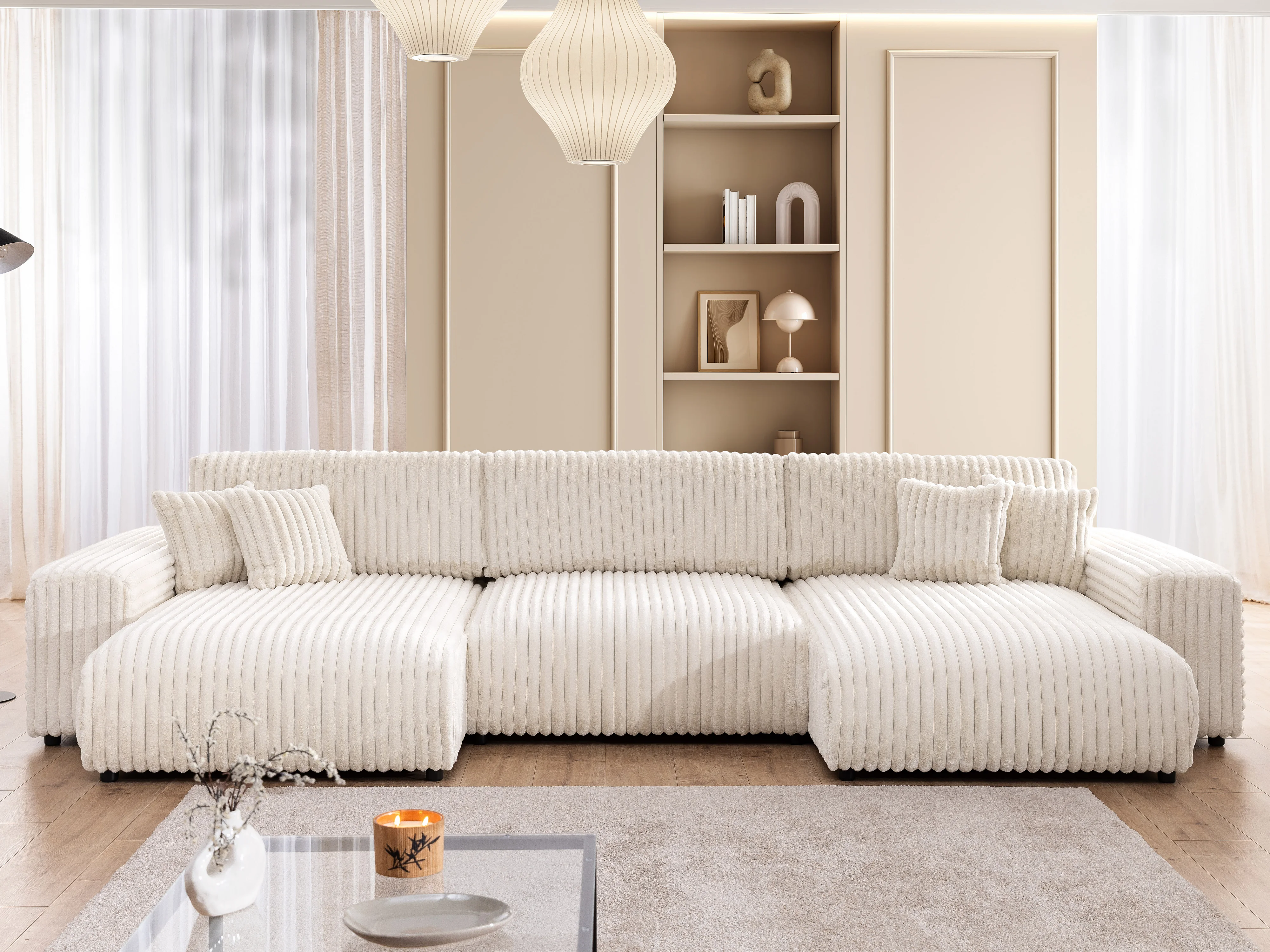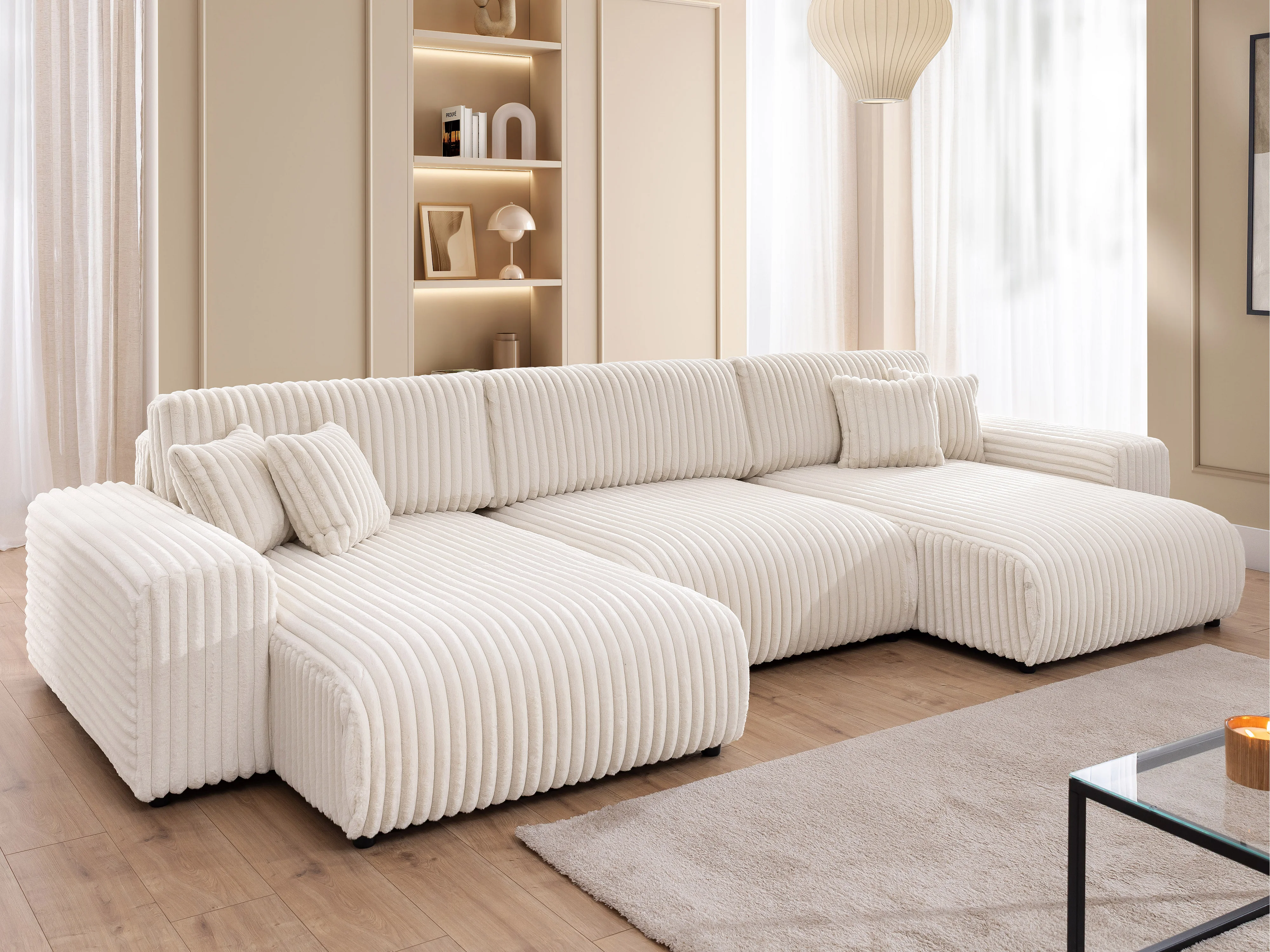 Canapé panoramique avec fonction couchage et coffre de rangement en velours côtelé pelucheux beige clair MOLLIS