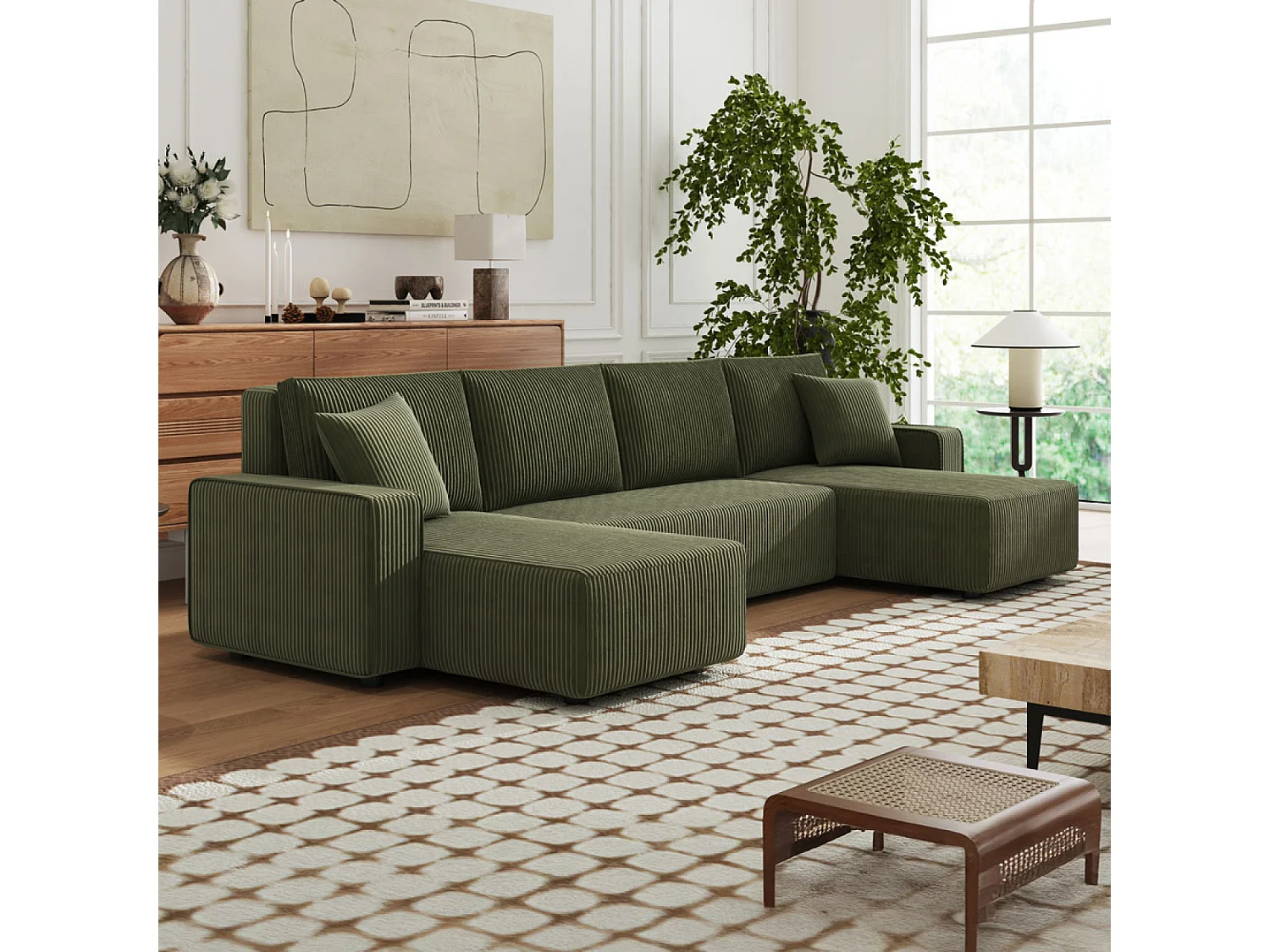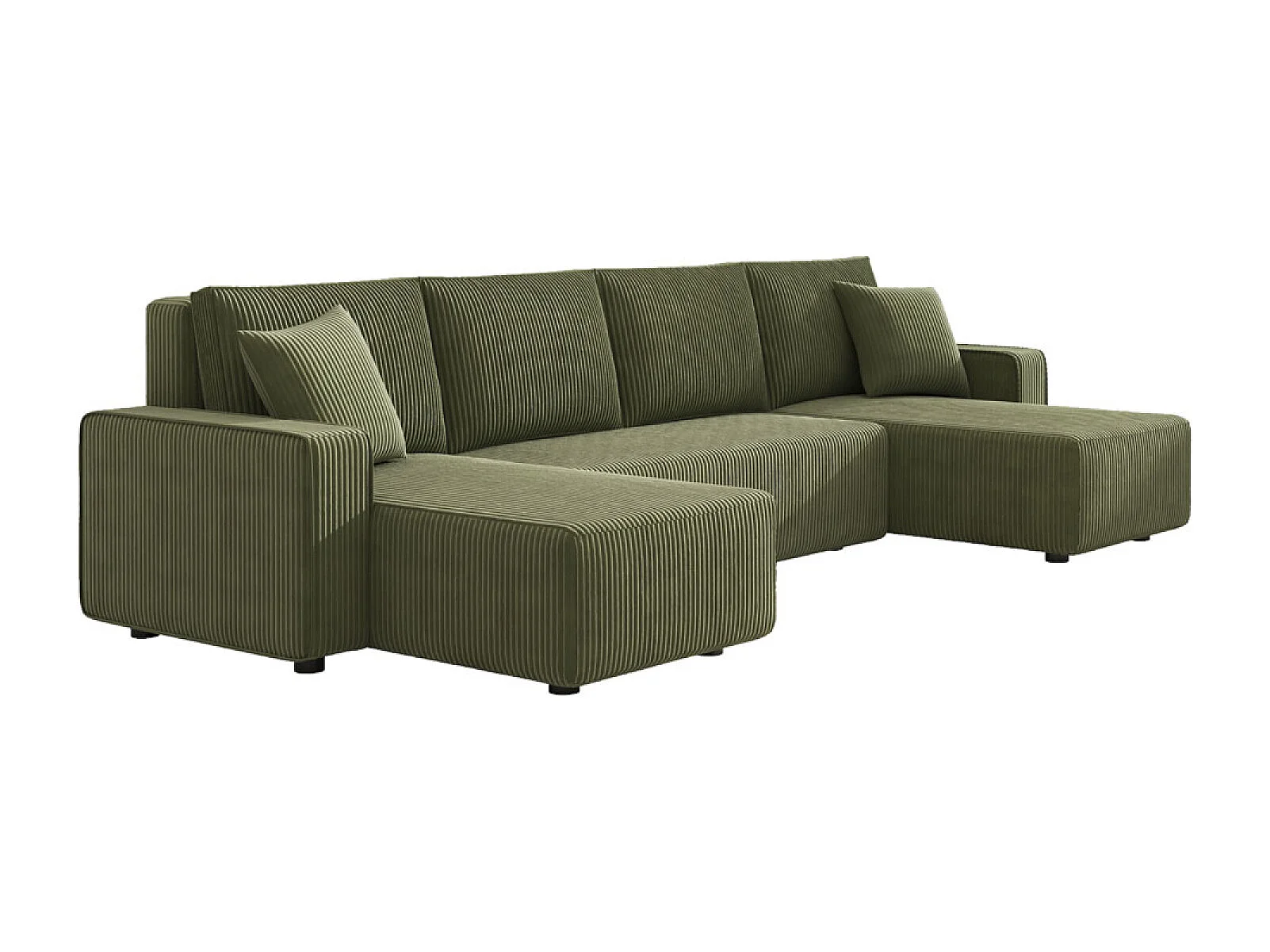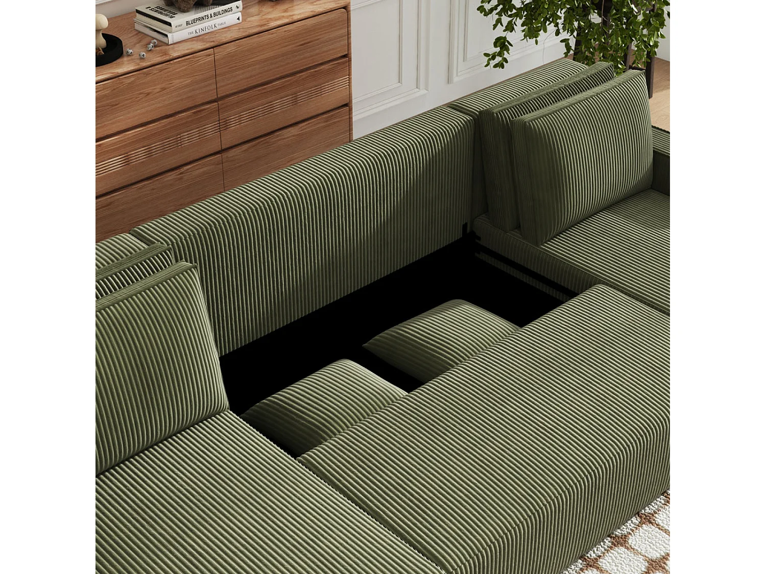 Canapé panoramique convertible 6 places avec coffre en velours côtelé vert SALISBURY