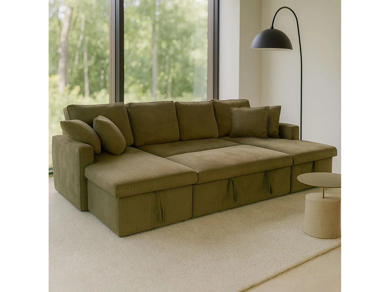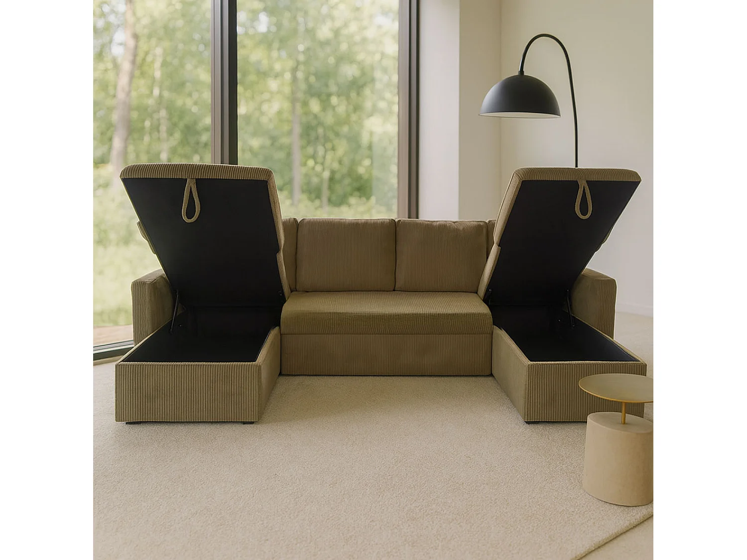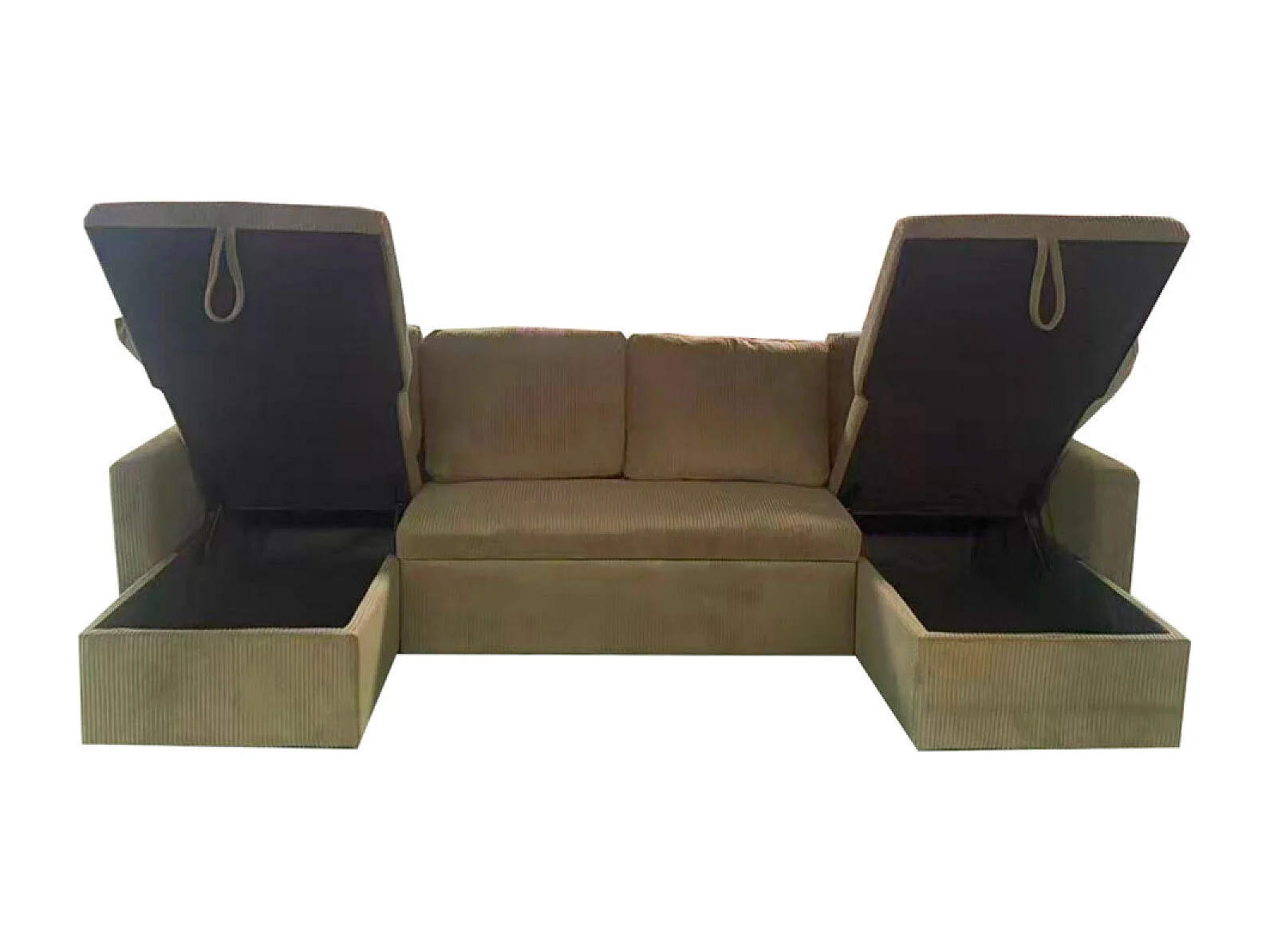 Canapé panoramique convertible avec coffres 4 places en velours côtelé vert MAHÉ