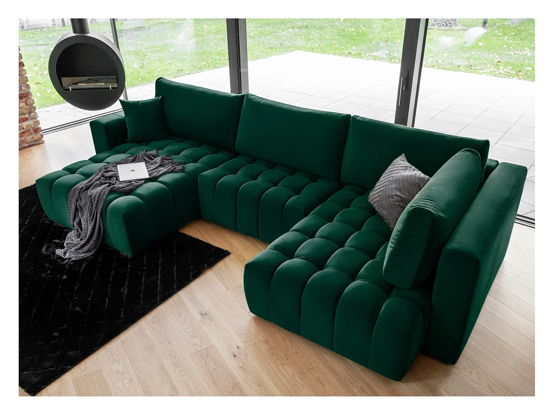 Canapé panoramique convertible design capitonné velours vert foncé méridienne gauche Boston 350cm