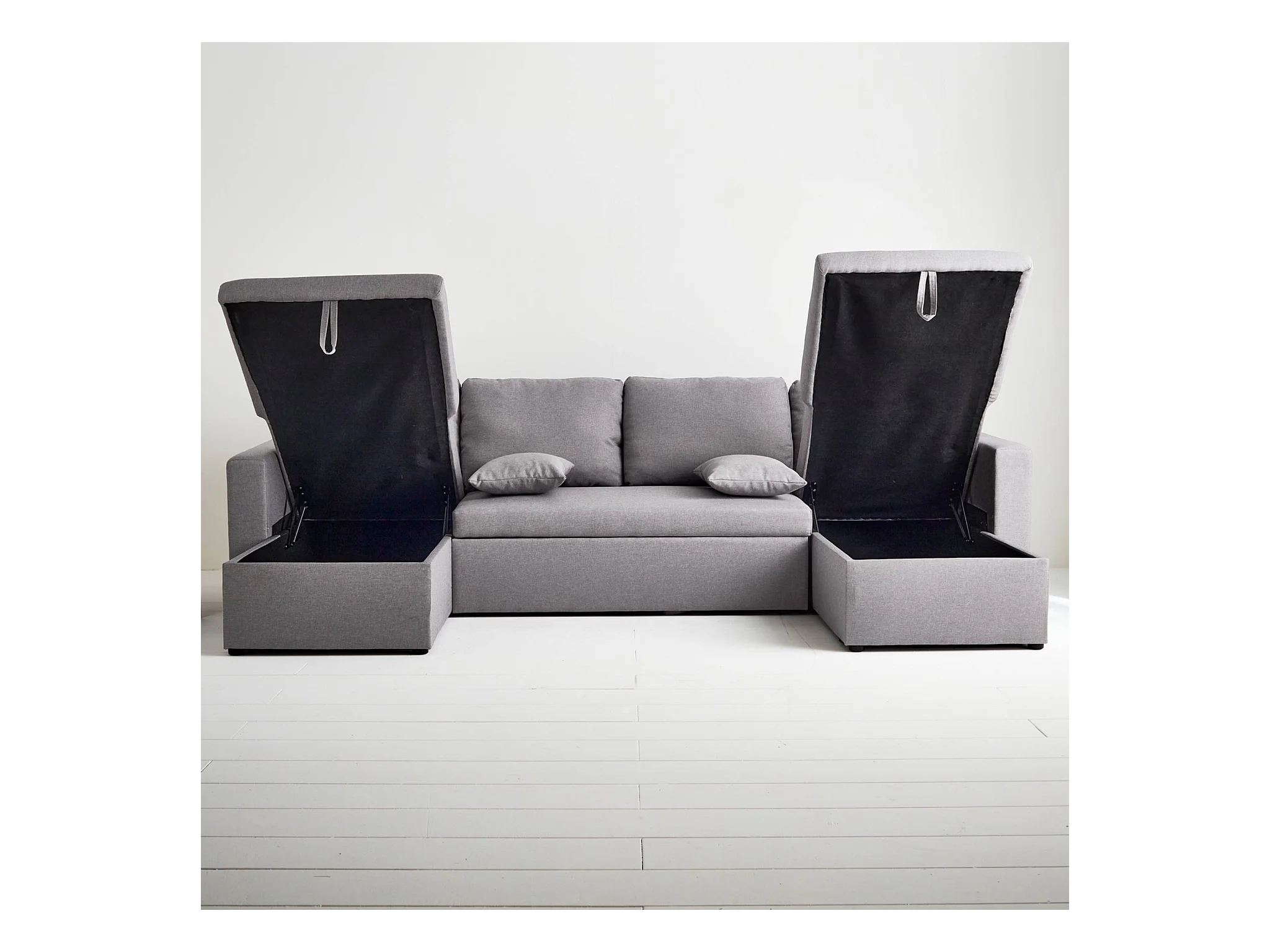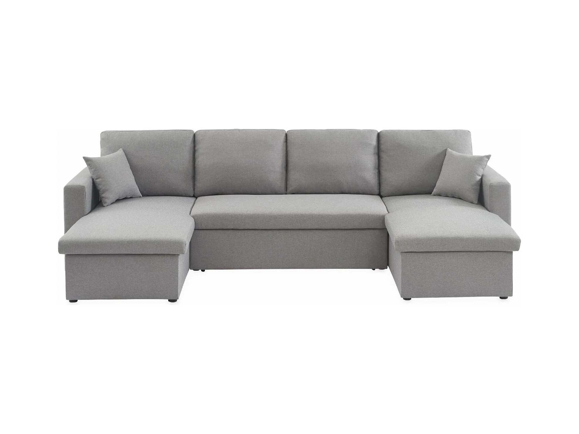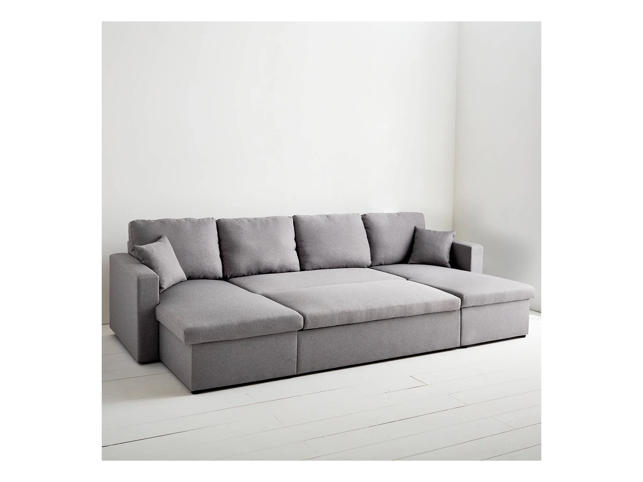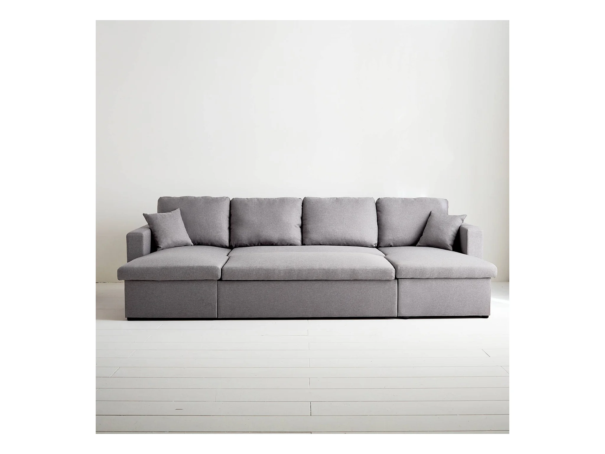 Canapé panoramique convertible en tissu gris clair. 4 places. coffre rangement. lit modulable