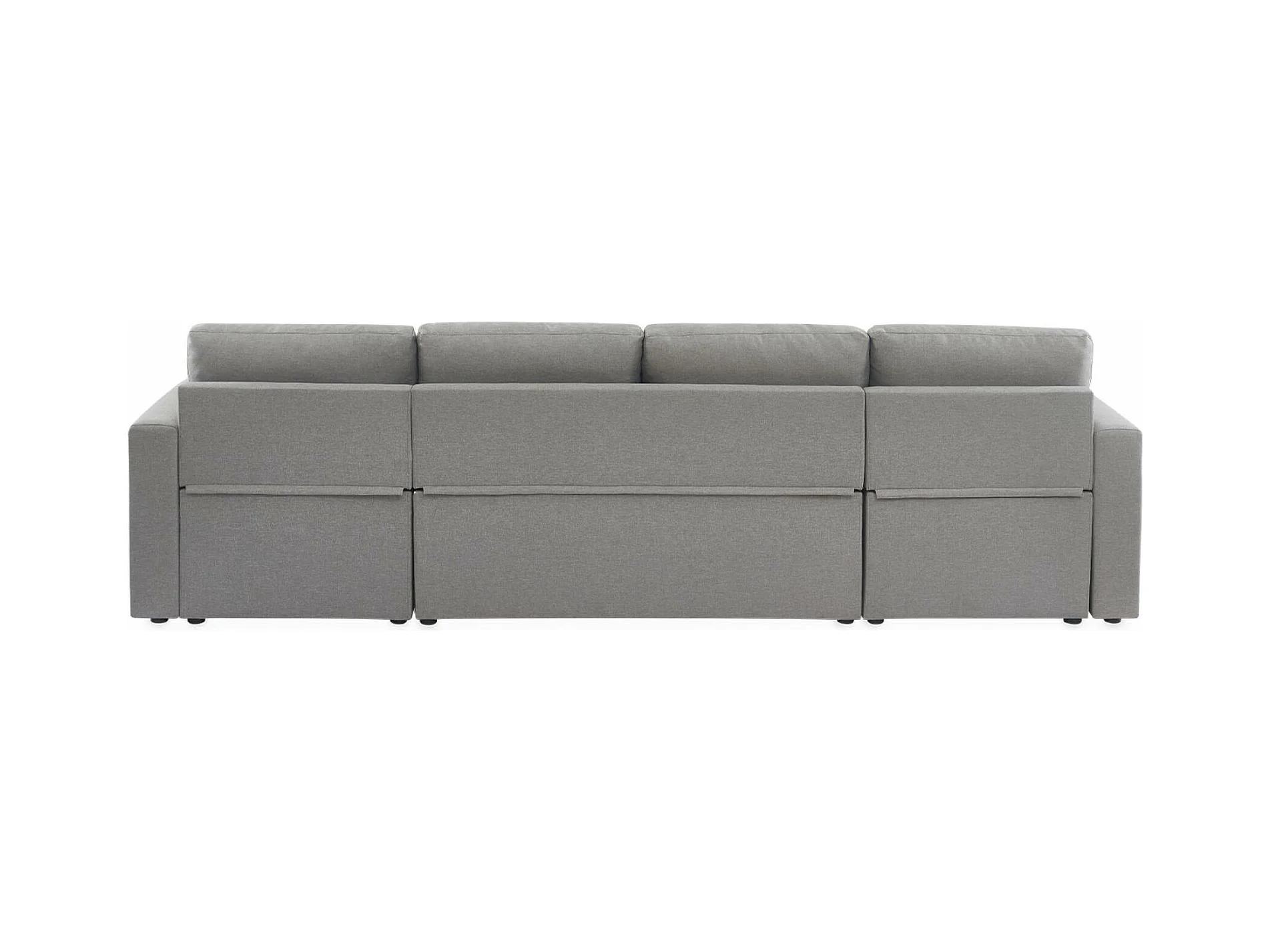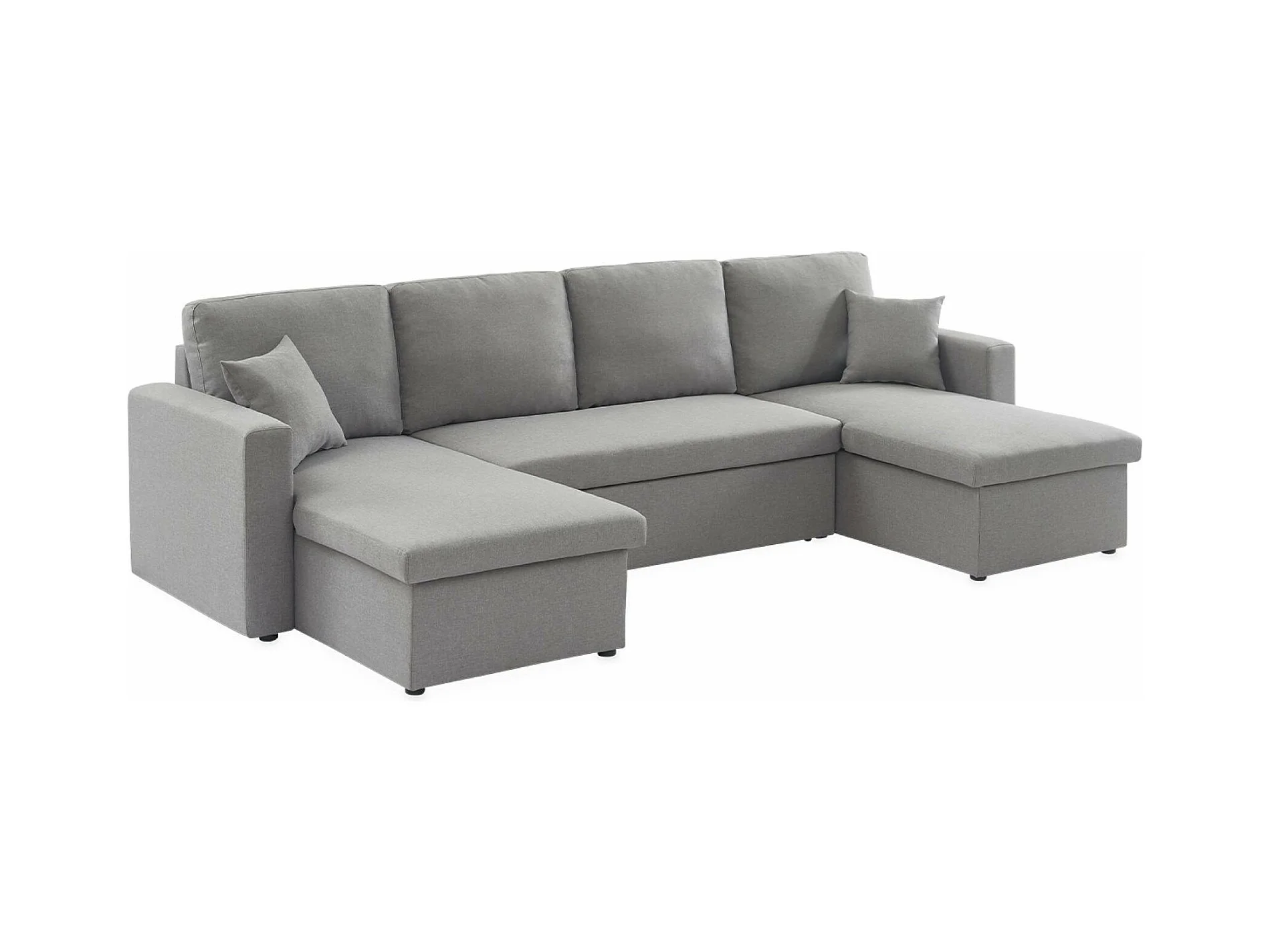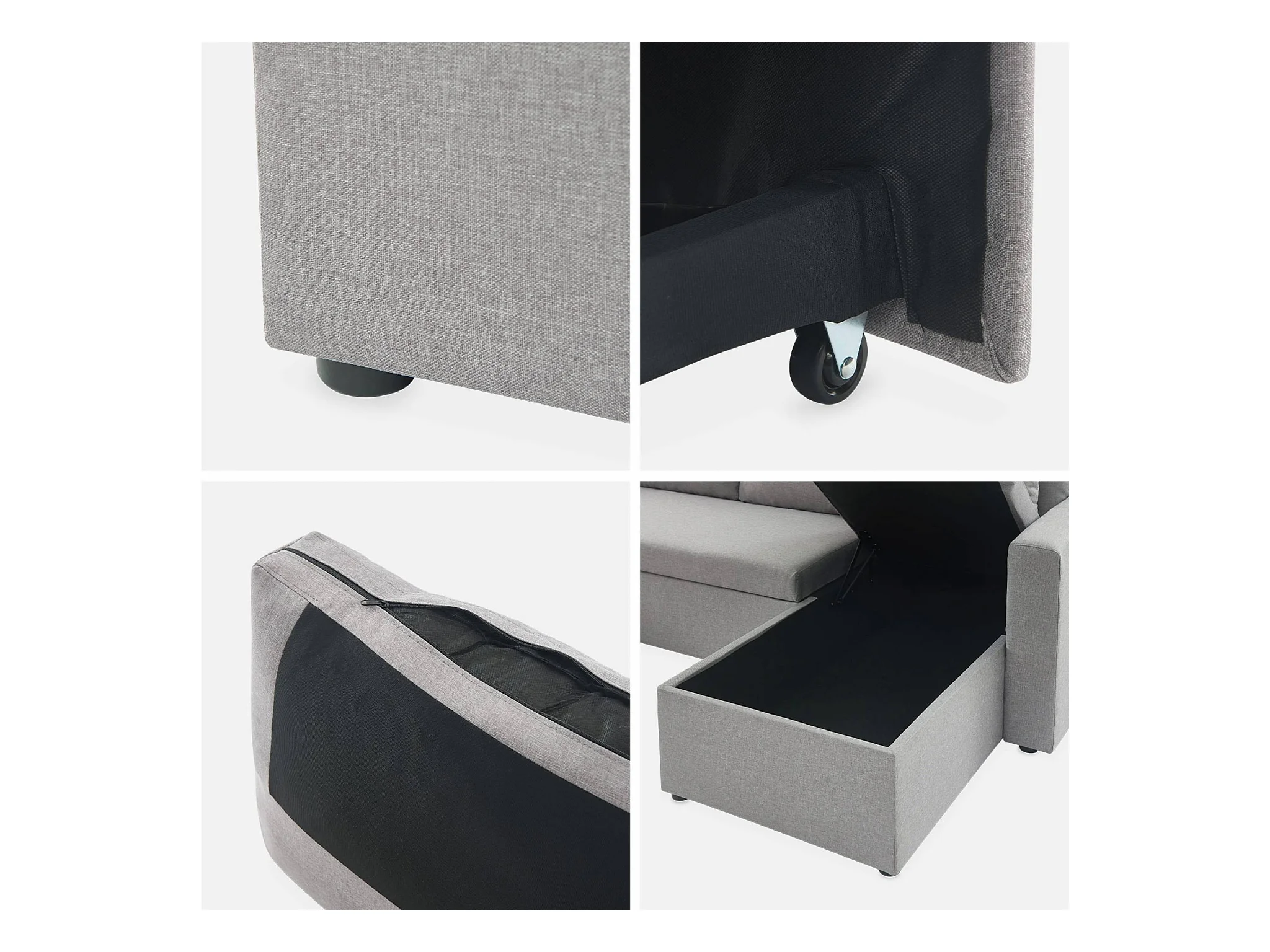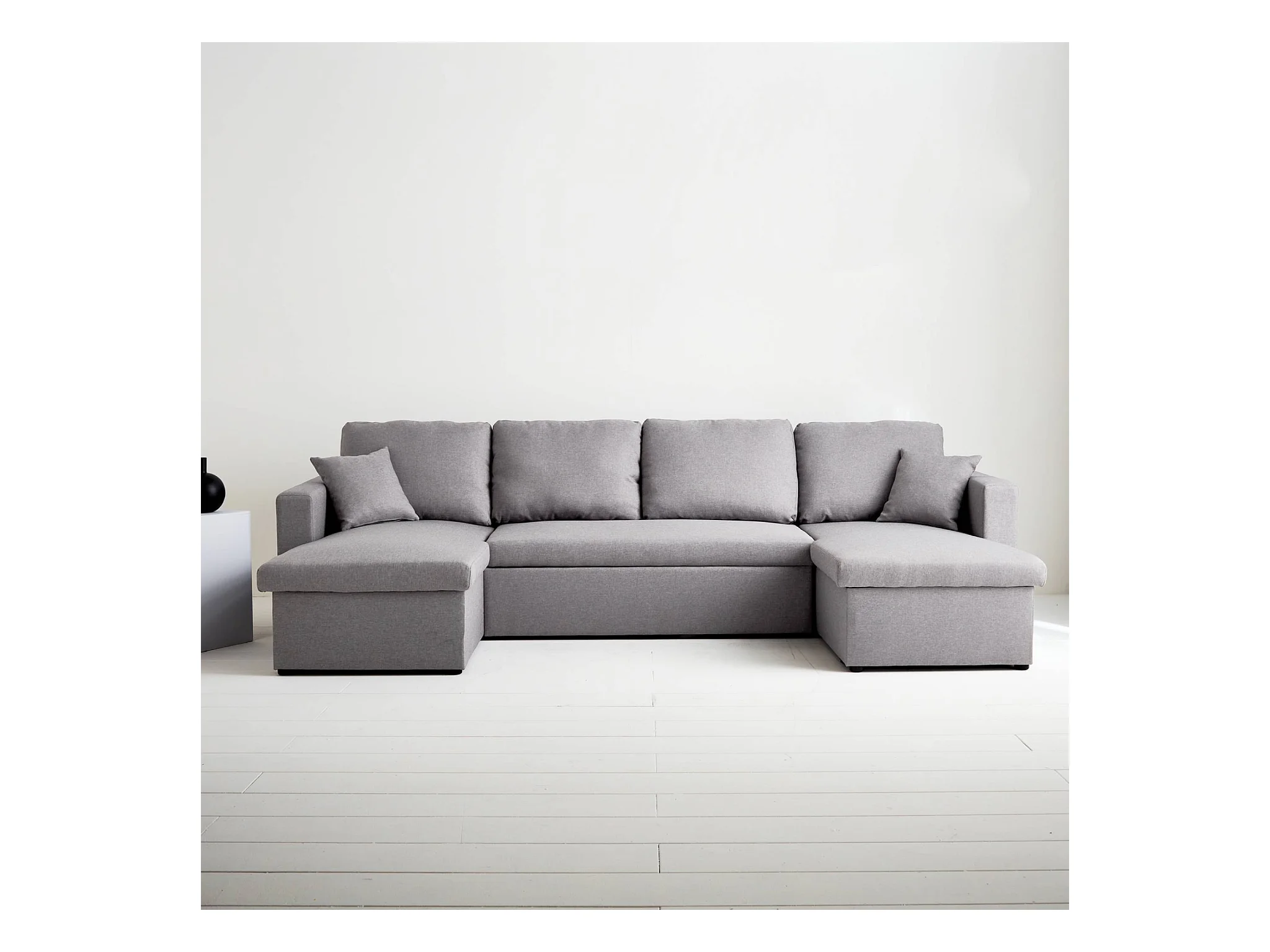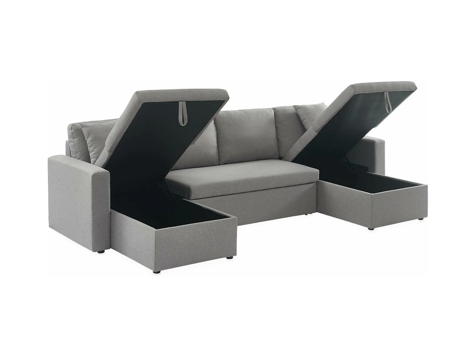 Canapé panoramique convertible en tissu gris clair. 4 places. coffre rangement. lit modulable