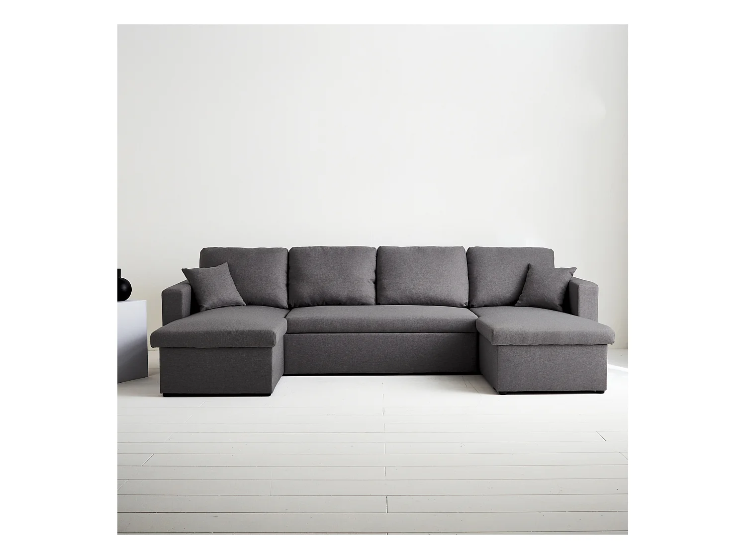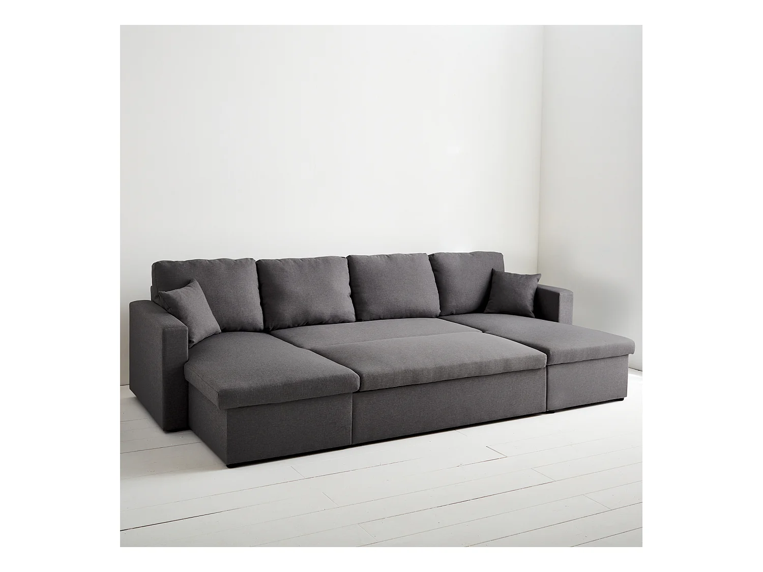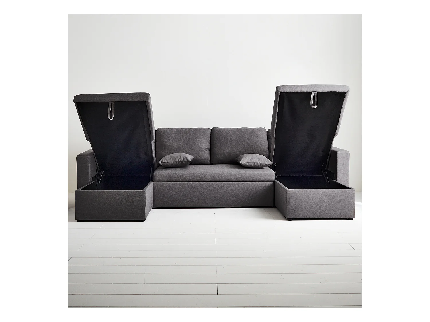 Canapé panoramique convertible en tissu gris foncé. 4 places. coffre rangement. lit modulable
