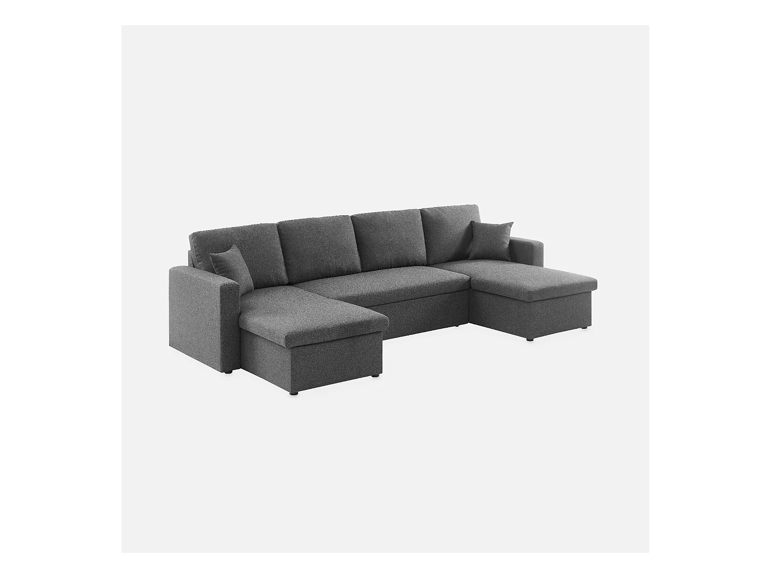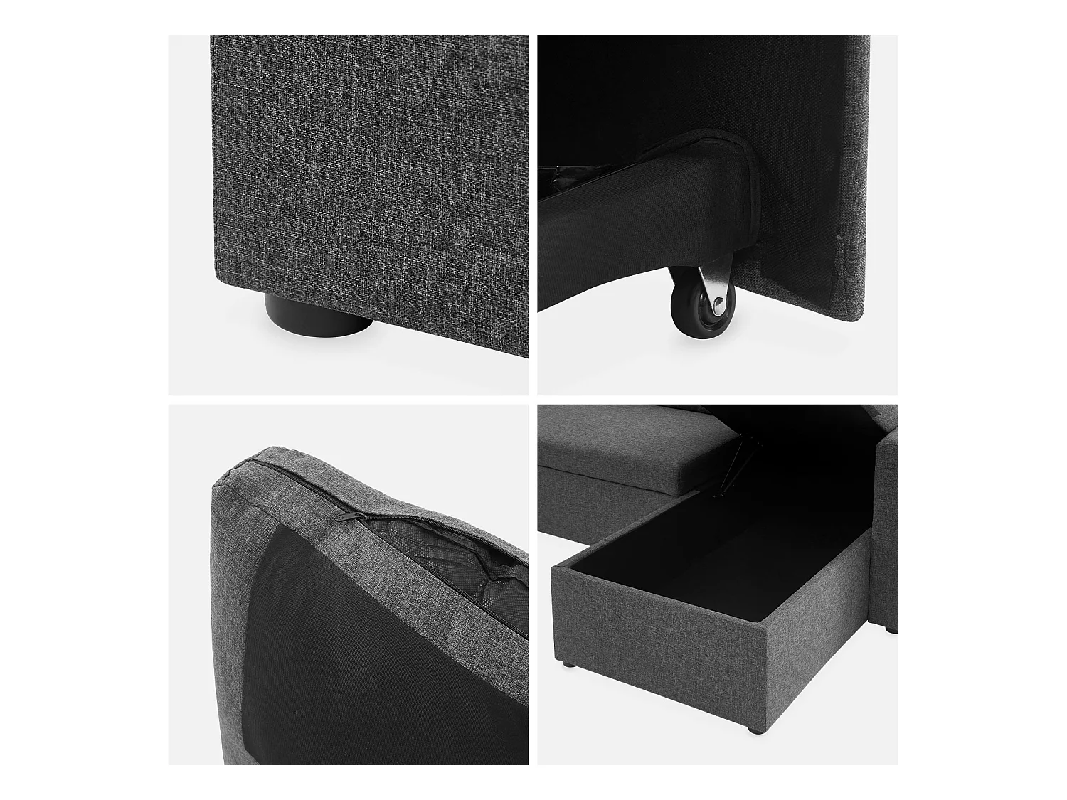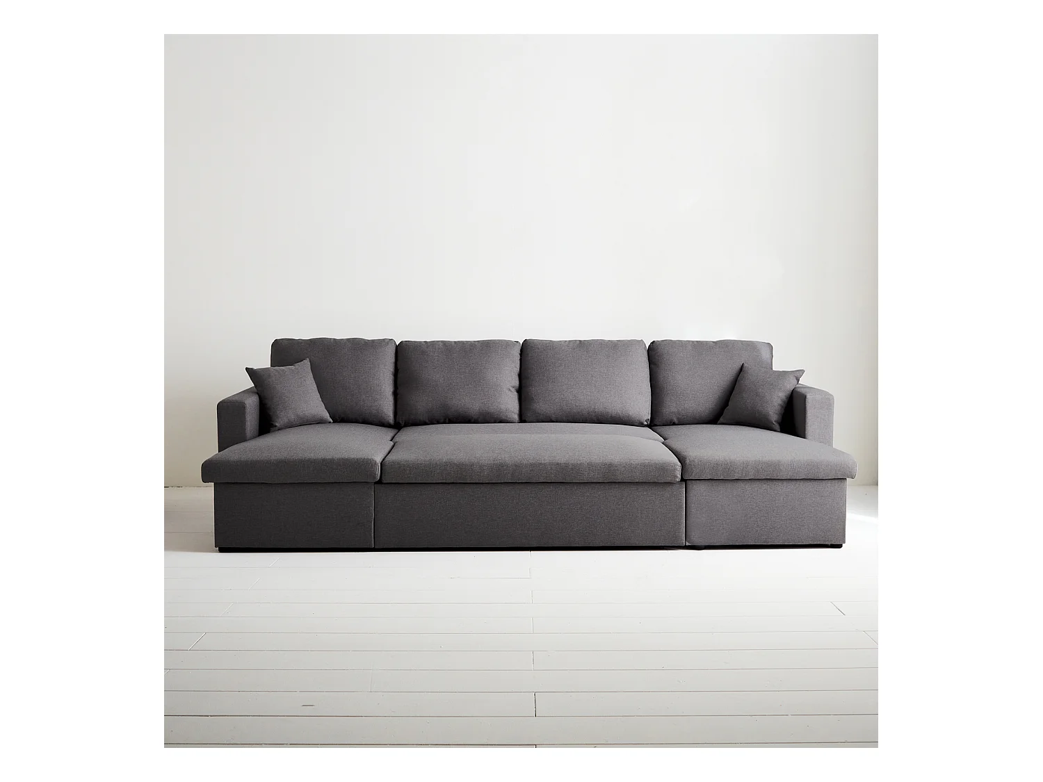 Canapé panoramique convertible en tissu gris foncé. 4 places. coffre rangement. lit modulable