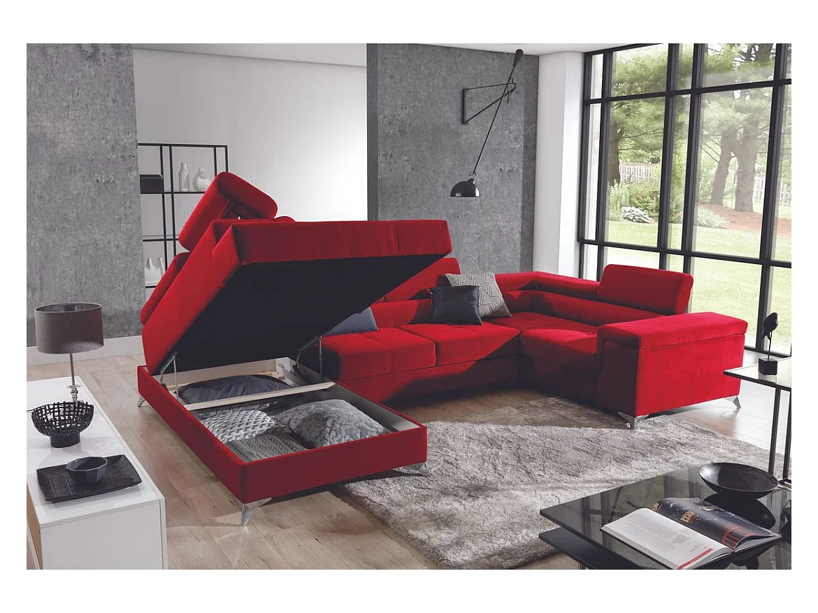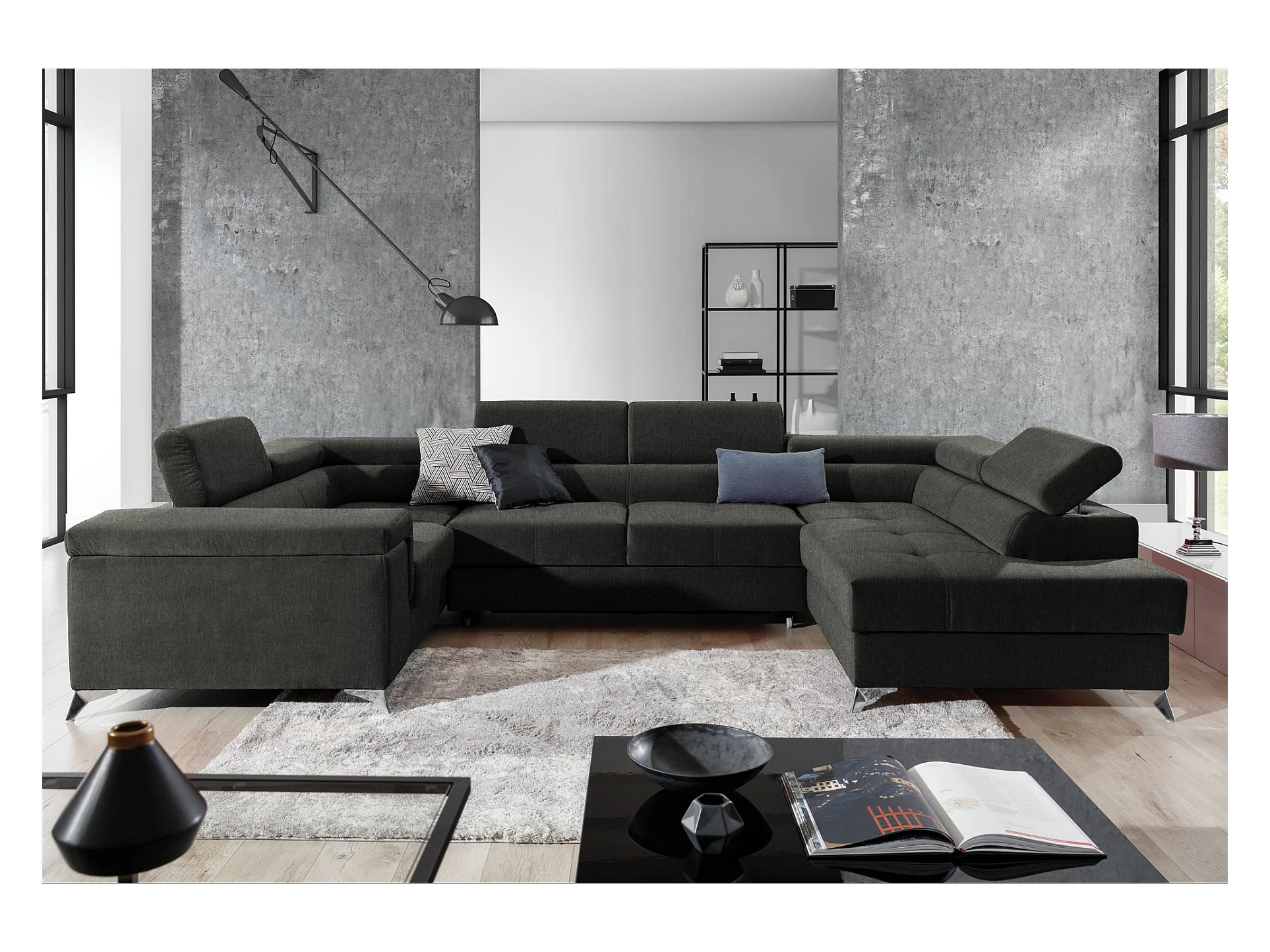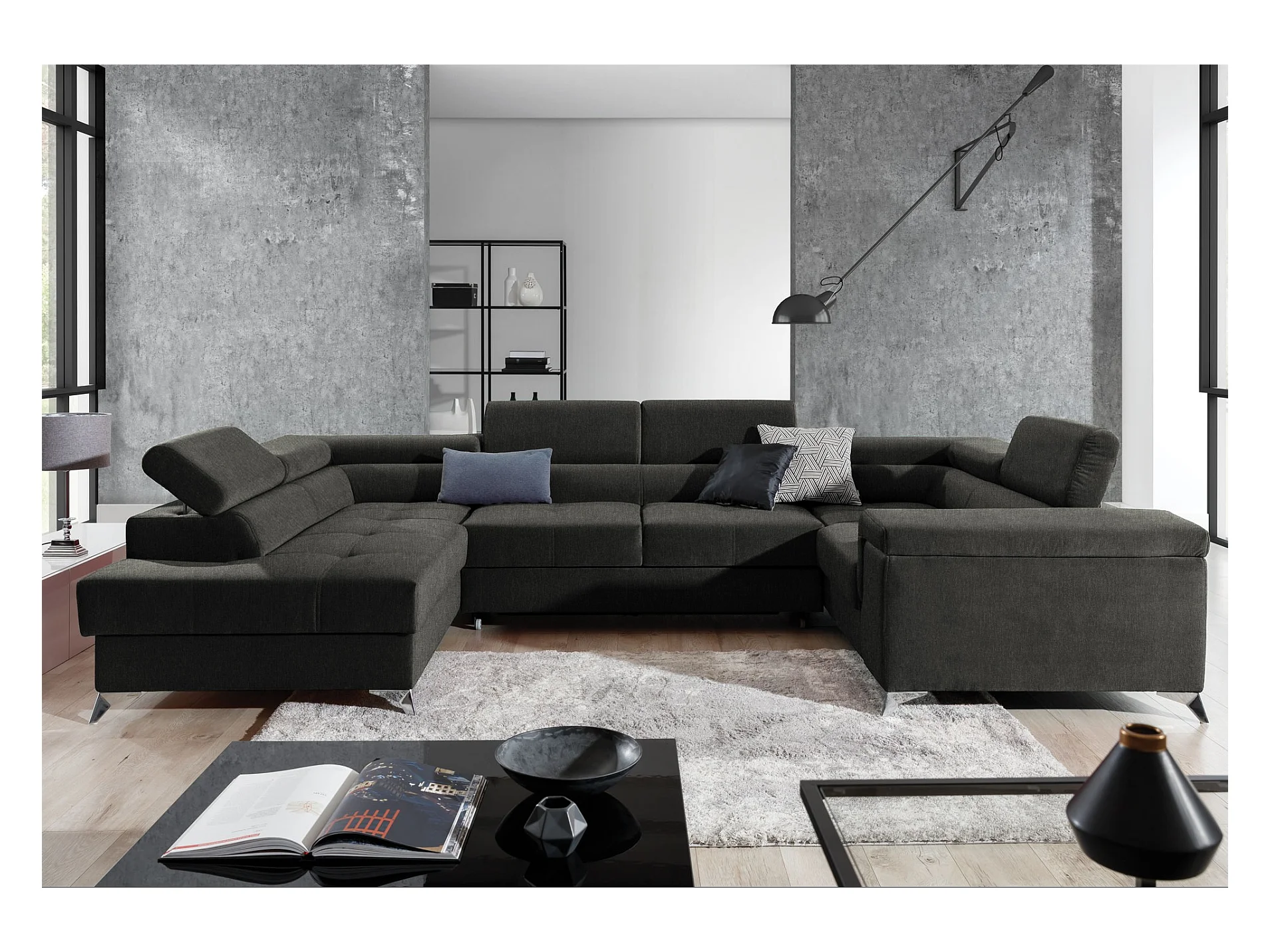 Canapé panoramique convertible tissu anthracite avec coffre de rangement Triano 342cm-Coffre de rangement à gauche