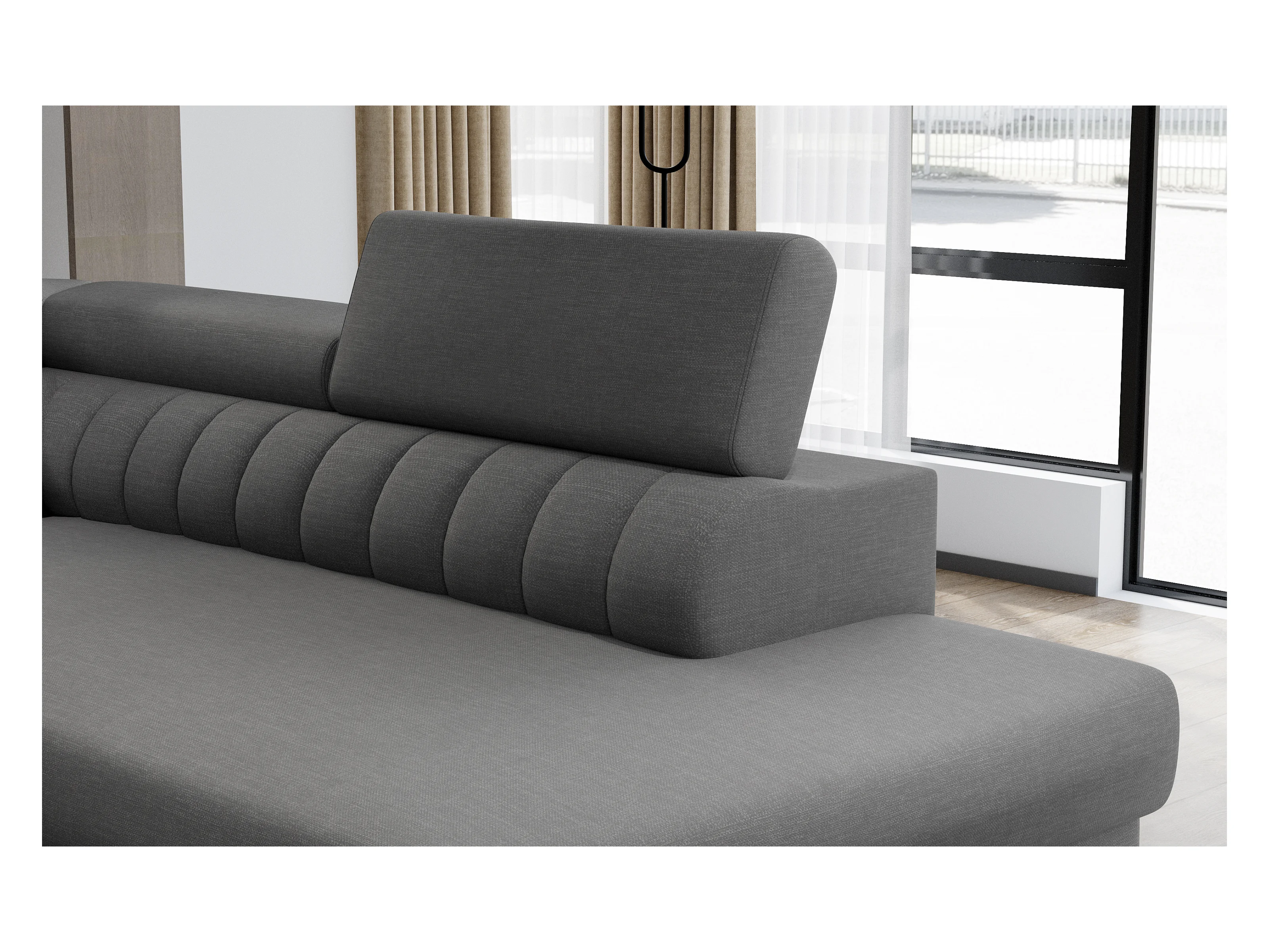 Canapé panoramique convertible tissu chocolat avec coffre de rangement Louve 340cm-Coffre de rangement à droite