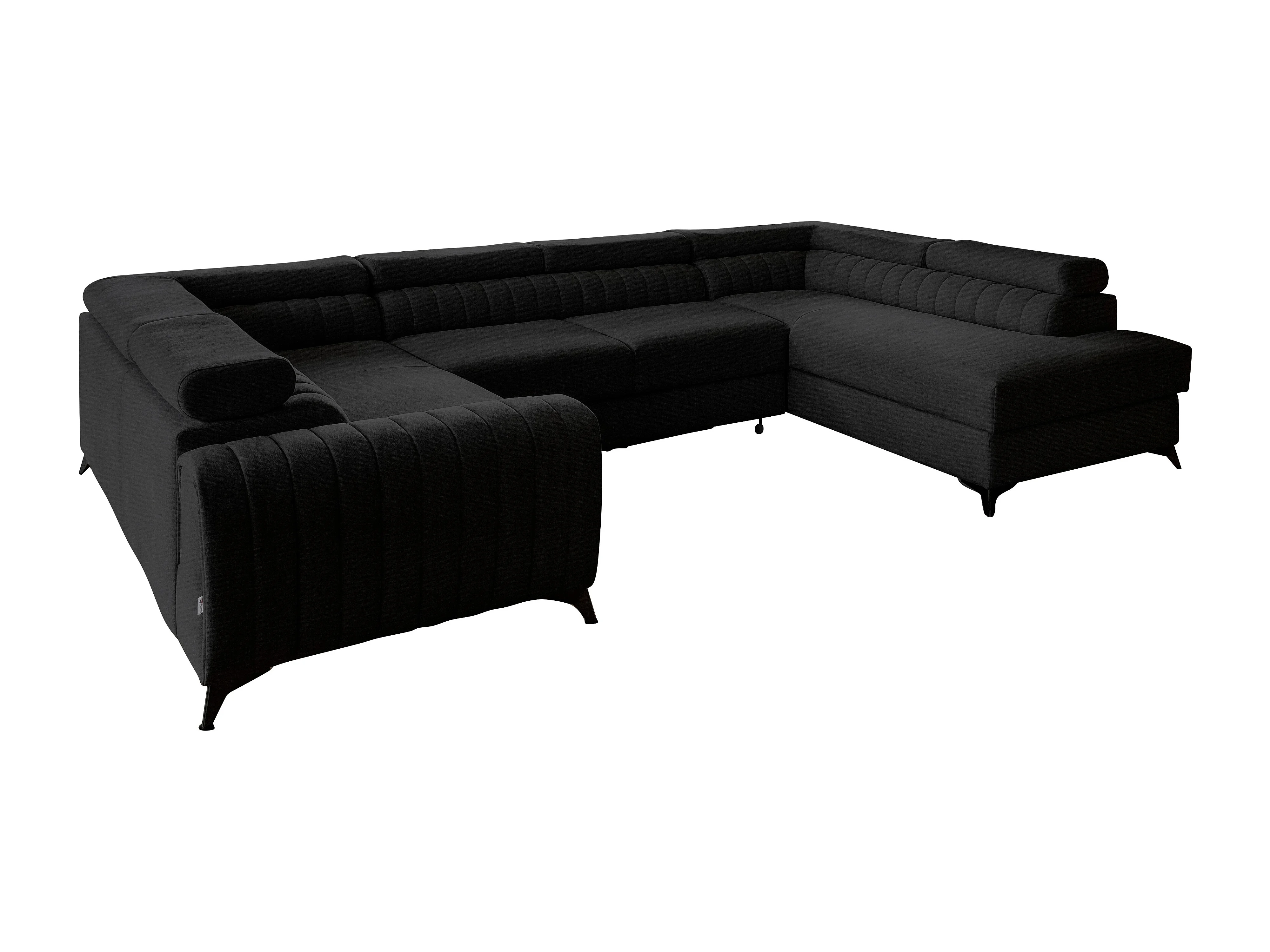 Canapé panoramique convertible LOUVE tissu - Rangement et têtières réglables-Noir chiné-Coffre à droite