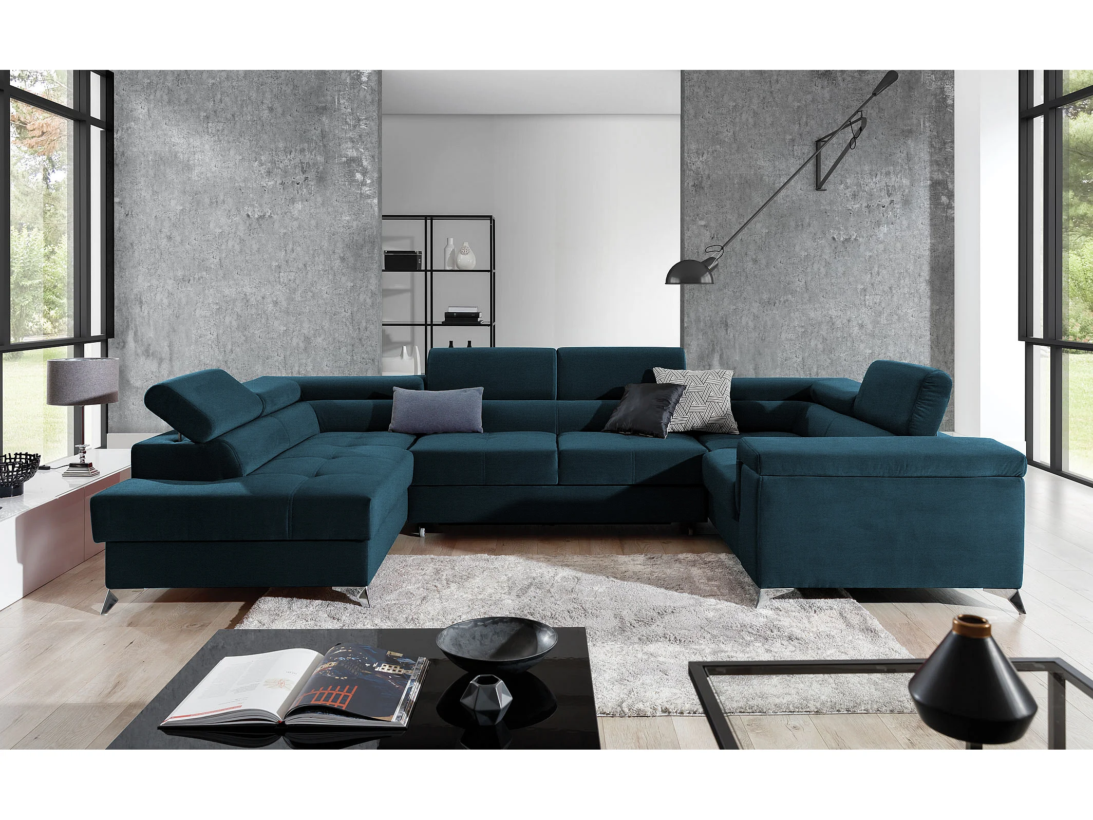 Canapé panoramique convertible TRIANO velours - têtières réglables-Bleu foncé-Coffre à gauche