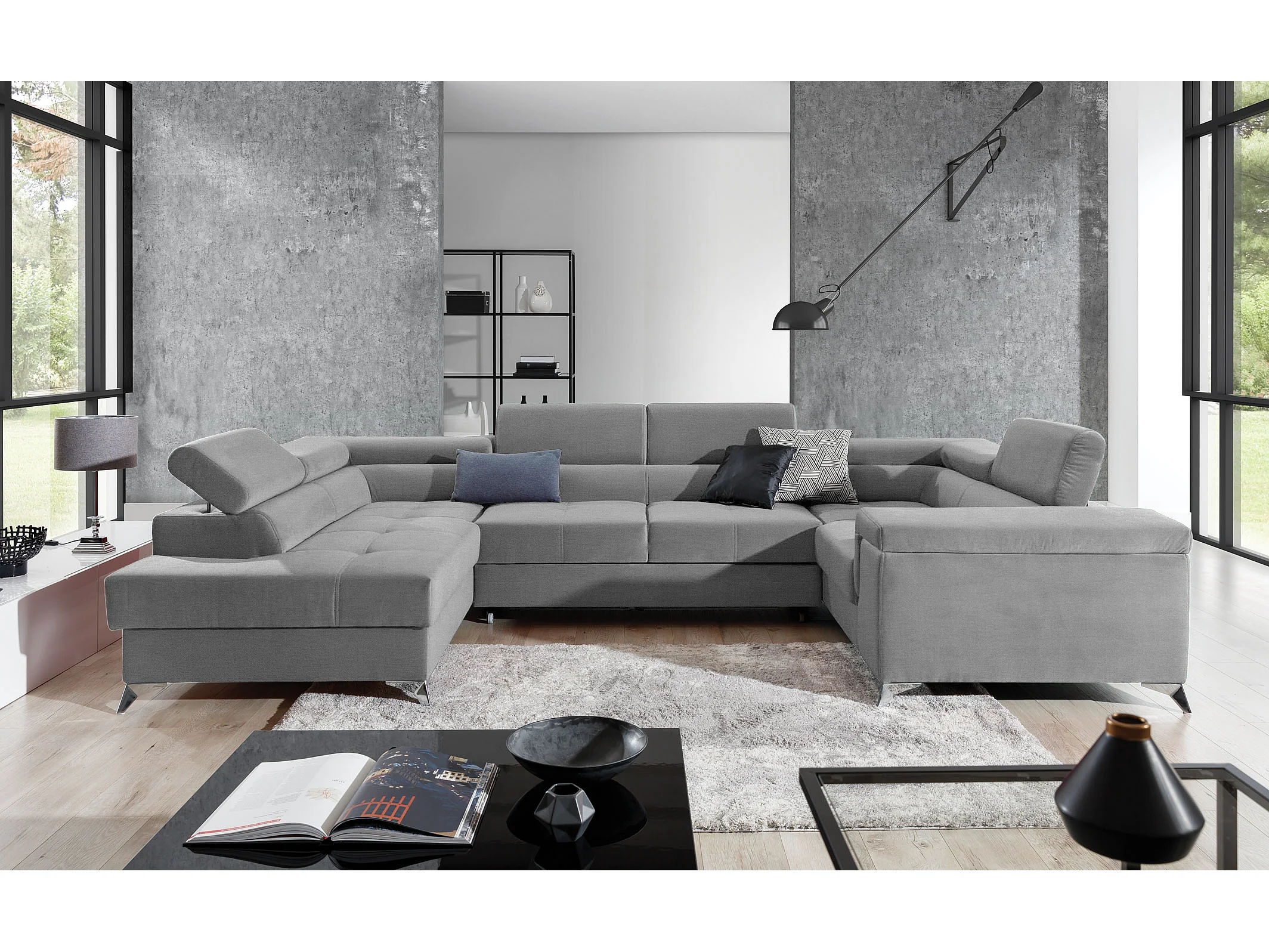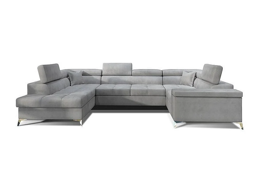 Canapé panoramique convertible TRIANO velours - têtières réglables-Gris perle-Coffre à gauche