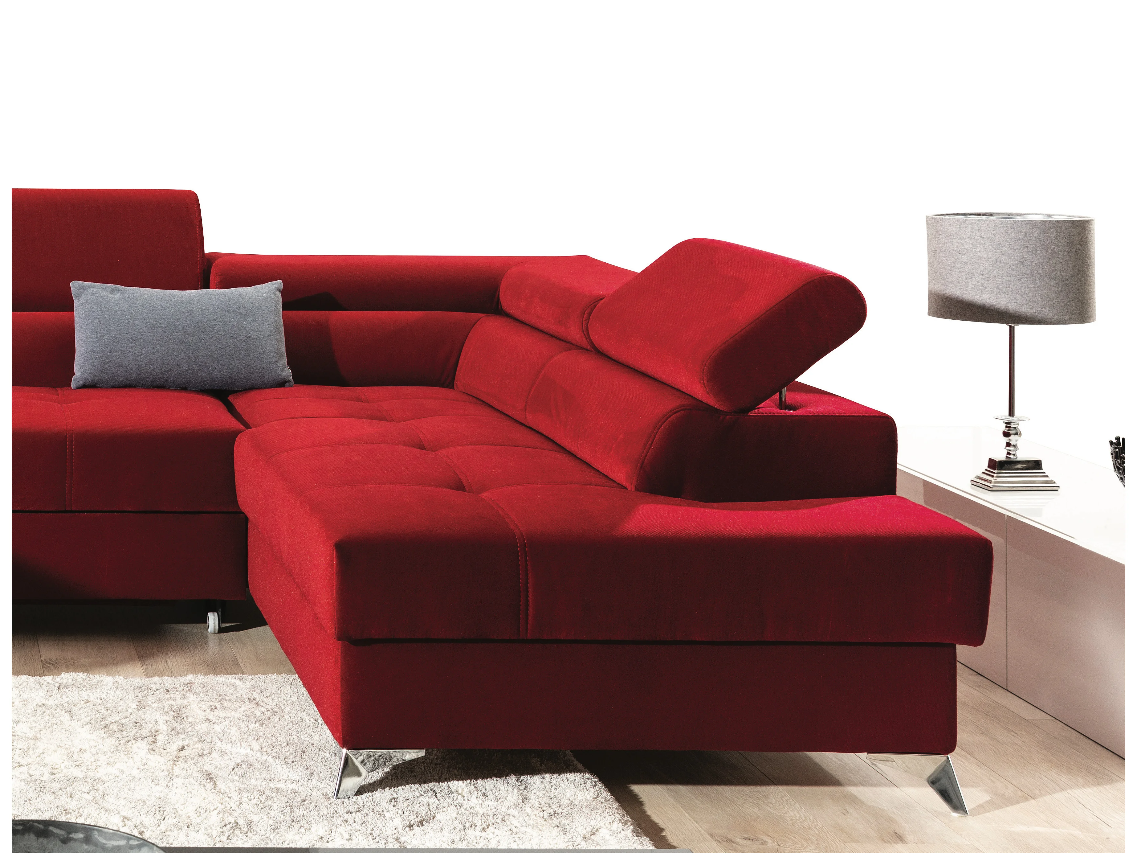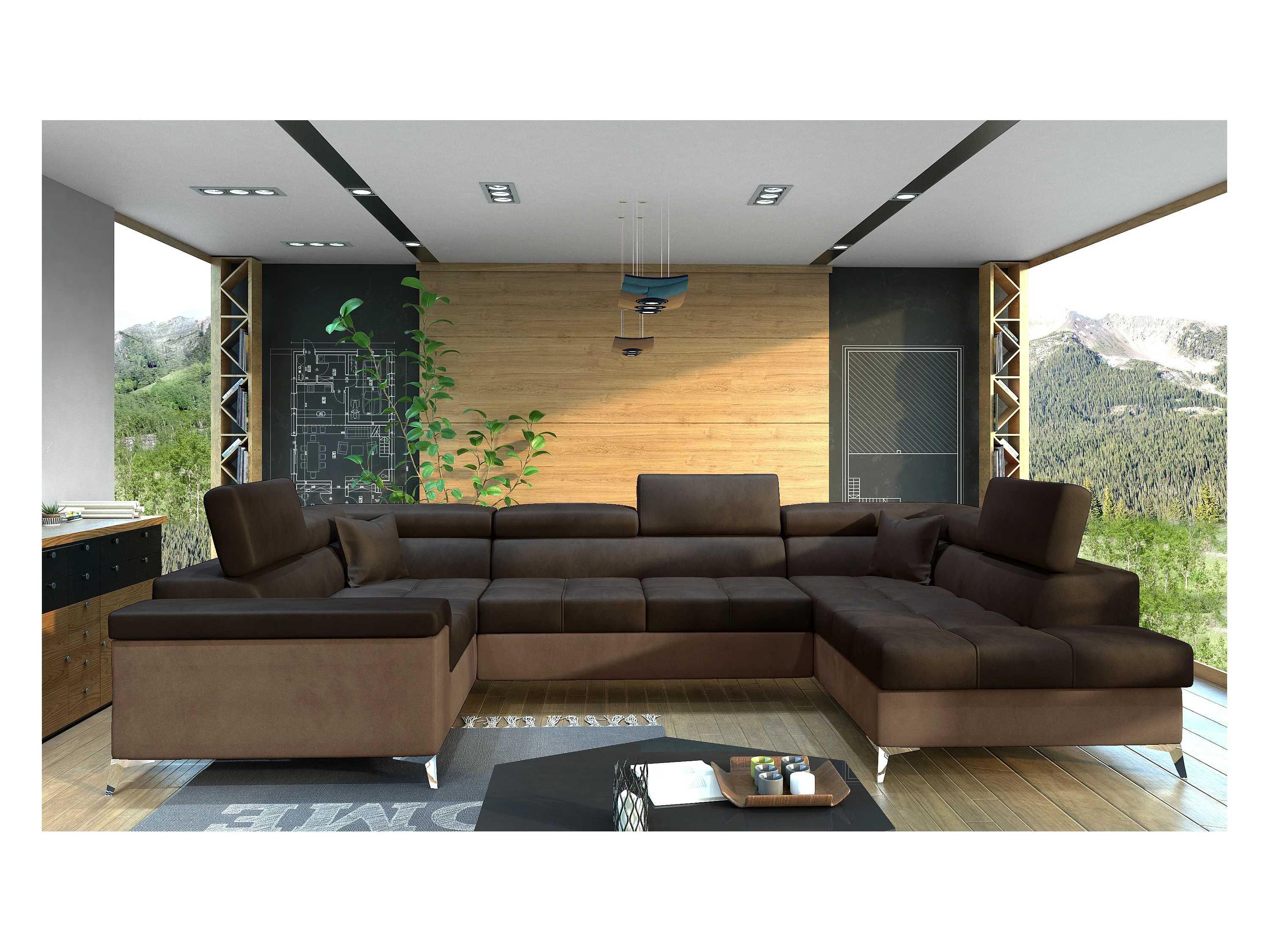 Canapé panoramique convertible velours marron foncé et marron clair avec coffre de rangement Triano 342cm-Coffre de rangement à droite