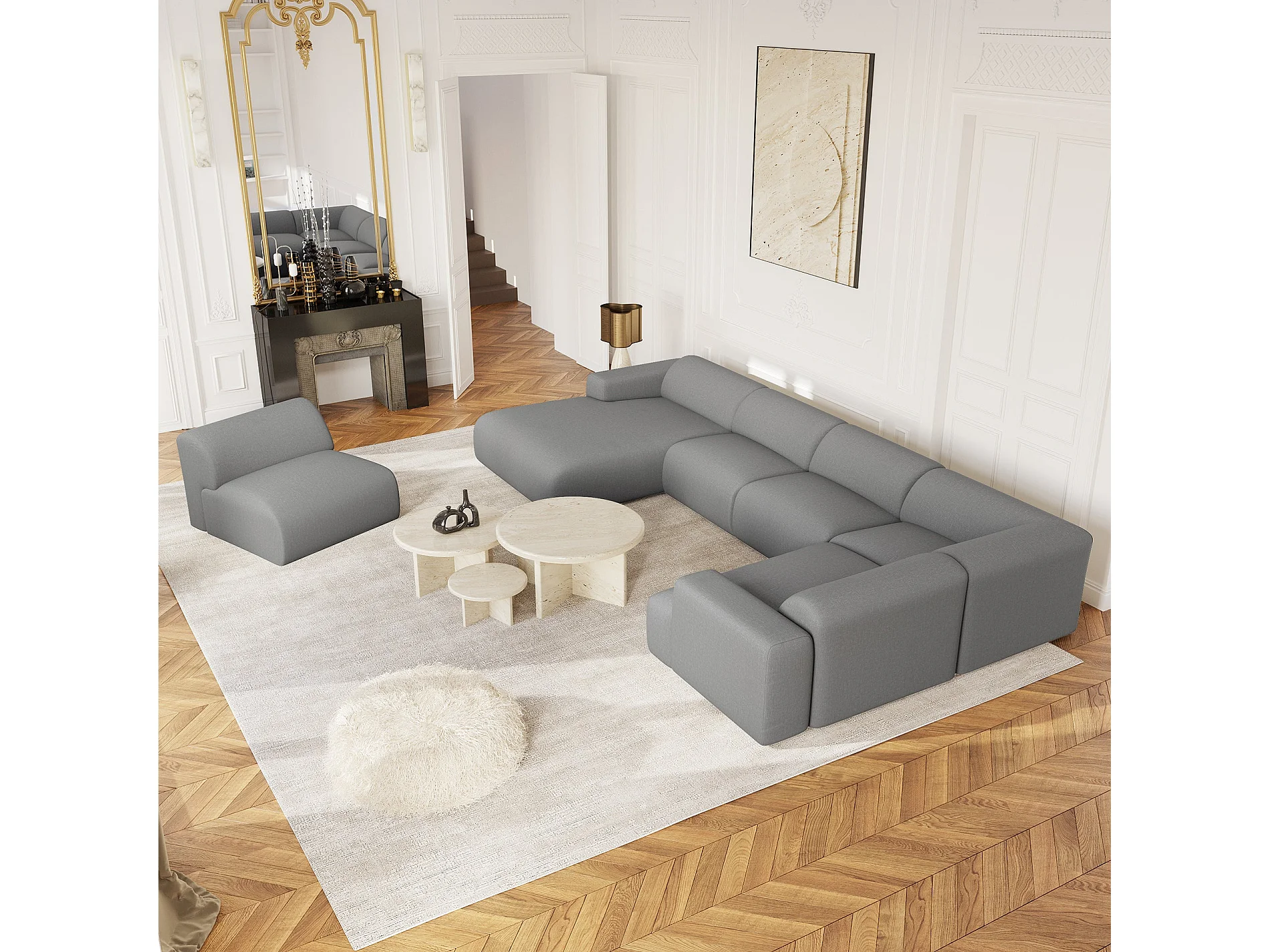 Canapé panoramique 7 places gauche tissu tramé gris clair MYRA