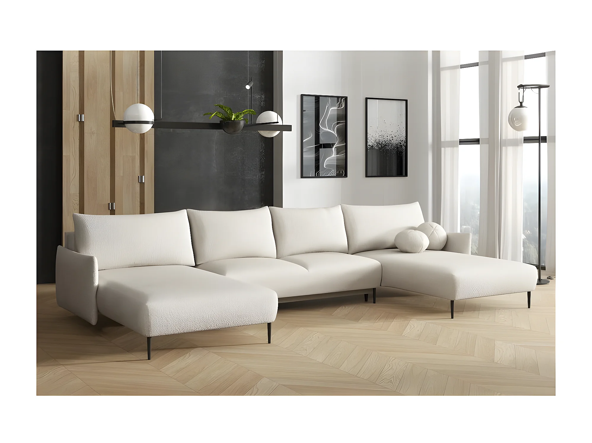 Canapé panoramique LAMBIA en U en tissu bouclette blanc cassé