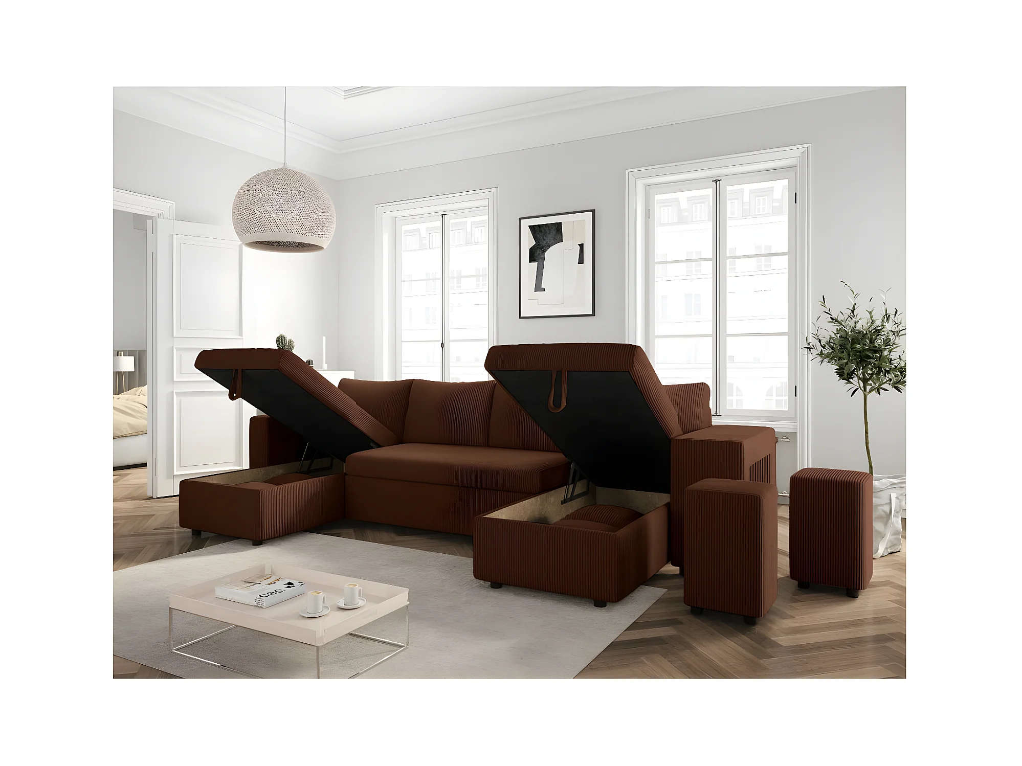 Canapé panoramique Oslo convertible avec 2 coffres, 2 poufs à droite en velours côtelé marron - L311 x P146 x H81cm - Loungitude