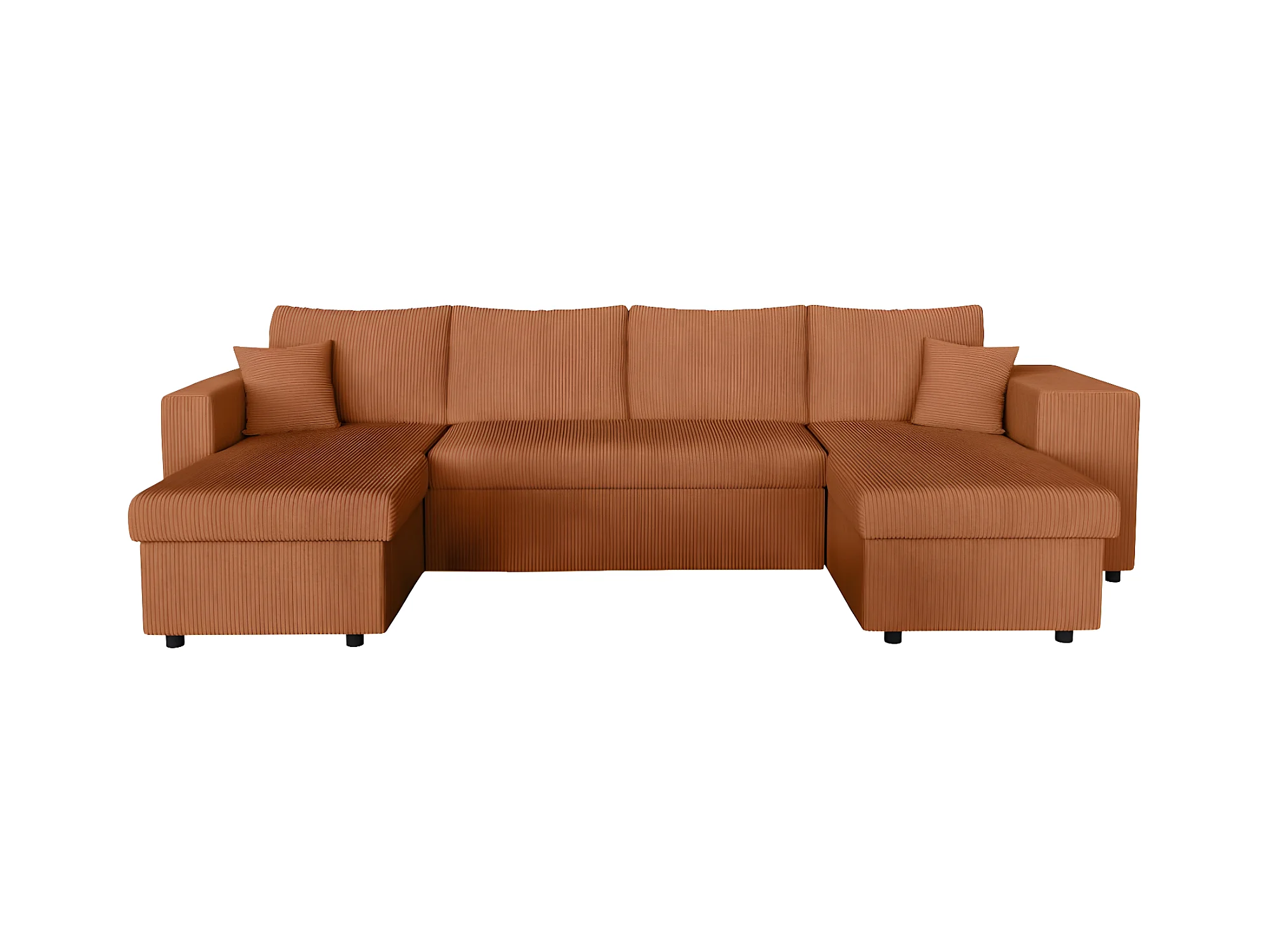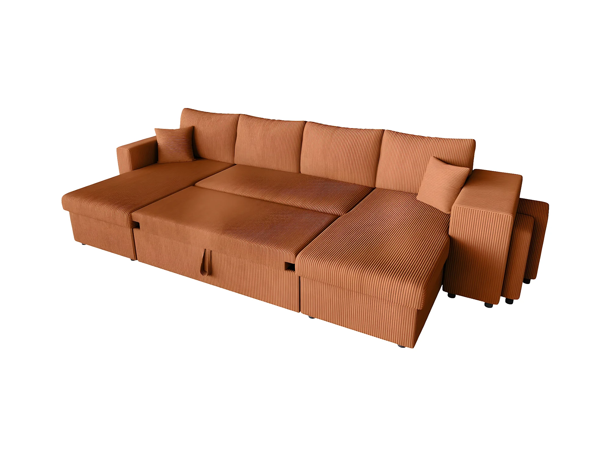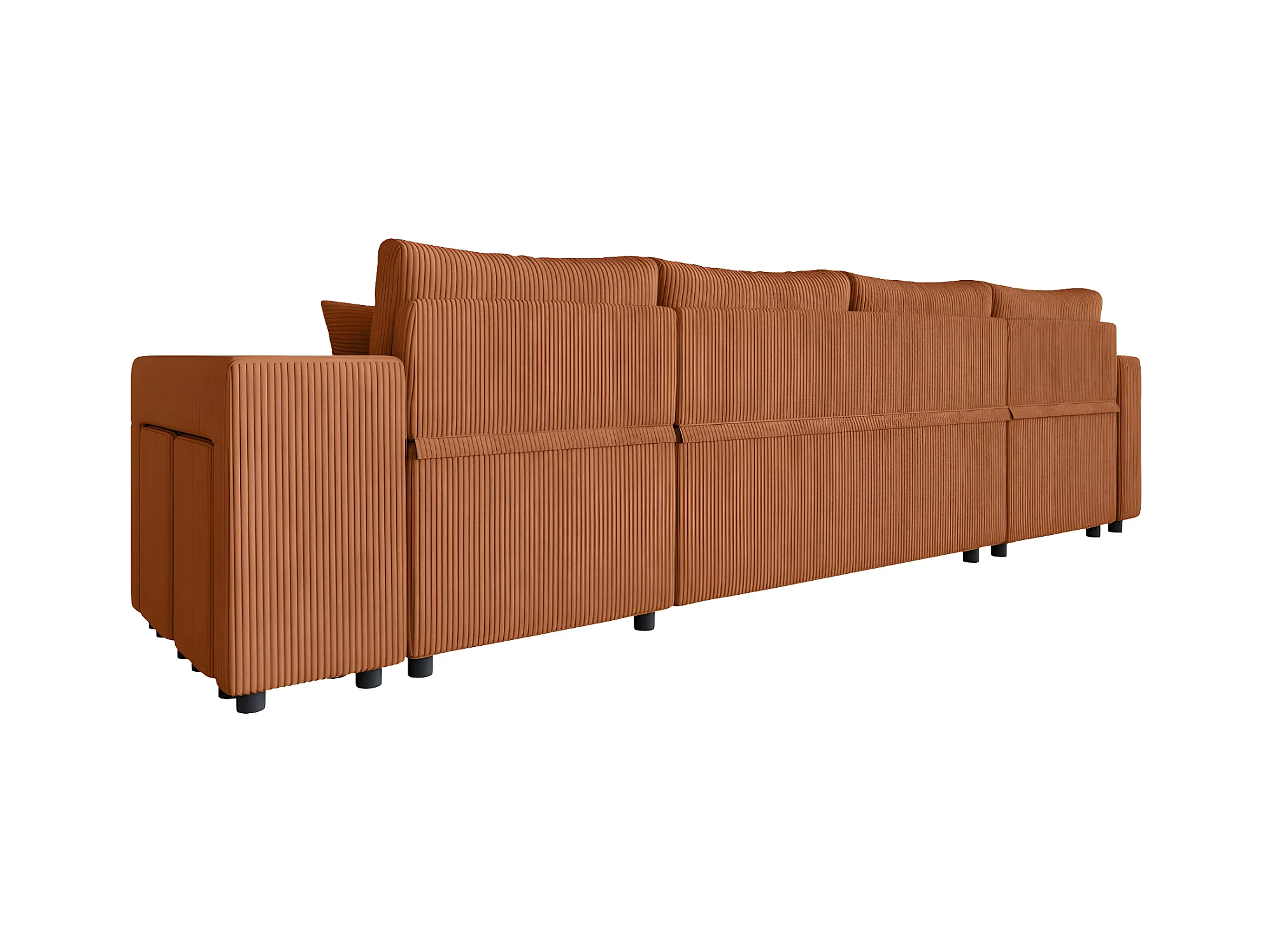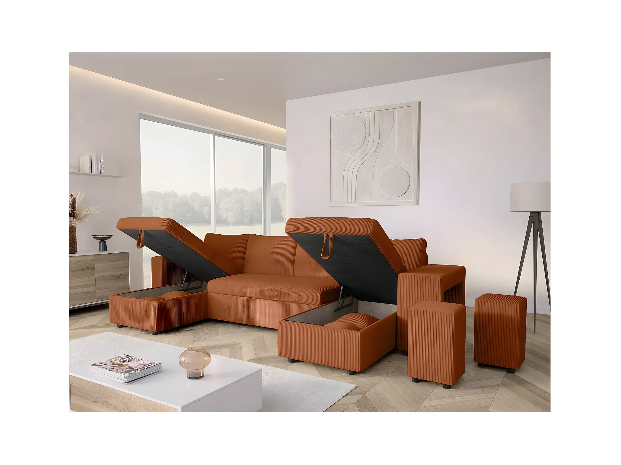 Canapé panoramique Oslo convertible avec 2 coffres, 2 poufs à droite en velours côtelé terracotta - L311 x P146 x H81cm - Loungitude
