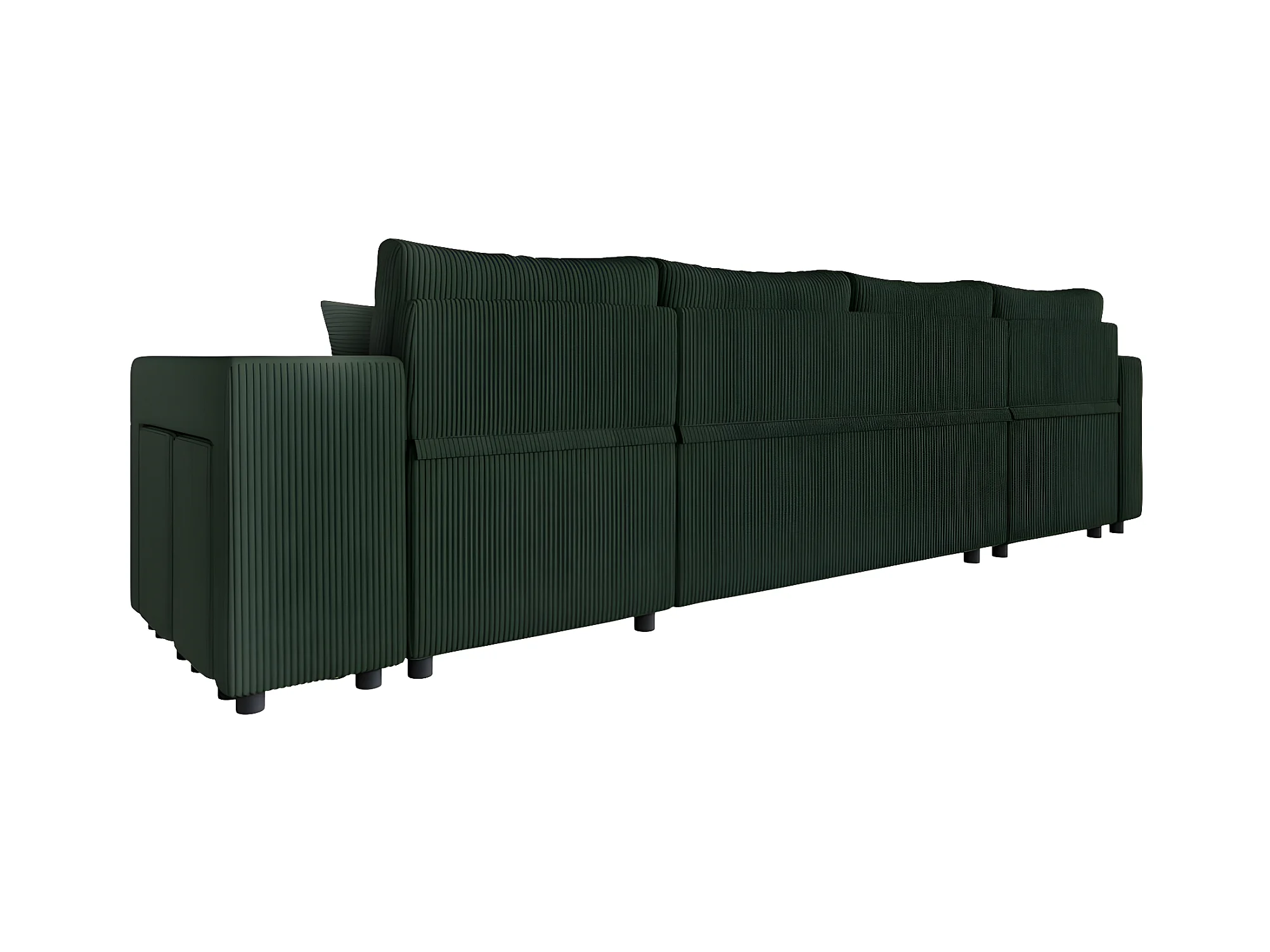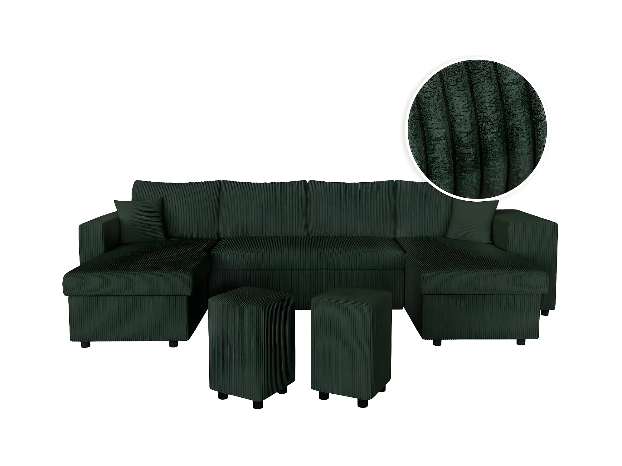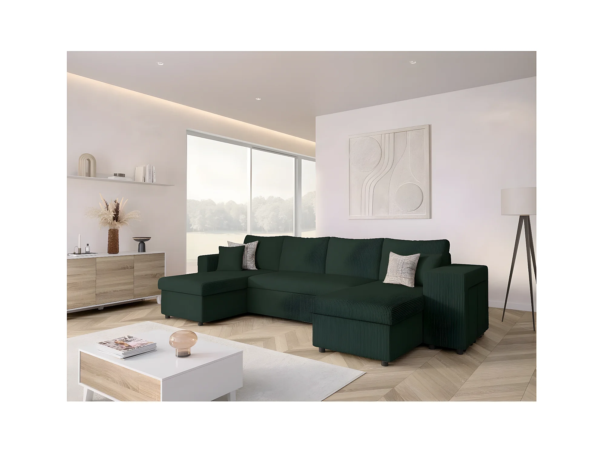 Canapé panoramique Oslo convertible avec 2 coffres, 2 poufs à droite en velours côtelé vert foncé - L311 x P146 x H81cm - Loungitude