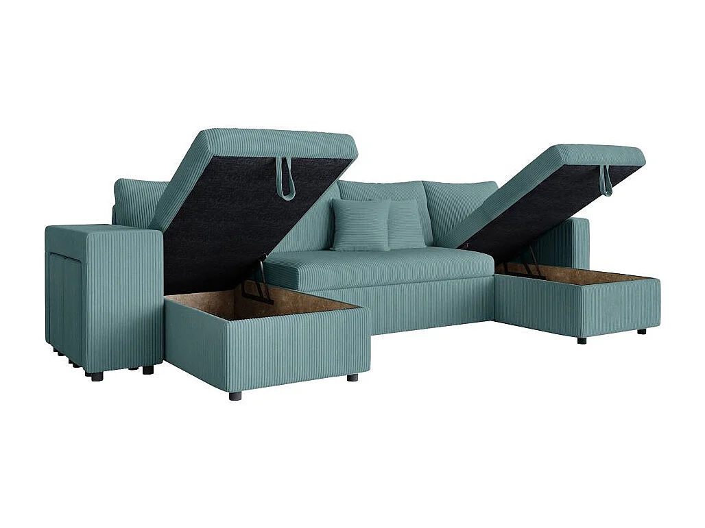 Canapé panoramique Oslo convertible avec 2 coffres, 2 poufs à gauche en velours côtelé bleu clair - L311 x P146 x H81cm - Loungitude