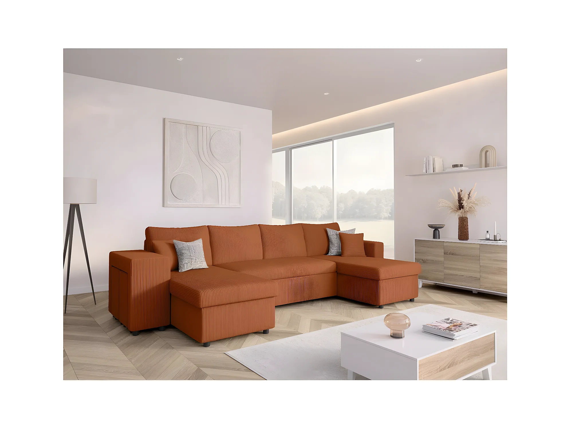 Canapé panoramique Oslo convertible avec 2 coffres, 2 poufs à gauche en velours côtelé terracotta - L311 x P146 x H81cm - Loungitude