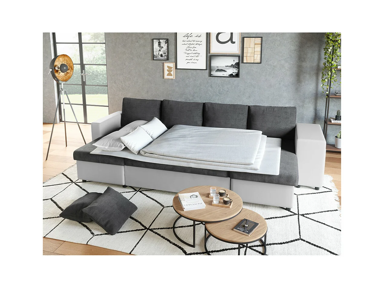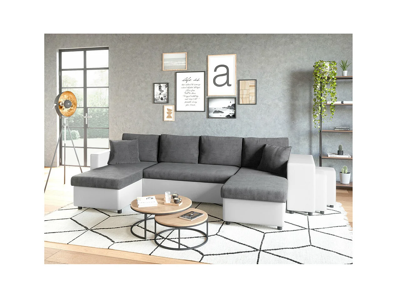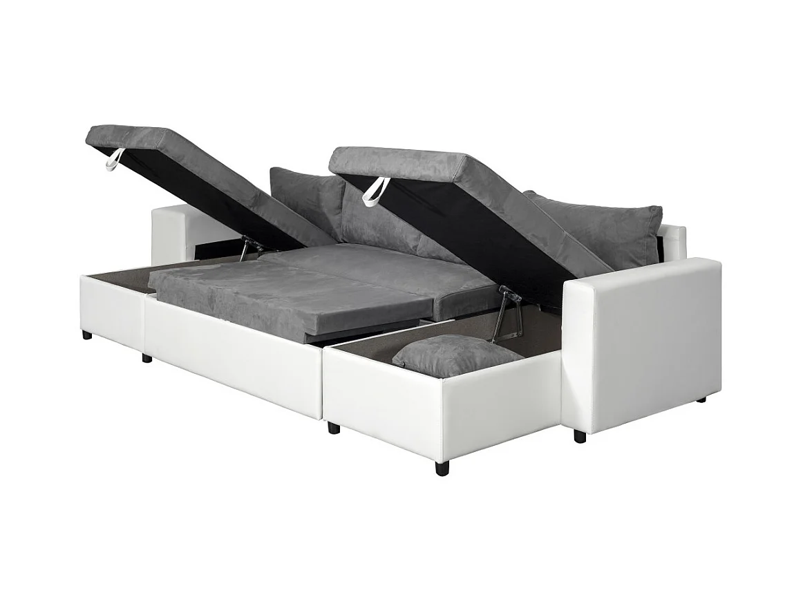 Canapé panoramique Oslo convertible avec coffres, poufs à droite - Simili/Microfibre - Blanc/Gris - L311 x P146 x H81cm - Loungitude